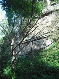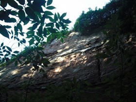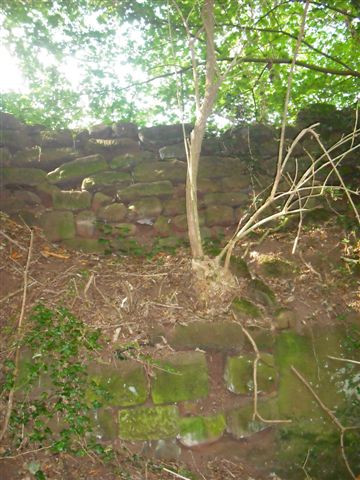 The most strongly defended part of the castle was the north western ward. Around the top of this area are the remains of a curtain wall, now largely destroyed but standing up to 1m high. The sandstone footings of a circular mural tower to the north also survive. To the east, a substantial part of the cliff face has been consolidated by a sandstone retaining wall, of probable medieval date. Within the ward low earthworks and vertical rock-cut faces indicate the positions of rectangular buildings. At the northern end of the ward a narrow postern gateway, associated with a flight of steps, gave direct access to the lower part of the sandstone ridge to the north. Downslope, additional protection was provided by a rock-cut ditch, 8m wide, together with a counterscarp bank, also about 8m wide. (Scheduling Report)