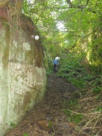 The main access into this central area from the south would have been by means of a bridge or causeway across the ditch that separates the wards. The middle section of the ditch is less deep, and there is a low bank, about 6m wide, to the north. Flights of stone steps, of 18th or 19th century date, continue to provide access between these areas. The northern extent of the northern central ward is defined by a ditch, up to 12m wide, with a deep rock-cut end to the east. The ditch is flanked by a low broad outer bank, between 12m and 15m wide. A stone wall and steps, constructed on the southern side of ditch, appear to be of 18th or 19th century date.