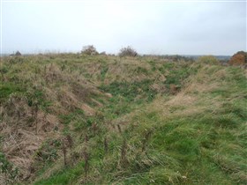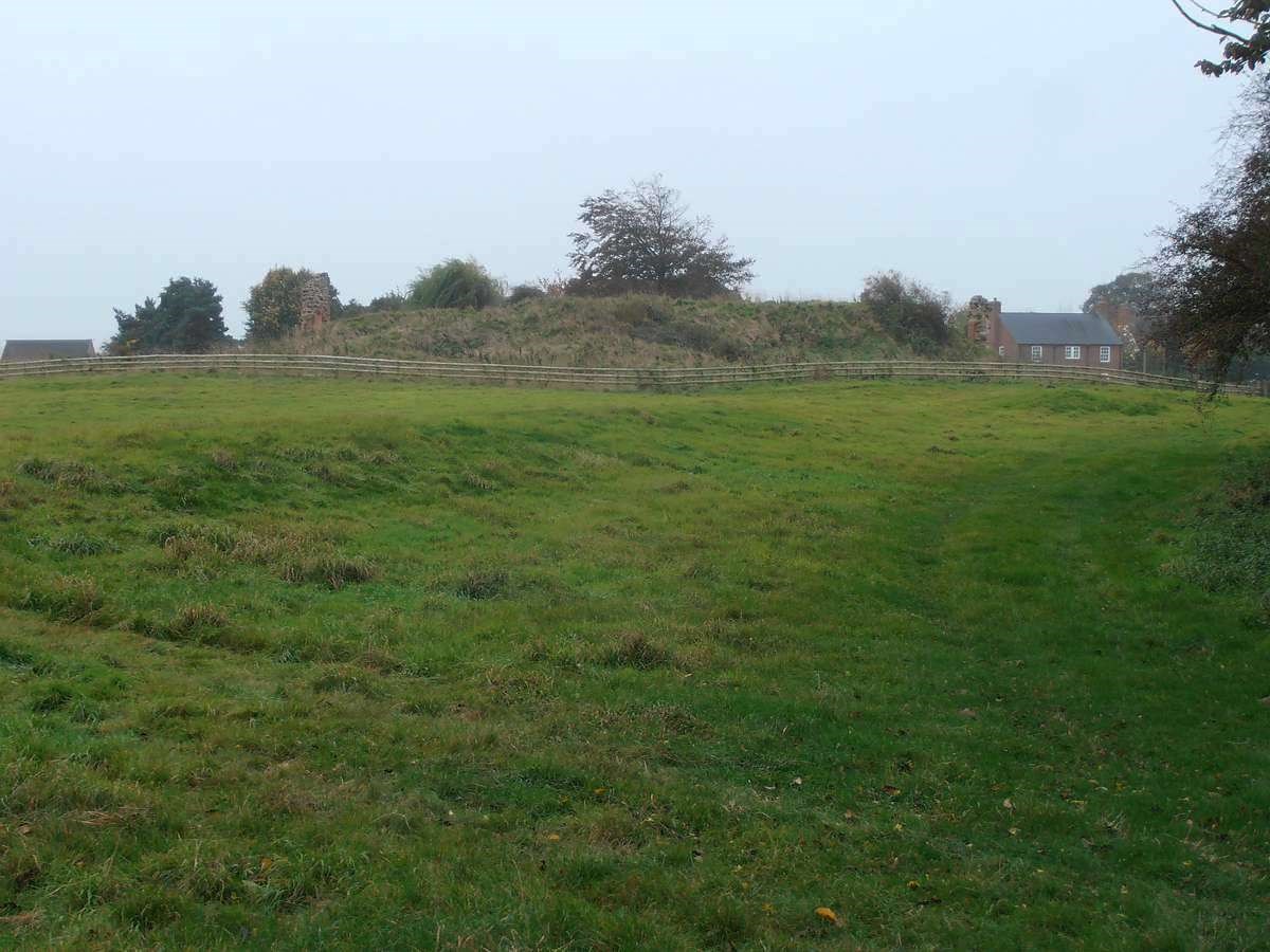 The monument includes Shrawardine castle, a shell keep castle with the remains of a stone keep, motte, three baileys and associated settlement earthworks situated on the north bank of the River Severn nine miles west of Shrewsbury. The castle is sited in an elevated position overlooking the river to control a crossing point and, with Little Shrawardine castle 800m west (the subject of a separate scheduling), is one of two castles designed to defend both sides of the ford. The fragmentary standing remains of the shell keep are Listed Grade II. At the time of the Domesday survey Shrawardine formed part of the lands of Sheriff Rainald de Bailleul, Sheriff of Shropshire. The name Shrawardine is believed by some authorities to derive from "Shire-reeve-weoden", meaning the defensive enclosure of the sheriff. Sometime after the Conquest Shrawardine passed into the hands of the Fitzalan lordship of Oswestry and it is believed that the present castle was founded at this time by order of Henry I. The first written reference to the castle occurs in 1165 when Philip Helgot wrote acknowledging service of the castle guard to the Crown. The castle was used by Henry II during his campaigns against the Welsh in 1165-6 and royal expenditure for building works on the castle is recorded through the years 1171 to 1214. The castle was attacked and its defences destroyed in a Welsh raid led by Prince Llewellyn the Great in the following year, 1215. The king ordered the sheriff to refortify the castle in 1220, however the following year, 1221, the service owed to the Crown by the tenants of Shrawardine was discontinued and transferred to Montgomery Castle. By 1240 the castle had been returned into the hands of the Fitzalan earls of Arundel who rebuilt the castle and renamed it Castle Isabel. The Fitzalans held the castle and manor until late in the 16th century when it was sold to Sir Thomas Bromley, Lord High Chancellor of England. The castle subsequently became the principal residence of his son and remained in the hands of the Bromley family until the 18th century. During the Civil War the castle was garrisoned for the king by William Vaughan and in 1645 the castle was besieged by Parliamentarian forces. During this siege the castle garrison demolished parts of the church to the west of the castle and most of the village in the vicinity of the castle to improve the castle defences. However after only five days of siege the castle was surrendered to the Parliamentarians. The Parliamentarian force held the castle for a short time only before retreating to Shrewsbury. During this time they demolished part of the castle, transporting the materials to Shrewsbury to repair and strengthen the town defences. On leaving they fired the timber parts of the castle so ensuring that it would no longer function as a fortification. Today the castle includes the remains of a motte and a shell keep at the centre of an extensive earthwork complex. The keep is represented by the fragmentary remains of two partly buried undercroft arches and some fragments of walling. The walling is built of squared sandstone blocks and is battered (inwardly sloping) in the lower courses. The substantial nature of the fragments that survive suggest that, when intact, the keep was a powerful fortification. The castle mound, or motte, is irregular in plan having been disturbed by later stone robbing. However it remains a substantial mound with overall dimensions of 50m east to west by 30m north to south standing up to 5m high on its west side, 3.1m high elsewhere. Each face of the mound has been cut into, forming a series of concave quarry hollows. At the south west and south east corners are roughly semicircular mounds which may represent the sites of corner towers. On its north east side the mound falls to a flat platform which extends from the motte to the bailey ditch; this may indicate the site of a large building. To the immediate north and east of the motte are the remains of the inner bailey enclosure. It is roughly rectangular in plan with maximum dimensions of 90m north east to south west by 50m north west to south east. The bailey is bounded along its northern side by a scarp 0.6m high with an outer ditch 0.5m deep. Around the east side it is bounded by a well defined scarp up to 2m high which curves around towards the west at its southern end before fading out. The inner bailey may have always been open to the small outer bailey which lies along this south side. Although the surviving visible earthworks of this bailey or enclosure are fragmentary, its plan can be traced as a roughly rectangular enclosure with dimensions of approximately 50m north west to south east by 40m transversely. The east side of the bailey remains visible as a low scarp up to 0.6m high running for approximately 50m on a north to south alignment, with evidence of an outer ditch visible as a slight hollow 0.2m deep. An exploratory trench was cut across this feature as part of an archaeological evaluation carried out by Shropshire Leisure Services Archaeological Unit (SLSAU) early in 1994. The excavation revealed that the defences comprised a bank surmounted by a timber palisade separated from an outer ditch by a berm 1.8m wide. The ditch itself was found to survive as a buried feature 3.6m wide and 1.9m deep, with a steep v-shaped profile. The southern end of the bailey is no longer visible as a surface feature, however the west side remains visible as a well defined scarp up to 1.2m high which curves northwards towards the motte. During the 1994 excavations a two-chambered pottery kiln of 12th to 13th century date was identified immediately outside the bailey. It is the first kiln of its type to be discovered in Shropshire and is included within the scheduling. On high ground to the north east of the motte are the remains of a second and larger outer bailey with internal dimensions of approximately 80m north to south by 64m east to west. It is separated from the 