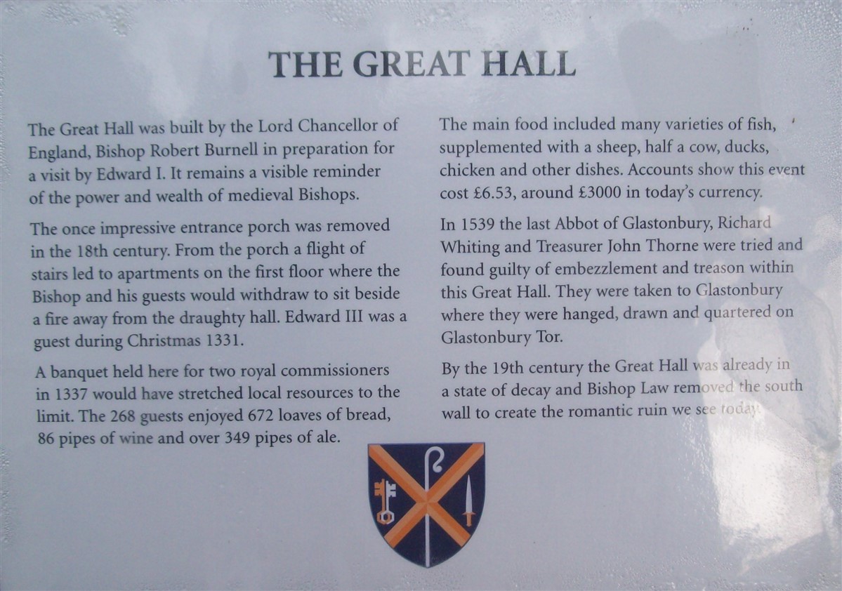 Wall with corner towers and gatehouse, surrounded by moat. c1341 (date of license to Crenellate) by Bishop Ralph of Shrewsbury. Local stone rubble with ashlar copings and other dressings, average 5m high. PLAN: irregular, with 6 bastion towers, that to the NW, sometimes referred to as the prison, has a small but lofty room, with apsidal W end, and looks more like a small chapel; it has stone tablets with the decalogue set high on the walls
