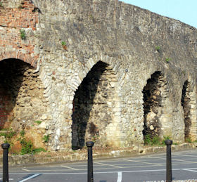 Late C14 remains of the drum towers flanking the principal gateway to Southampton's Mediaeval Castle. These twin drum towers were added to the defensive bailey wall of the Royal Castle. Stone rubble walls to a height of nearly 20 ft with several arches, some now blocked. (Listed Building Report)