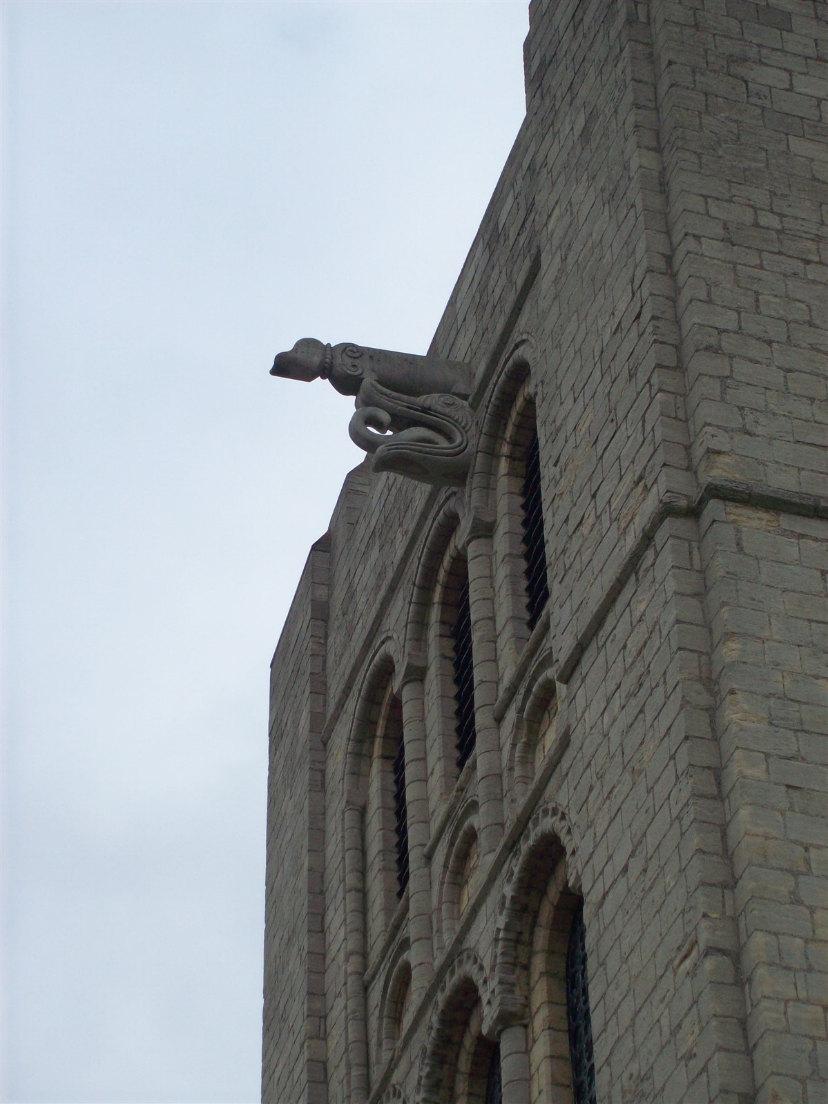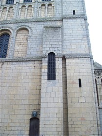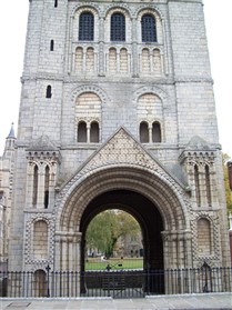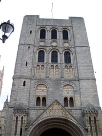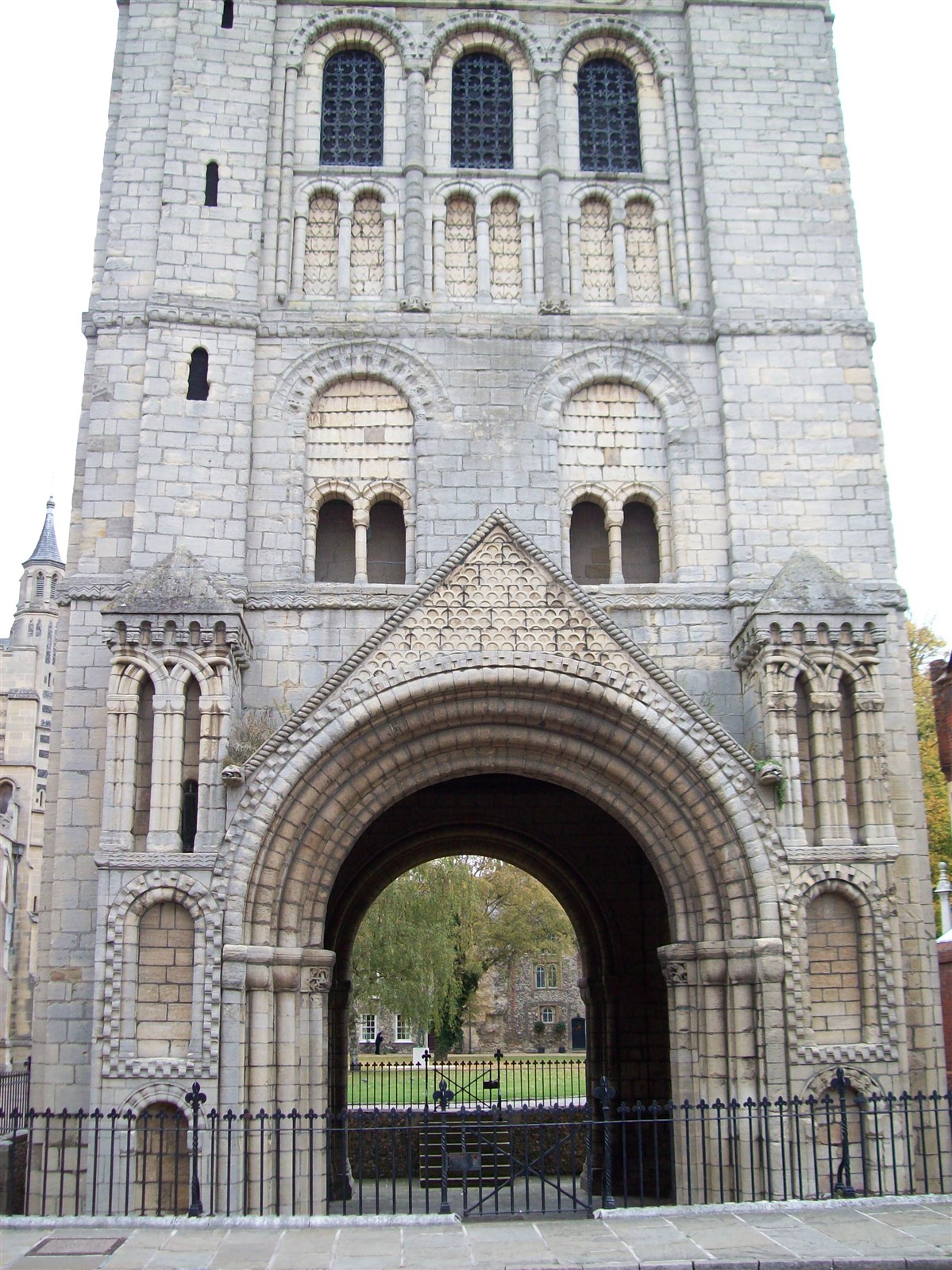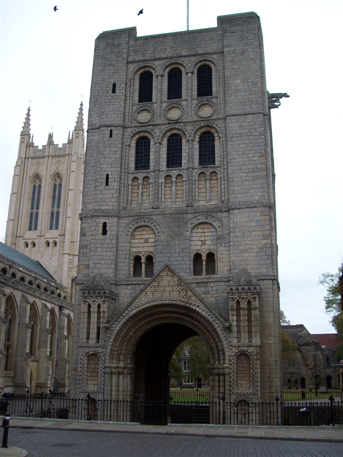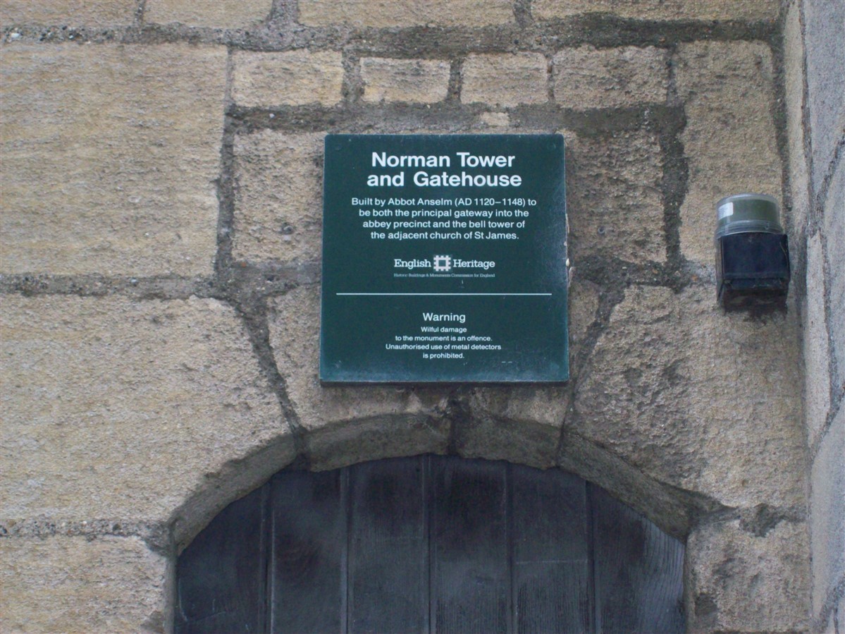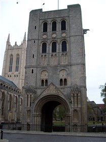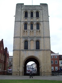 Norman Tower Monastic gate, now used as a belfry for the Cathedral Church of St James. Built under Abbot Anselm between 1120 and 1148; Romanesque. Restored by LN Cottingham in 1846/7. Barnack stone. Rectangular, in 4 stages, with the base now well below the present ground level. Richly ornamented. A large, unvaulted gateway has heavy block capitals to the columns and large roll-mouldings. The west face is the most ornate, with a sculptured inner order and the arch projecting like a porch with a gable and fishscale decoration. To each side of the gateway are 2 tiers of niches with billet decoration; short buttresses above have intersecting arches and pyramid roofs. The 2nd stage has 2 tall blank arches with small 2-light windows within them. The 3rd and 4th stages each have 3 deep window openings, divided by colonnettes and hood-moulds with billet decoration: below the 3rd stage openings are paired blank arches; below the 4th stage blank roundels. The details of the 3 upper stages on the west are repeated on each of the other faces. (Listing Report)