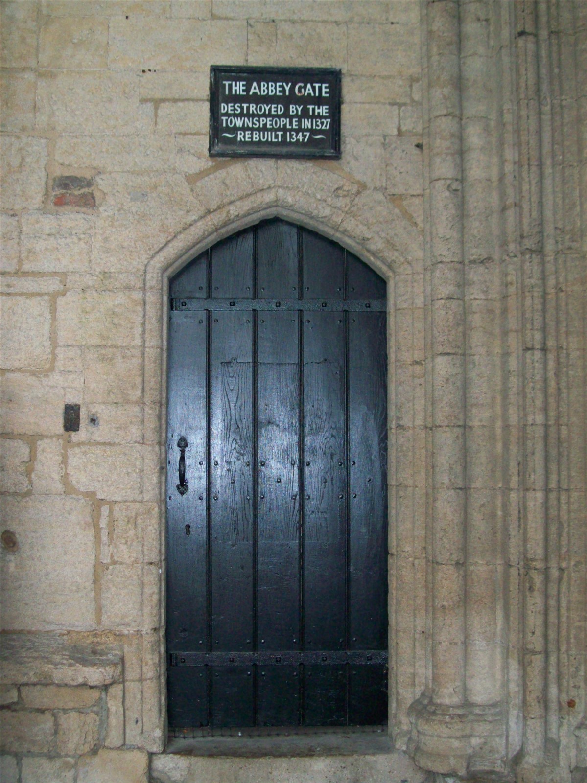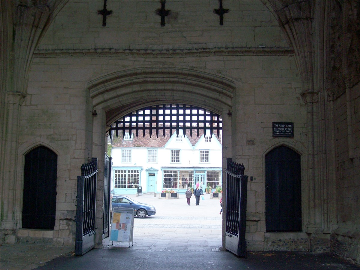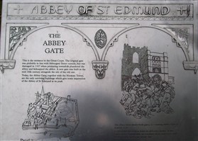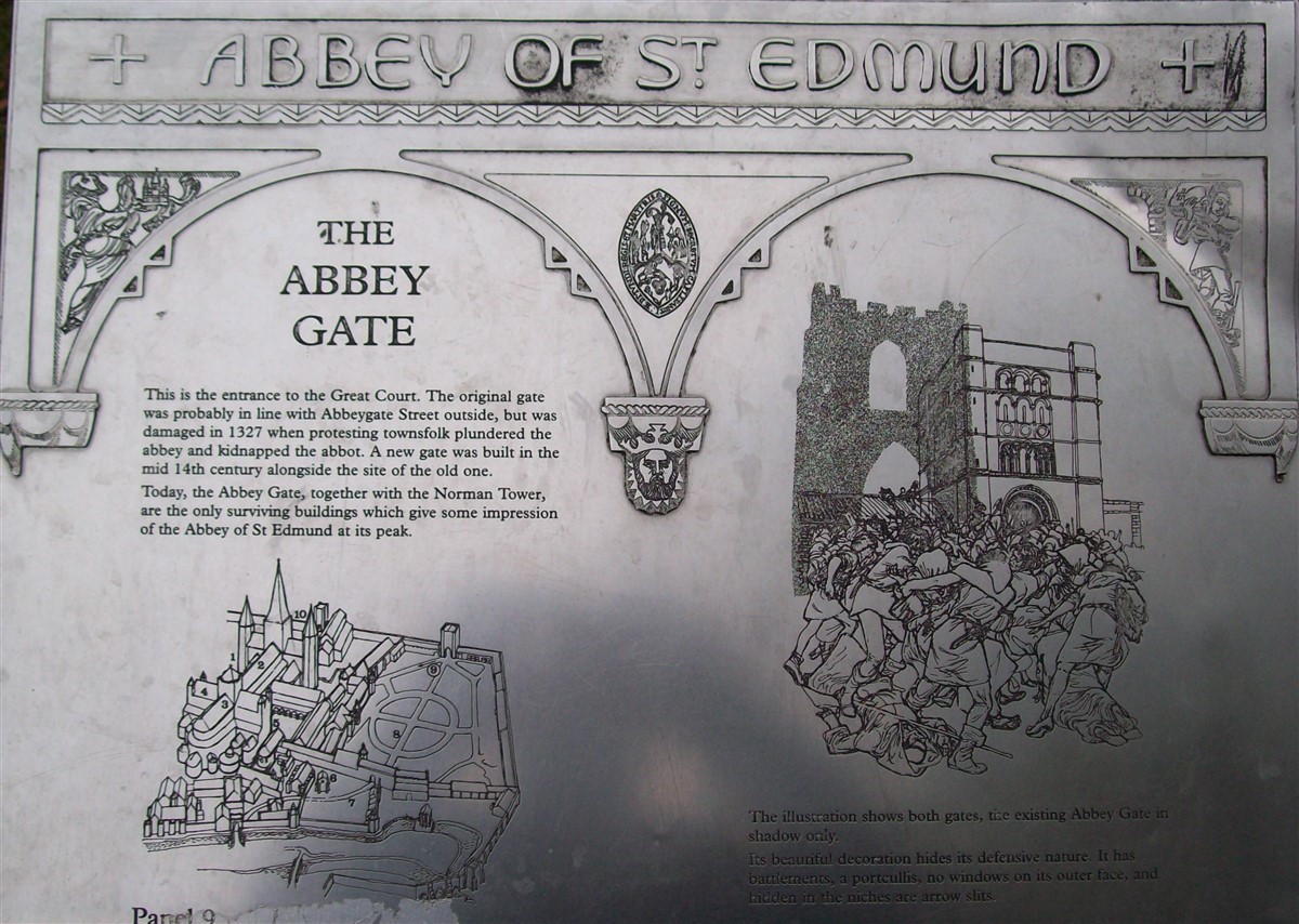 C14 Great Gate and C12 St James Gate of abbey precinct survive but although impressive probably never meant to be defensive. The Abbey was surrounded by a precinct wall, and some slight sections of the precinct wall do survive. The great gate of the Abbey of St Edmund was begun after the riots of 1327 but before 1346; completed after 1353. Built of Barnack stone. Much is made of the defensive features of this tower, but cannot have been seriously defensive since the rest of precinct not really defensible. The rioters of 1327 deliberately directed their attack at the gatehouse of the Abbey. They could have easily have broken the precinct wall but the Gatehouse was probably the place where the Abbey took rents and possibly where deeds and other legal documents relating to property were housed.