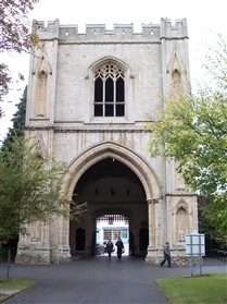 The Abbey Gate at Bury St Edmunds Abbey was built between 1327 and 1353. Built from Barnack stone and two storeys high, the west front of the gate is particularly ornate. The entrance is via a large archway, above which are three gabled niches and a curved gable. Either side of the archway are buttresses with gabled niches in three tiers and to the upper storey are five tall blank niches. The taller, centre niche has a crocketed gable which is flanked by two circles containing six-pointed stars. (Listing Report)