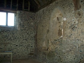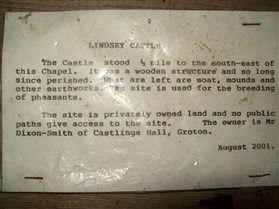 Lindsey Castle, also known as Boar Hills and covering an area of about 5 acres, is unusual as the mound, 12ft high, lies within the south end of the bailey around which is a horse-shoe shaped moat. The north end of the court is defended partly by the moat and partly by low lying marsh, and a high rampart, formed of soil thrown up when the moat was made, lies within the court. At some later period additional fortifications were added on the south side which include two triangular-shaped baileys protected by ramparts and a moat. In the northern and larger one is a small mound forming part of the escarpment (PSIAH, 1908). The feature comprises a large low motte strongly defended on all sides particularly to the southeast where the earthworks are carried up the adjacent hillside. The site is divided by a stream entering from the south which also fed the pond to the north, now a marshy area. No traces of building are to be seen either on the motte or in the bailey (PastScape–ref. Field Investigators Comments-F1 BHS 13-JAN-70).