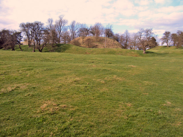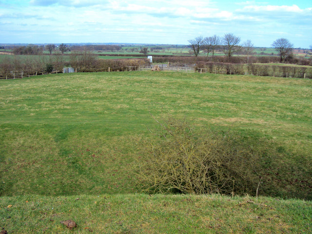 Perfect little earthwork of the moated mount and court type (eg motte and bailey) in an excellent high position. The mound is conical: 9 M high, 43/46 M diam at base and 15.2 M diam at top. Encircling the mound is a ditch 9 M wide and 3.5 M deep. A courtyard lies to the S and SE defended by a ditch with a rampart on the inner side. rampart and ditch increase in size towards the mount itself. An entrance at SE is possibly original. To the N and E traces of a long rampart and ditch can be seen with water in part of the latter. No sign of masonry; the site therefore probably fell early into disuse. Constructed early C11 by Earl of Mellant or his son Robert Earl of Leicester. Remains of a ramp on SW facing slope of the motte. Slight infill at W junction of motte ditch and bailey ditch. (Warwickshire HER)