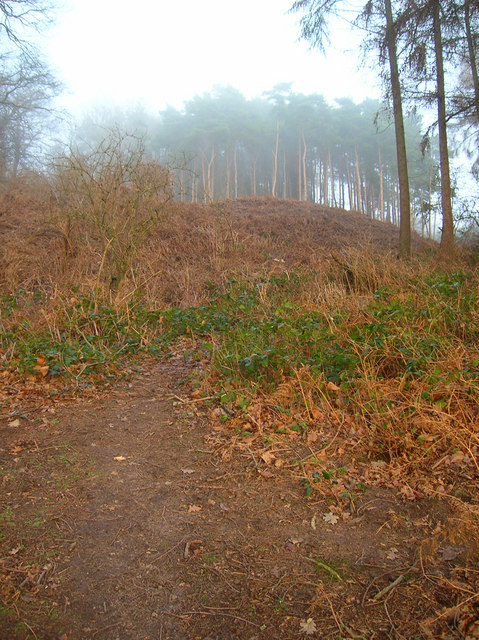 There is an original causewayed entrance in the SW side of the bailey close to the steep, natural slopes. A large sunken hollow occupying most of the internal area of the bailey, opens out through the slopes on the S side and may have been caused by natural erosion, the soil being soft sand, or by sand quarrying. The site is largely wooded and is in fairly good condition apart from minor mutilations and the quarrying mentioned above (Field Investigators Comments–F1 ASP 01-FEB-71). (PastScape)