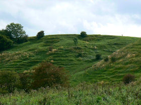 Enigmatic earthworks, previously identified as a motte and bailey castle with evidence of a settlement within the outer bailey. Now considered to be more probably of Iron Age origin, though with medieval and/or later elements. The 'motte', severely mutilated by quarrying, measures 52 metres in diameter by 3.2 metres high, and its ditch is 2.3 metres deep. The inner enclosure has a bank and ditch 3.4 metres high dividing it from the outer enclosure, with a causeway entrance. There is evidence of settlement, agricultural activity and later quarrying within the bailey. (PastScape)