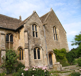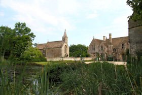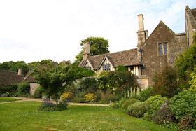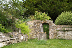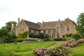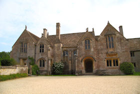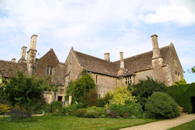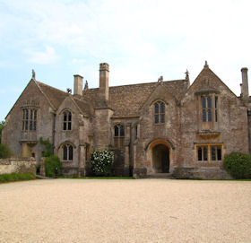 Great Chalfield Manor House was built by Thomas Tropenell in c. 1480, on the site of a ruined fortified house. Of the earlier building all that remains are the bases of the east and north curtain walls, the lower part of a circular tower at the north-east angle, and traces of a half round tower to the west near the bridge. Within the curtain at the north-east corner is the parish church of Great Chalfield. Tropenell's house was considerably altered about 1550; among the alterations was probably that of the long west wing for use as stables and servants' quarters. By 1837 a quadrangle of domestic offices had disappeared and other parts were in ruins, and in 1840 the building was adapted as a farmhouse. Between 1905 and 1912 the house was thoroughly restored under the supervision of (Sir) Harold Brakspear. The work included the rebuilding of the solar, the reconstruction of a 16th-century stone chimney-piece from original fragments recovered from a rockery, and the insertion of a staircase in the east wing. The principal front and entrance are on the north and are approached by a bridge over a moat and by a gateway at the northern end of the west wing. The front remains much as it originally was, with the hall in the centre, two projecting gabled wings with oriel windows, and, on the inner side of each, lesser gables, the western forming the porch. The south front, which originally had a southward extension, has been partly reconstructed to the original pattern, including a timber-framed portion on the west. On the apexes of the gables are carved the figures of armed knights. Inside the house are many 15th- and 16th-century features, including the original main timbers of the hall bearing the Tropenell motto, stone groined ceilings with the Tropenell arms, and panelling, chimney-pieces and decorated plaster-work dating from the mid-16th century. (In 1837 plans were made by Sir Harry Burrard Neale for the restoration of Chalfield manor. T. L. Walker, a pupil of A