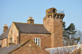 Brimstage Hall and Tower, Grade II House. Tower c.1398, probably a tower house, later possibly C16 extensions and C19 north wing. Stone with slate roof. 3-stage tower has slot windows, corbelled machicolations and early C19 iron railings and stair head. Elliptical-headed stair entrance to north and 2 windows of 2 lights with single-chamfered mullions. Ground floor room has 2-bay rib vault on half and quarter octagonal shafts, corbel in south-west angle said to represent lion (from Domville arms) or Cheshire cat. One of vault bosses has 3 twined fish (possible Hulse arms or symbol of Trinity). North-east spiral stair case has garderobe chambers, that to 3rd stage has original stone latrine, that to 2nd stage has C19 mahogany-cased water closet. West wall shows signs of demolished wing; some double-chamfered-mullioned windows. C19 wing has east facade of 3 bays, 1st gabled projecting bay, re-entrant porch bay, casement windows, those to 3rd bay show signs of original mullioned windows to either side, projecting bay has canted bay window. Rear has wing and some sash windows. Large stack to left return of projecting bay, possibly C16, interior stone fireplace. Upper part of staircase has column balusters. Ground floor room of tower believed to be chapel. (PastScape–ref. listing description)