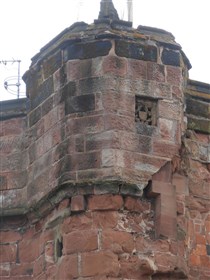 Caldwall Castle stands on the low-lying land at the south end of the town. The site is bounded on the north-east and south-east by the Stour, which here takes a small bend. Of the mediaeval building only one octagonal tower remains, but this was added to in the latter part of the 17th century by the erection of a three-story brick building on the north-west. Beyond this a low castellated extension was built in the 19th century, containing a few offices. The original tower is built of red sandstone, is three stories high with an embattled parapet, and appears to have been erected early in the 15th century. The stonework on the outside is much decayed and greatly overgrown with ivy, while the interior of the two upper floors has been considerably modernized