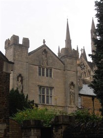 Originally the Abbot's House. Present building mainly Victorian Gothic, but features of various dates survive. 2 mid C13 undercrofts survive. The larger is of 2 naves divided by circular piers with moulded capitals. Smaller room also has rib vaulting, the east window being an original slit lancet, Stepped butress. Solar wing at right anglo to the Hall wing with 2 late perpendicular oriel windows facing north, 1 with the rebus of Abbot Kirkton, the room being known as Heaven's Gate Chamber. Triple shaft on a corbel late C12, is a survival of the Monk's kitchen. (Listed Building Report - Bishops Palace)