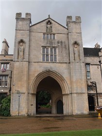 Mainly built circa 1220 by Robert of Lindsay. Square turrets project at quoins, having crenellated parapets. 3 storey height. Each of the 2 turrets has a trefoil headed niche containing a statue of an abbot and prior, one of which may represent Godfrey of Crowland. Centre is gabled, containing a statue of King Edward, seated, above windows of 4 and 8 lights, strings between storeys. Centre archway has 4 orders of colonnettes with moulded capitals. Inside tyre archway, the main chamber has blank arcading and quadripartite vaulting. The room above the entrance, known as the Knights' Chamber, was formerly decorated with pictures of the knights who met there. The windows have been altered in Jacobean style. (Listed Building Report - Bishop's Gate)