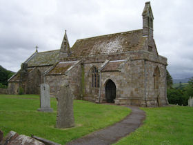 Mostly late C14 incorporating part of the plinth of the earlier church. Squared and coursed limestone with nave parapet, all on chamfered plinth. Steeply-pitched red sandstone slate nave roof and graduated greenslate chancel roof with coped gable and cross finial. 2-bay nave with north and south porches, transept chapels and west twin bellcote, moved to its present position in 1812; 3-bay chancel with north lean-to vestry. Pointed-arched lean-to stone porches. 3-light panel-tracery windows, that in west wall under 3-light cusped flat-headed windows; similar 2-light windows in transepts, all under hoodmoulds with carved-head label stops. Flattened hexagonal north-east stair turret under stone slate spire gives access to parapet walk which goes completely around nave, the bellcote set back to allow for the walkway. Chancel has south priest's doorway in pointed arch and 2-light cusped and panel-tracery windows, all under hoodmoulds with carved label stops. Similar east window. 2-light south window and vestry window with flat heads, the vestry window with cusps, both with hoods. Interior of nave has pointed stone barrel-vaulted roof with half-vaulted transepts. Projecting corbel stones were perhaps to support the centering over which the vault was built. West wall has upper corbelling to support parapet walk. Door beside chancel arch gives access to spiral stone staircase up to parapet walk and also gave access to rood screen; one of the supporting corbel stones for this is above the doorway. Piscinae in both transepts, that in south transept with ogee arch and also aumbry recesses. Receut C14 font of which only the carving under the bowl is original. Chancel has C19 open timber roof on C14 corbels. Late C18 and early C19 wall plaques. Piscina in south wall. Pointed-arched doorway to vestry. (Listed Building Report)