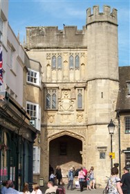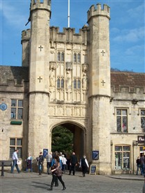 Gateway to Cathedral Green. c1450, built by Bishop Bekynton. Doulting ashlar stone, with lead roof. The upper floors communicate with and are used by the occupants of No.16 (qv). EXTERIOR: 3 storeys, single bay, exposed on west and north sides only. Plinth, moulded strings between floors and under battlemented parapet, octagonal south-west corner turret. West face has 4-centre arch with rosettes set in mouldings, carved spandrels with letter TB (for Thomas Bekynton) interwoven with foliage; first floor has two windows set slightly proud, a double-and a single-light, with cinquefoil cusping to ogee tracery under flat heads, and between them a carved angel figure bearing a coat of arms, further shields in cusped recesses under windows; second floor panelled, with two 2-light windows with blank underpanels, with worn statue niches between them and to either side. The north face has a plainer 4-centre arch with arched label, a corbelled panelled feature in the northwest corner at first floor level and a double-ogee arched statue recess to the left, otherwise the two upper floors rough-rendered and plain, with string and battlemented parapet, angled buttress to north-east corner, and rendered lean-to building set in front of the main east building. In the S wall are two doorways, one plain 4-centred, the other a late C18 pedimented elaborate lierne vault. INTERIOR: there is a single room at each upper level. The first floor has C17 panelling with pilasters, including panelling to seats in window embrasures, and a bolection-mould fireplace to the E. In the SE corner, behind a C17 door in a 4-centred arch is a recess, possibly a former garderobe. The spiral stair in the SW corner has stone treads to the lower flight, but wood treads to the upper flight. The upper room has a 2-bay arch-braced roof with wind-bracing. On the S side are very large moulded brackets or corbels, and a small cusped lancet