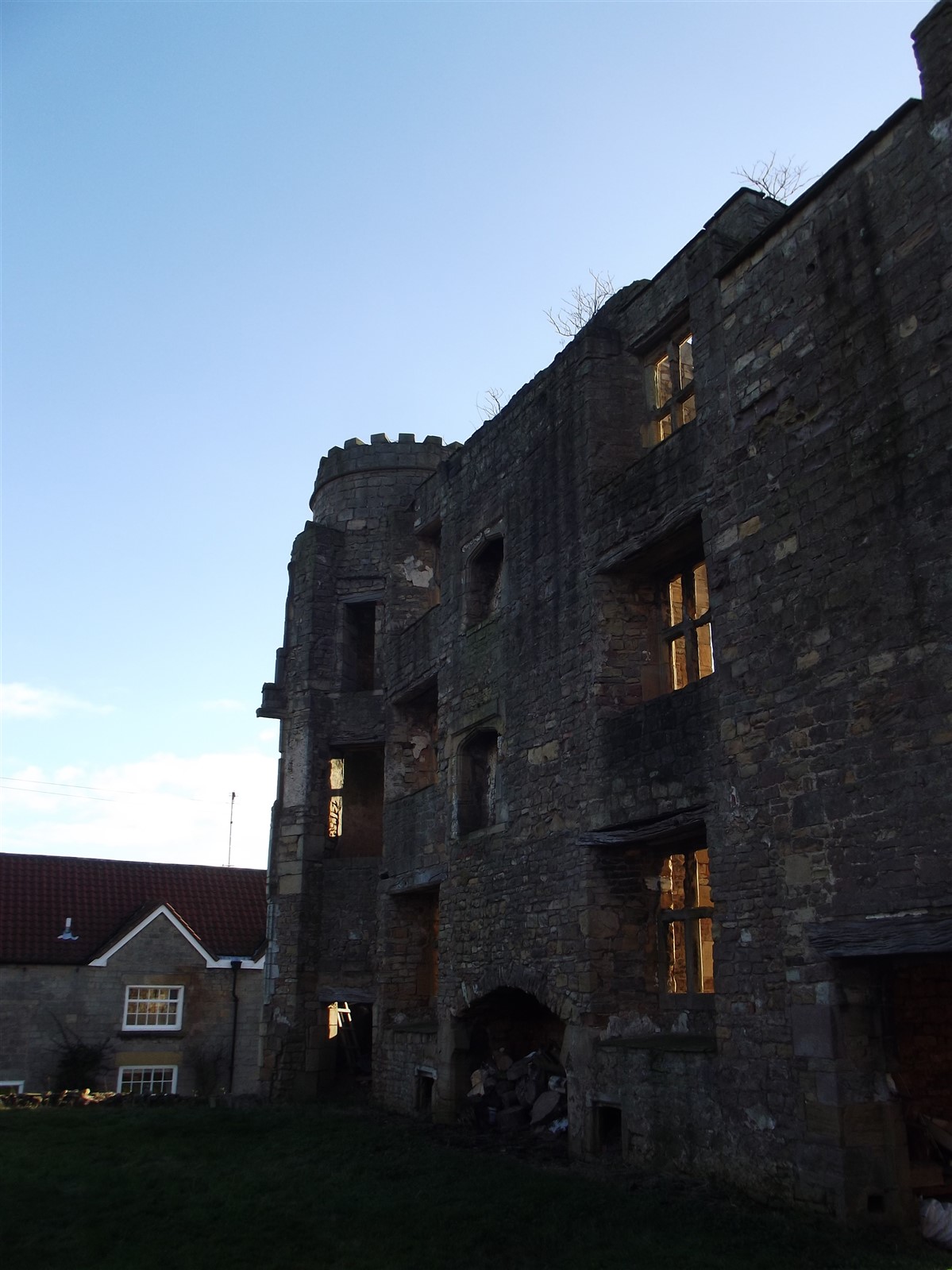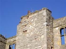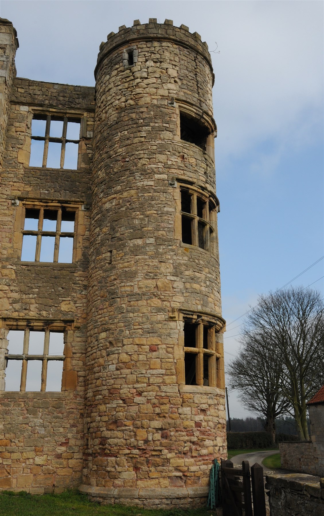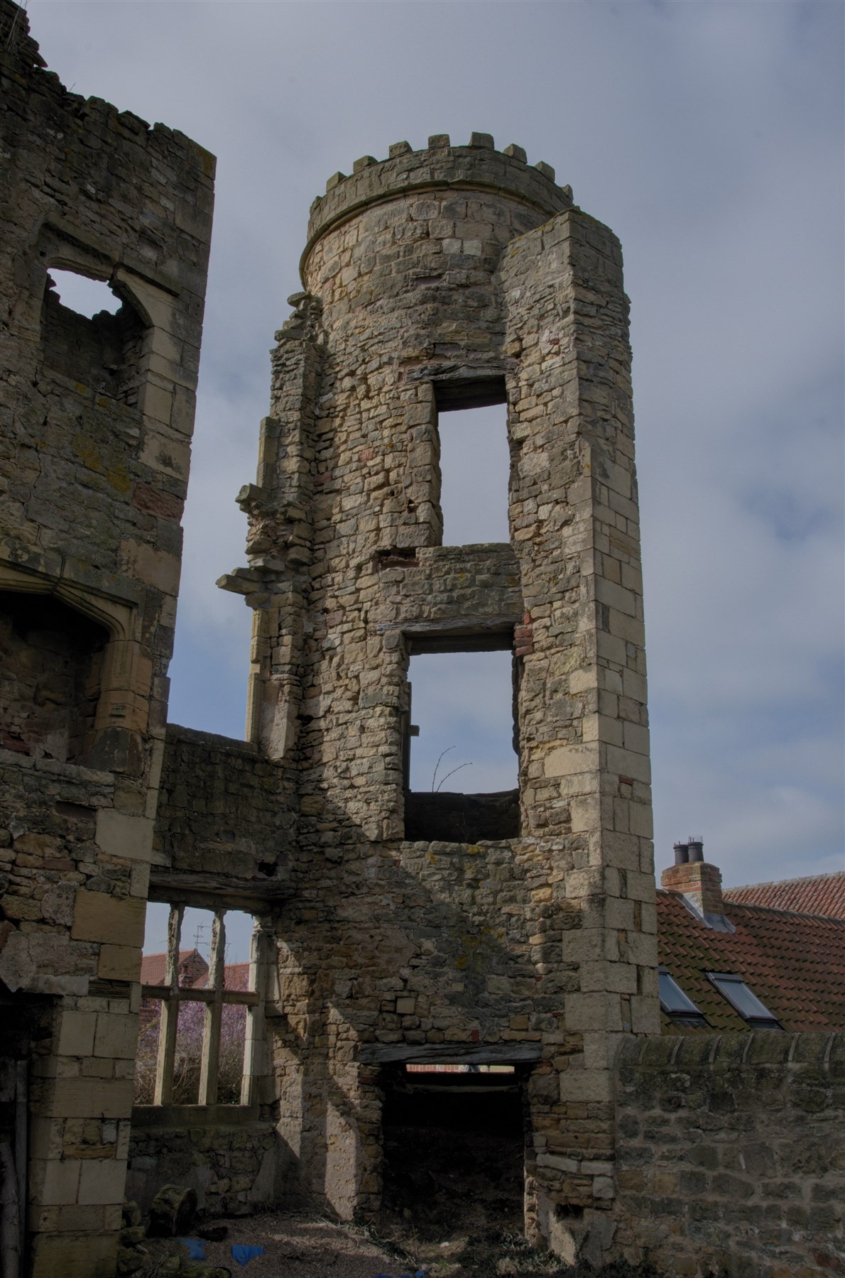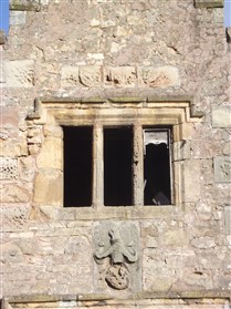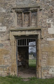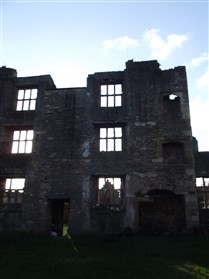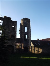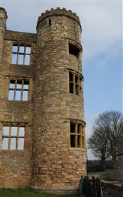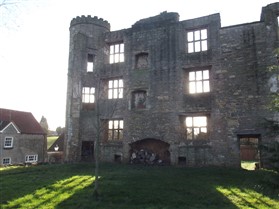 Ruins of the mansion rebuilt in the mid-late 16th century for Hercy Sandford. In addition to the gatehouse the three-storey, nine-bay symmetrical south wall of the courtyard-plan mansion survives, the wall having round corner turrets, projections for external stacks and a central porch. The bases of the rear corner turrets survive, that on the right is linked by a section of plinth wall. The ruins are of limestone rubble. (PastScape)