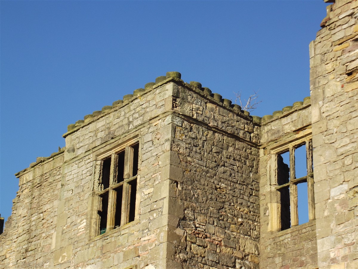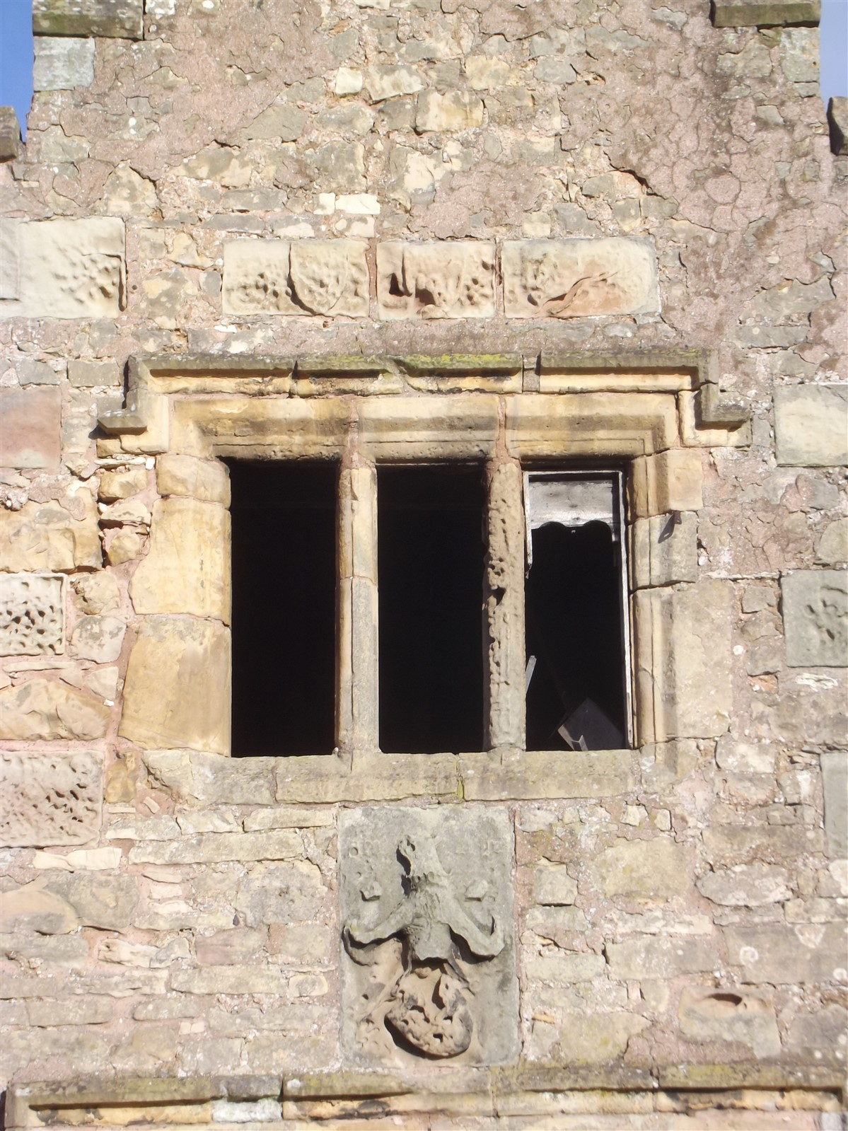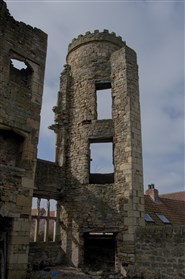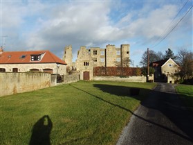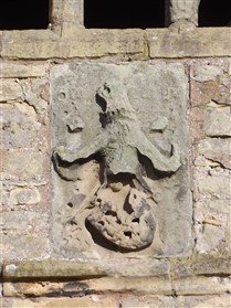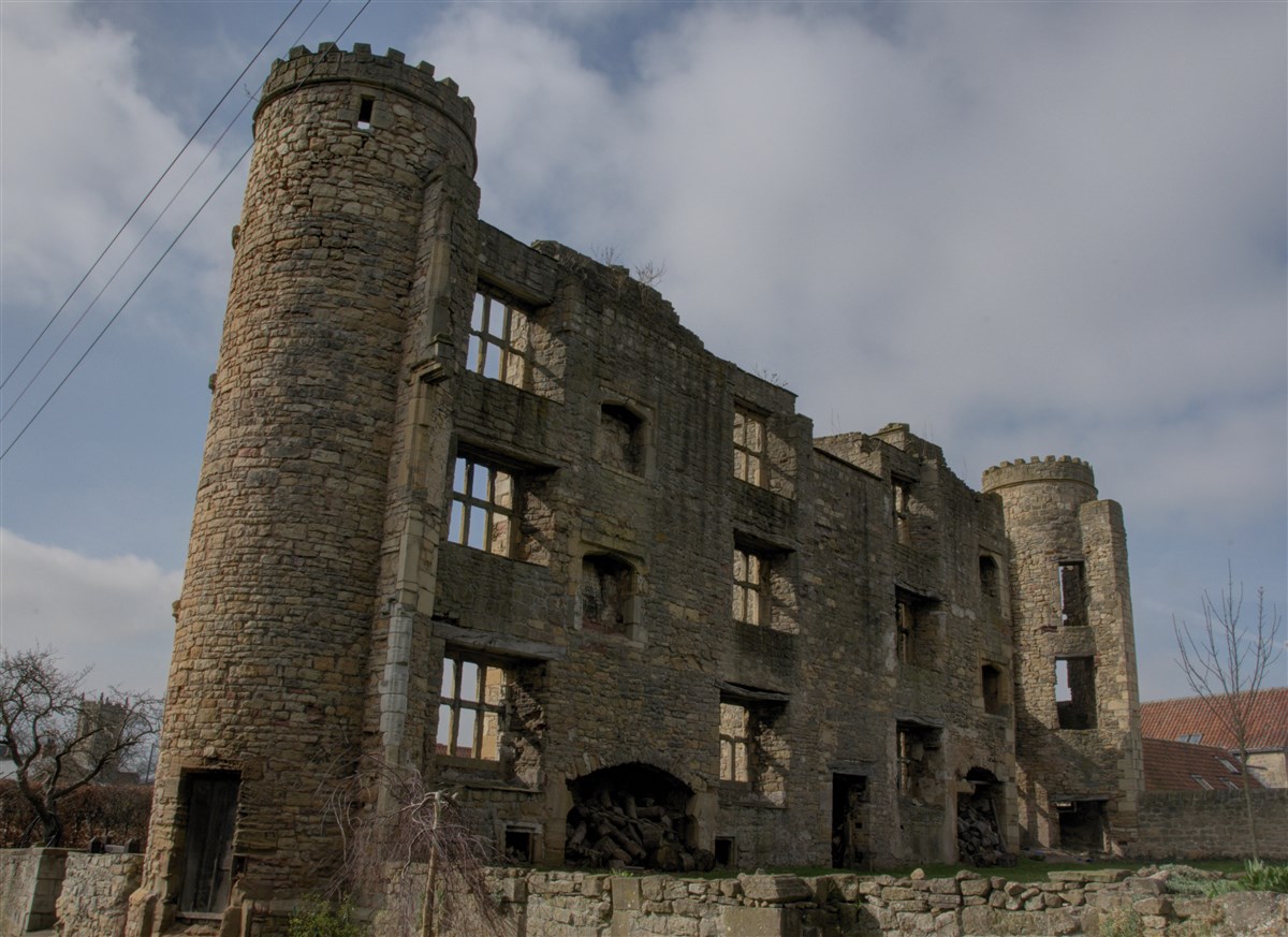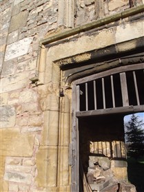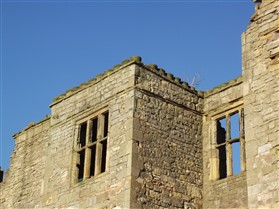 Ruins of the mansion rebuilt in the mid-late 16th century for Hercy Sandford. In addition to the gatehouse the three-storey, nine-bay symmetrical south wall of the courtyard-plan mansion survives, the wall having round corner turrets, projections for external stacks and a central porch. The bases of the rear corner turrets survive, that on the right is linked by a section of plinth wall. The ruins are of limestone rubble. (PastScape)