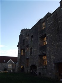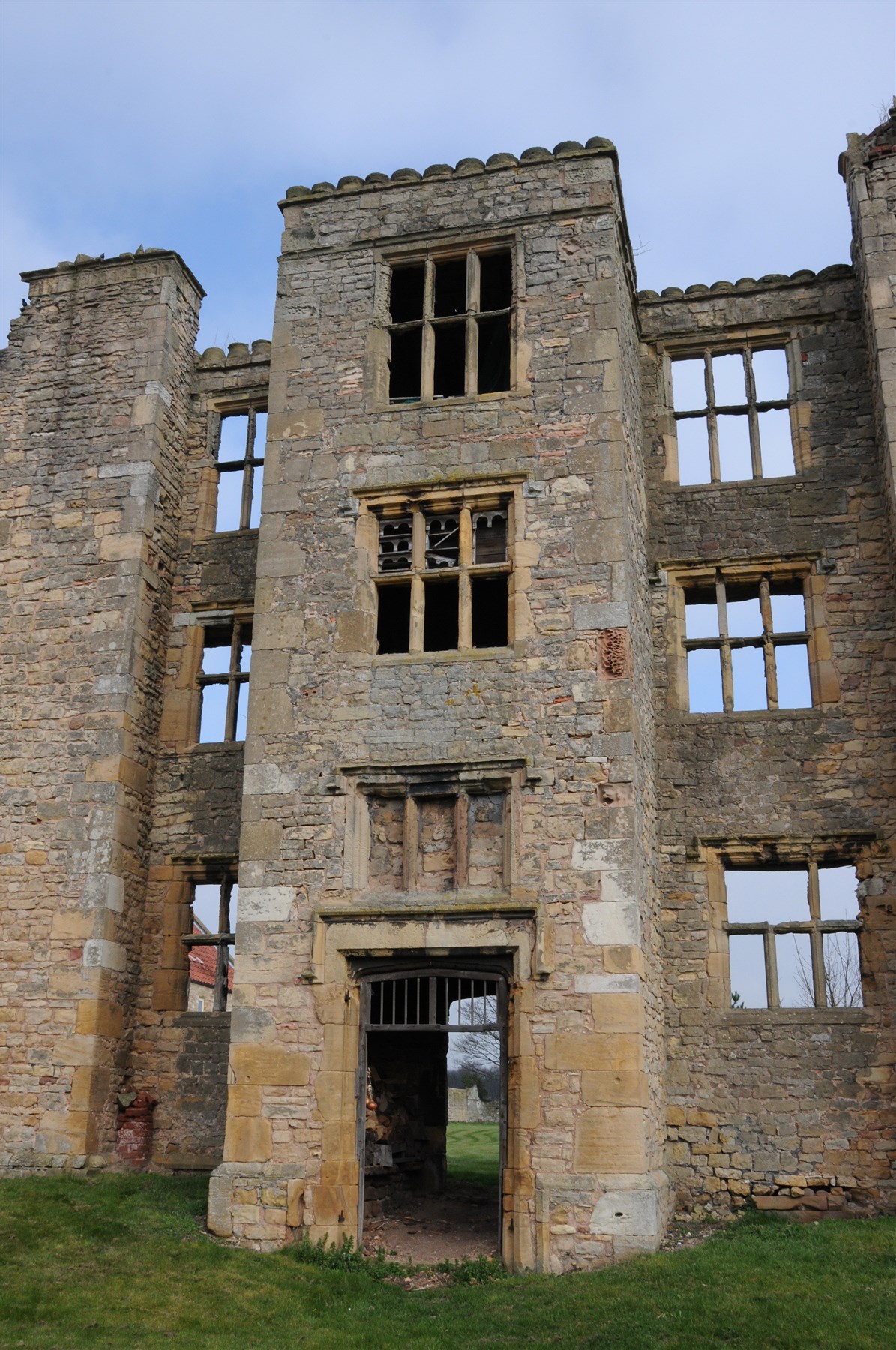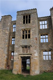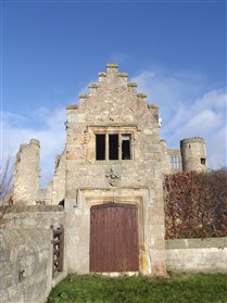Ruined mansion. Mid-late C16. For Hercy Sandford (d1582). Rubble limestone, no roof. 3-storey, 9-bay symmetrical south wall of courtyard-plan mansion having round corner turrets, projections for external stacks and central porch; bases of rear corner turrets survive, that on right linked by section of plinth wall. In Tudor domestic style with transomed, ovolo-moulded mullioned windows mostly of 3 lights. Large quoins, chamfered plinth. Central porch projection has doorway with double-chamfered surround and Tudor-arched lintel with hoodmould; blocked 3-light mullioned window over has hoodmould. Transomed 1st-floor window with hoodmould now has wooden pigeon holes; transomed 2nd-floor window beneath dripcourse. 3 bays to each side have blind central stack projections surmounted by sections of mulled friezes and with diagonally-set stack plinths; bay 2 collapsed above ground floor. Turret at left end ruined, that on right intact and with windows set on the curve, 2nd-floor window without mullions, string course beneath rebuilt parapet. Right return: plinth remains and has projection for stop-chamfered doorway; base of turret on right. Left return: base of rear turret with chamfered square-headed doorway attached. Interior: rear of facade has large ground-floor fireplaces of which the relieving arches remain; triangular- headed fireplaces to upper floors. Heraldic panels on the gatehouse (q.v.) point to the date of construction being 1565-82. The building was sold to Sir Edward Osborne in 1636