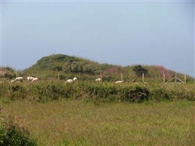 A natural coastal knoll has been enhanced with a rampart and ditch to form a promontory fort. The knoll has been eroded by the sea on the north-west and north-east and only a near square area about 18m across remains of what may have been a rather larger enclosure. The 1.8m deep ditch on the south-east side takes advantage of a natural gully and on this side the rampart rises 3.4m from the ditch bottom. Slighter banks on the noth-east and north-west sides are probably old field boundaries. No finds are known from the site and its original date is unknown. It is perhaps most likely to be a later Prehistoric or Roman period fort. The traditional identification as a medieval earthwork castle ('Castell - site of': on OS County series 1st edition (Anglesey V.12 1889)) is perhaps unlikely. (Coflein–John Wiles 13.08.07)