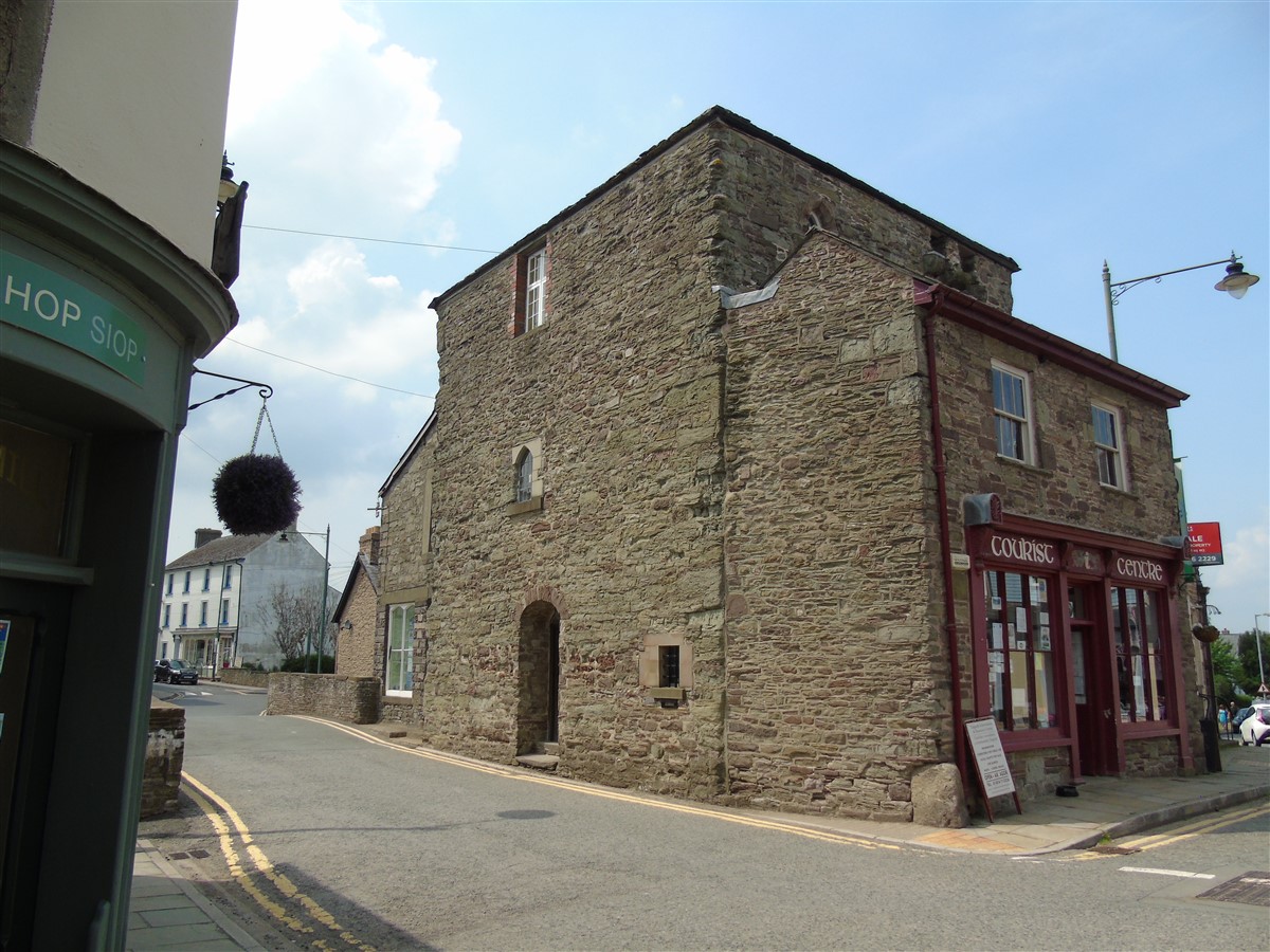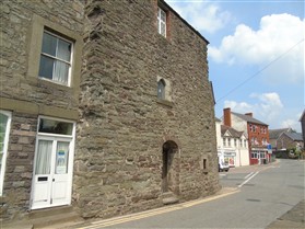The tower itself is square in plan, and consists of 3 storeys and cellar, the walls 1.68 thick, originally rising to a defensible parapet, probably machicolated with a paved wall walk. Added to this structure on the E, a 2-storey rubble shop extension with a pitched slate roof; this was initially a lower lean-to, the evidence surviving as a line on the left gable. Two 6-paned sashes over a simple classical C19 pilastered shop front with bracketed cornice decorated with anthemia, and a central double-doored entrance with overlight. On the SW side is a further C19 2-storey and basement lean-to addition, rising directly from the river, with a rubble chimney stack and various C19 windows with brick quoining. Shop front and door to road, and a boarded door from cellar to river bank. The upper part of the medieval tower above the shop has a short chamfered lancet window set off-centre, with the remains of machicolations to the right, and on the SW side a gargoyle. The NW side is largely obscured by the early C20 National Westminster Bank replacing a steep roofed building, but retains a slightly projecting garderobe. The SE elevation of the tower has a small paned window to the top floor, a round-arched window on the intermediate floor, and a blocked doorway on the ground level. The building attached on the SW side conceals a small lancet window on the first floor of the tower. (Listed Building Report)