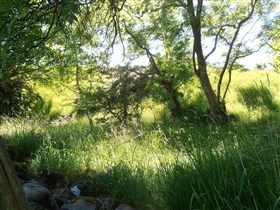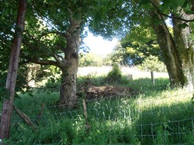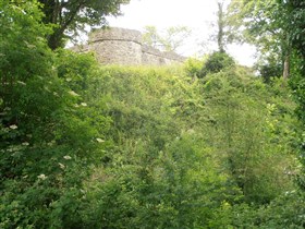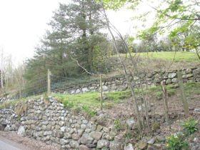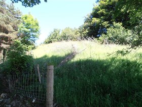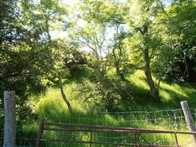 An intriguing site which resembles a mediaeval ringwork, although perhaps prehistoric in origin. Traces of defences are very faint, and only on the S side. Here, there is some stone at the edge of the relatively level top of the hill, and a distinct, if slight, terrace a little further down, again with some stone in the edge. The track which runs past the east side of the site is sunken, and a retaining wall over 1 m high forms the west side. This may be the line of a ditch protecting the site on the accessible east side