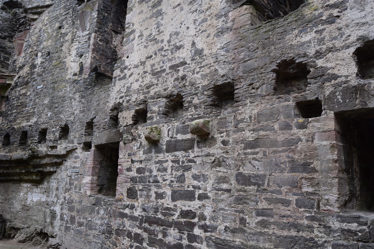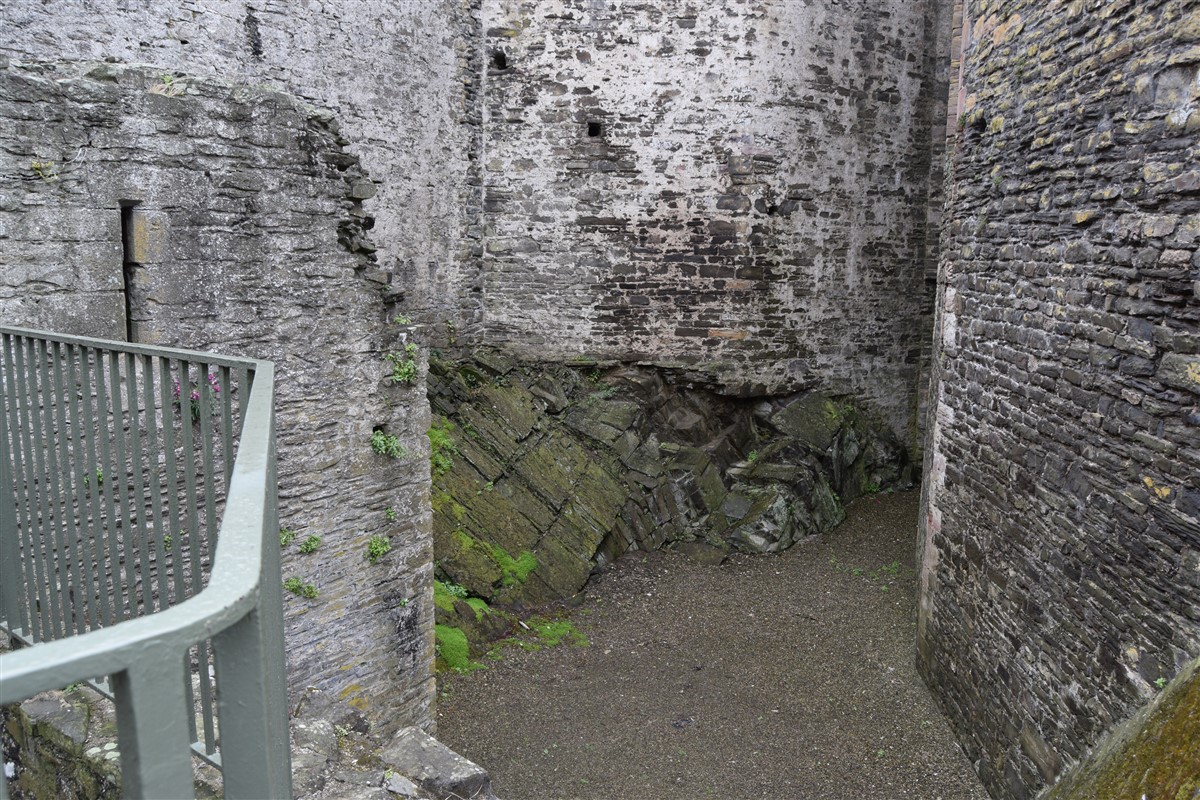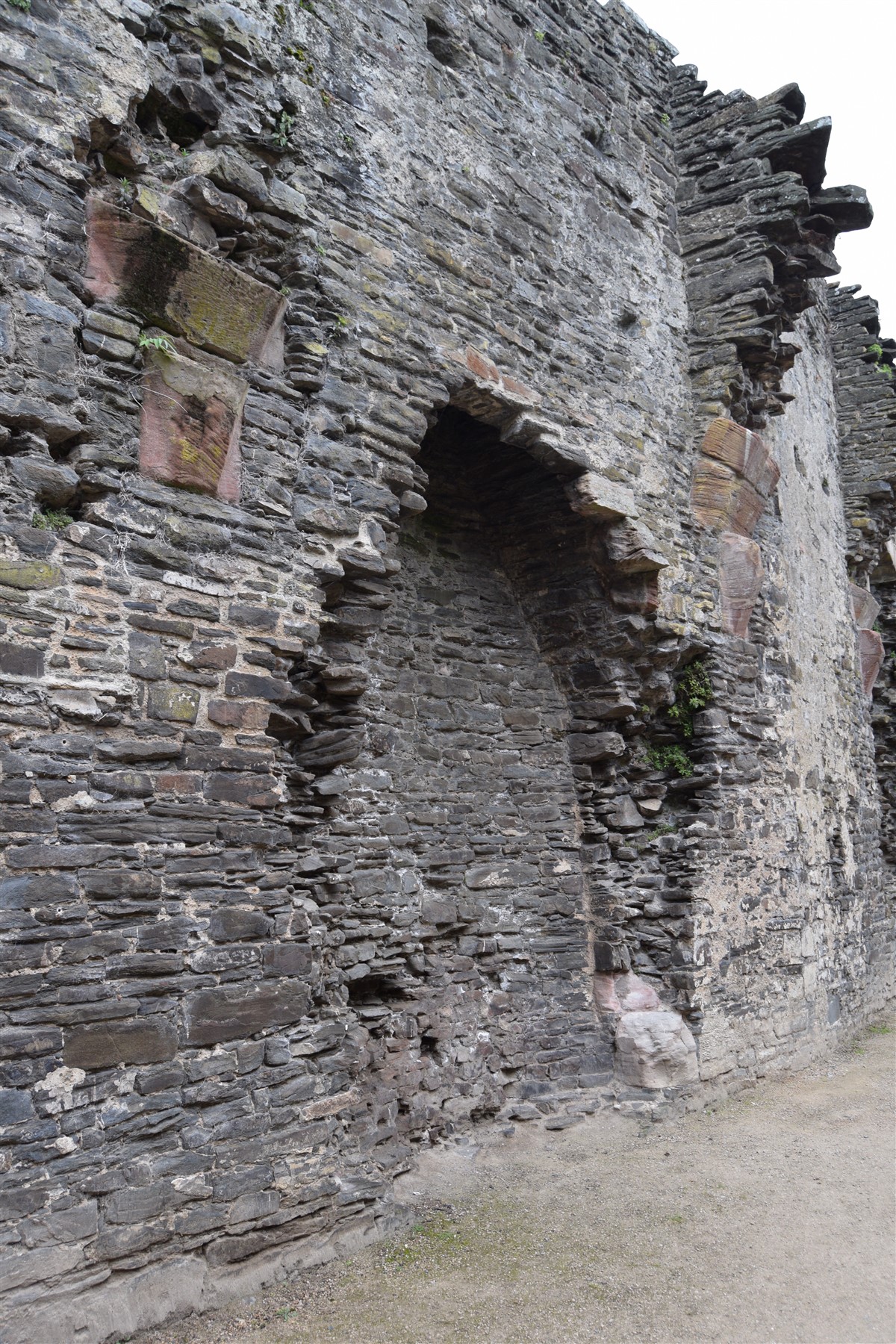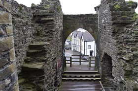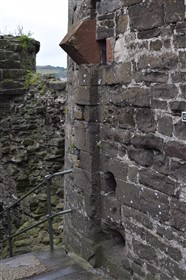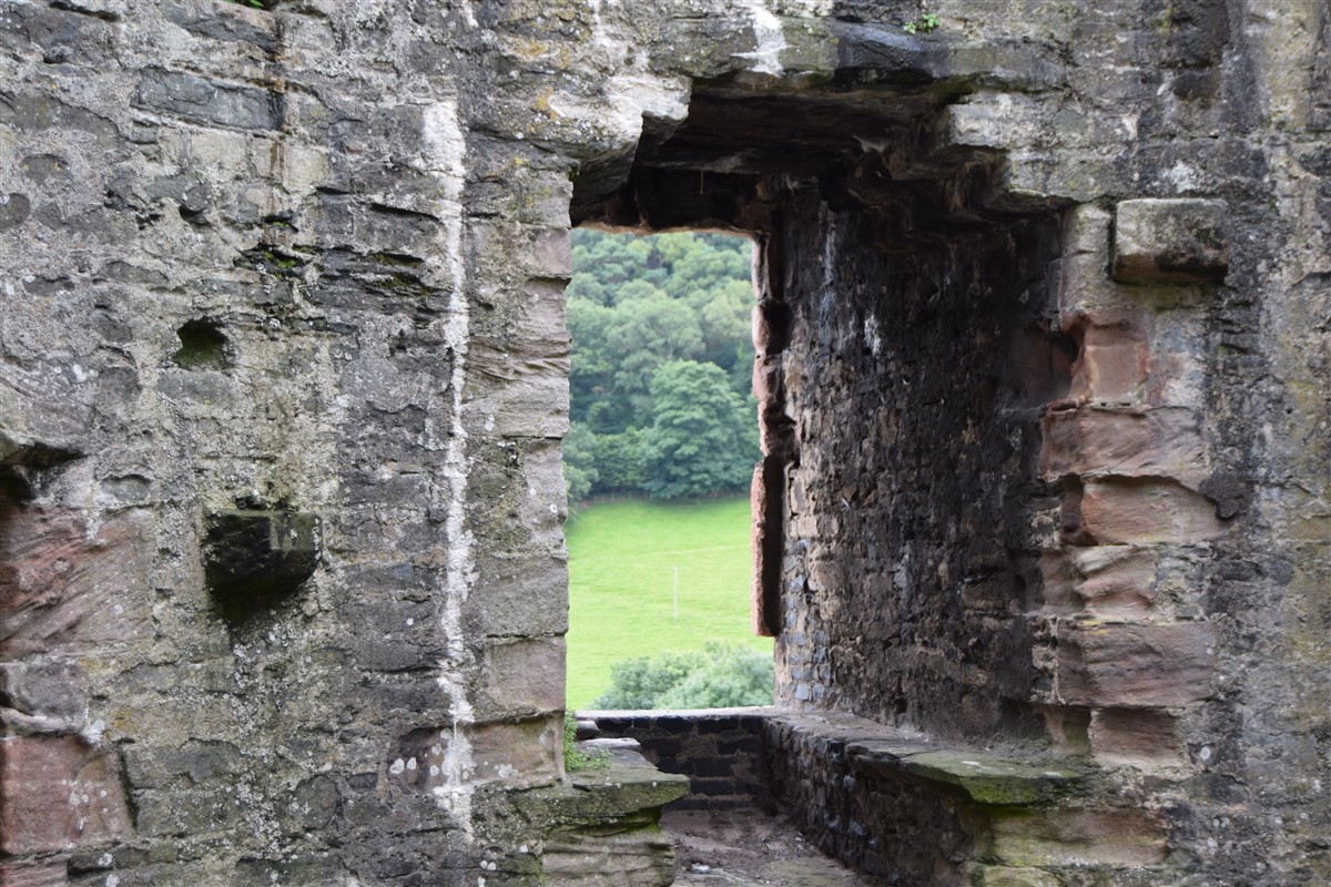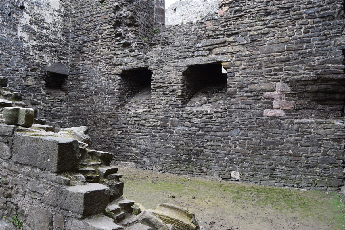 A castle whose compact design is dictated by the rocky outcrop on which its stands. Roughly rectangular in plan, it has a curtain wall with 8 higher round towers enclosing an outer ward on the W side, and smaller near-square inner ward to the E overlooking the river. Additional defence was provided by barbicans at E and W entrances. Walls are coursed rubble, with freestone dressings of pink sandstone. They are embattled with saddleback copings to the merlons, which also have arrow loops on the towers. The round towers have loops and openings of 2-light mullioned windows, although few of the mullions have survived, and higher round stair turrets. Many features are consistent throughout the building, including freestone fireplaces with raked stone hoods, and window seats. The main entrance from the town is on the W side. It retains part of a ramp on the N side from the modern Castle Square. The gap over which the drawbridge was lowered has been covered by a timber platform. The entrance arch to the W barbican has a pointed arch with portcullis slots, flanked by round turrets with corbel tables. Inside the gateway are later stone steps to a gate passage, where there is a modern breach in the wall for visitor access, and the springers and draw-bar sockets of another gateway. The W barbican has an almost straight wall with 3 turrets. The town wall is attached to the southernmost turret. Entrance to the E barbican was from the Water Gate. The outer steps have disappeared, probably lost when Thomas Telford built the suspension bridge in 1822-6, but they are shown on the Buck brothers' 1742 engraving of the castle. Steps inside the barbican have survived, but of the doorway in the barbican wall only the draw-bar sockets have survived. The faceted E barbican wall has 3 turrets similar to the W side. The castle has 8 towers, of which 6 enclose the outer ward, one at the corners and one half way along each of the N and S walls, and 4 enclose the inner ward, of which 2 (stockhouse and bakehouse towers) are common to both inner and outer wards. In the outer ward the S wall is faceted and the W wall is narrower than the E. Otherwise the whole castle is rectangular in plan. The W wall of the outer ward has a pointed arch, below deep corbels of former machicolations. On the N side of the outer ward, both sections of wall have 2 loops and 2 latrine shafts, including one on the W side contained within a shallow projection and low round turret. Attached to the stockhouse tower, between inner and outer wards, is the town wall. The inner ward N wall has 2 loops and 2 low-level outlets of latrine shafts. On the S side each section of the outer ward has 3 windows, 2 loops to the cellar and latrine shaft at wall-walk level. The bakehouse tower between inner and outer wards is partly rebuilt in snecked stone, with a battered plinth of rock-faced stone, repairs carried out by LNWR in the 1870s of the deliberate breach made in 1655. The inner ward S wall has a doorway at ground-floor level above a battered rubble plinth (the only section not built directly on bedrock). At 1st-floor level are 2 loops, a larger opening centre-R, and a former doorway at the R end. Above 1st-floor level are 3 latrine shafts. The E wall, from the E barbican, has a shoulder-headed doorway, 4 1st-floor windows with stepped lintels, and deep corbelled machicolations, although the embattled parapet has not survived. In the outer ward, the gate passage has portcullis slots and draw-bar sockets, and a high-level door on the S side, to stone steps up to the wall walk. The inner side of the wall is corbelled out at parapet level. The NW and SW towers form a pair. They each have 2 superimposed newel stairs restored in concrete. Both have fireplaces to 1st and 2nd floors. In addition the SW tower has a domed bread oven at ground floor, and latrine to the 1st floor. The kitchen tower in the centre of the N side of the outer ward has a ruined newel stair. The wall walk is corbelled out around its faceted inner side. The prison tower on the corresponding S side has a dungeon, but otherwise similar details to the other towers, including restored newel stairs and ruined fireplaces, except for a 2nd-floor fireplace with flat stone arch instead of a corbelled lintel. Remains of buildings can be seen against each of the outer ward walls. Of the guard rooms to the W, flanking the gate passage, and kitchen and stables on the N, only footings have survived. Against the S wall is a long faceted range housing lesser hall and a small chamber in the W facet, great hall in the central facet, passage and chapel in the E facet. At the W end are stone steps leading down to a pointed cellar doorway with continuous chamfer. To its L is a pointed window, its tracery missing but originally 2-light. Further L is a similar former 2-light window to the great hall that retains fragments of bar tracery. In the E facet are the passage doorway, the dressings of which are mostly missing and with modern stone steps, and 2-light chapel window, also with fragments of bar tracery. The chapel has a similar former 3-light E window. Inside, this range has one transverse arch and the springers and haunches of 7 others, all inserted in the mid C14 to support the roof. The lesser hall has a fireplace in its W end wall; the small chamber between halls has a N fireplace; the great hall has a fireplace against the prison tower. Access to the prison tower is from the embrasure of one the S windows of the great hall. The cellar has a dividing wall below the chapel with doorway. On the E side of the outer ward is a stone-lined well, approximately 91 feet deep. Behind the well was a drawbridge to a small gatehouse at the middle gate between inner and outer wards. The gatehouse is square in plan with narrow loop in the W wall. The middle gate has a doorway with shouldered lintel to each end of its passage, and draw-bar socket. The other entrance to the inner ward, the E gate, has draw-bar sock