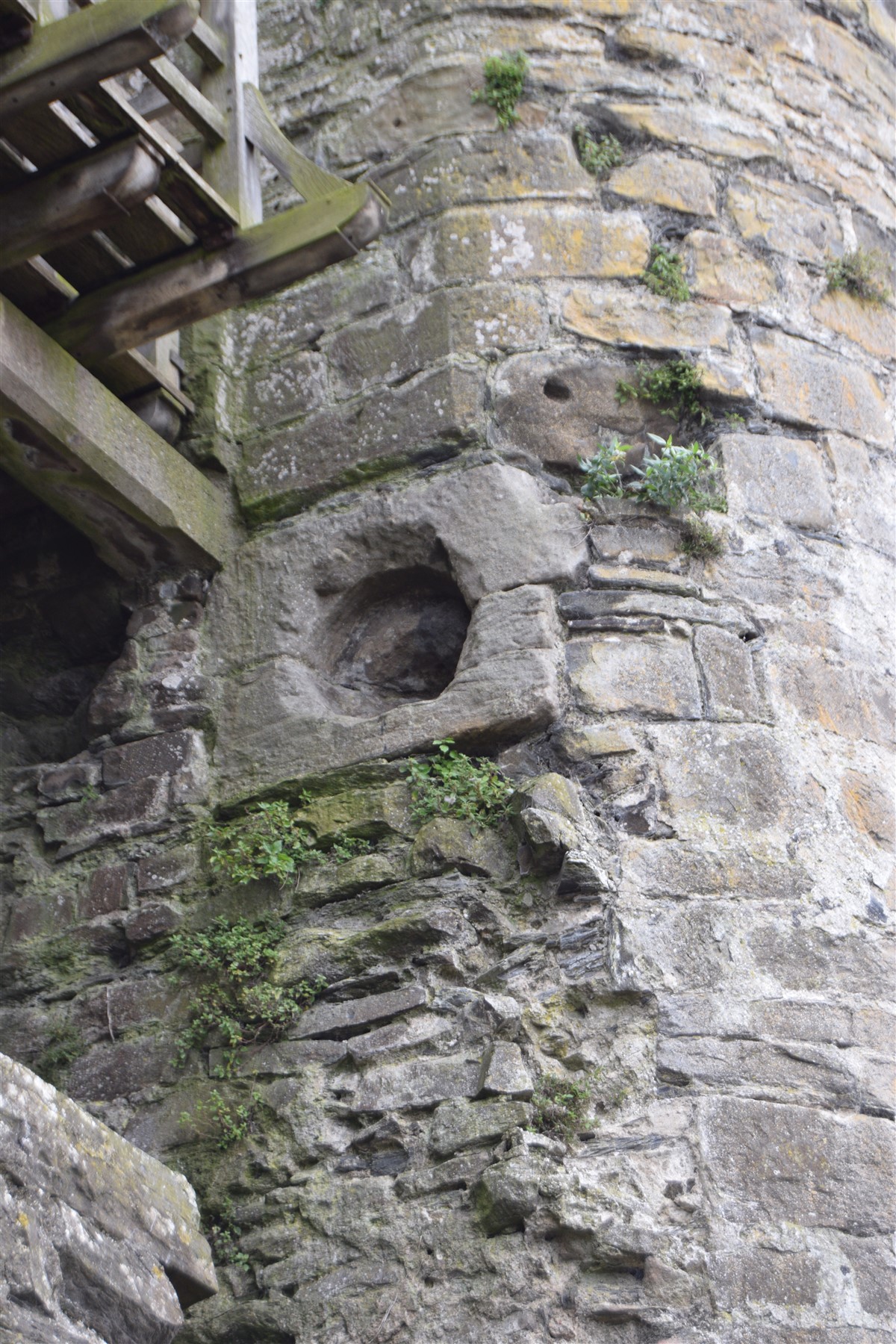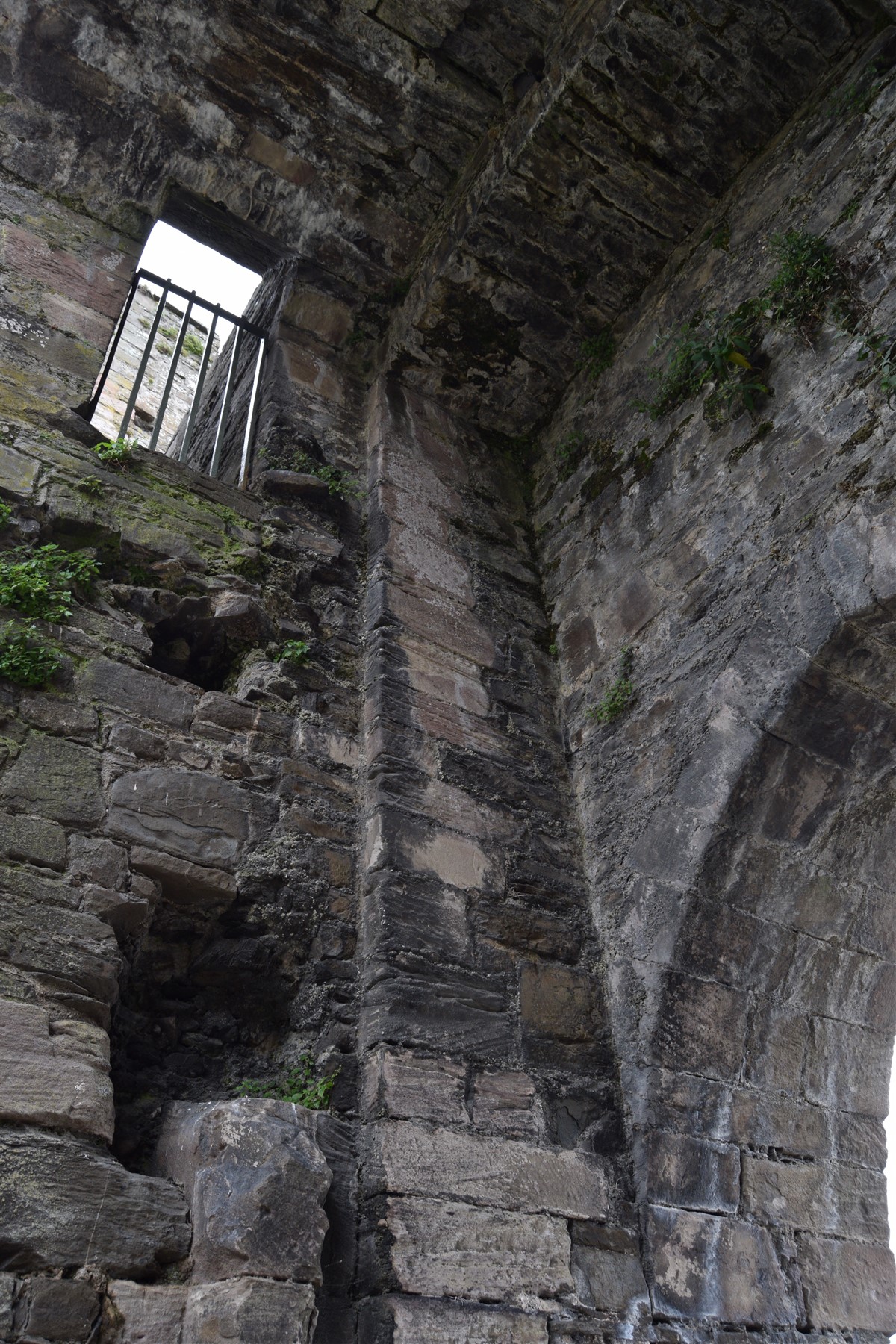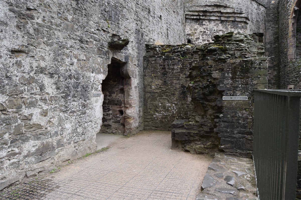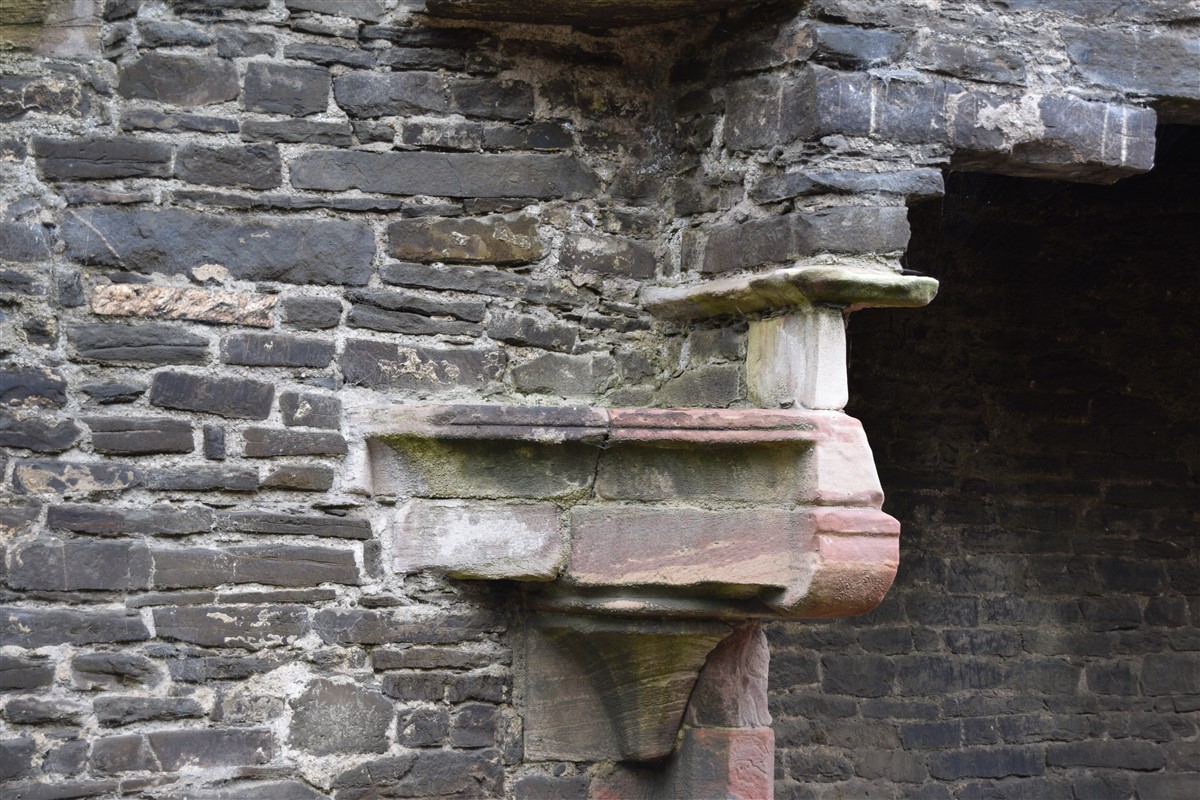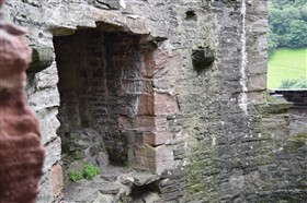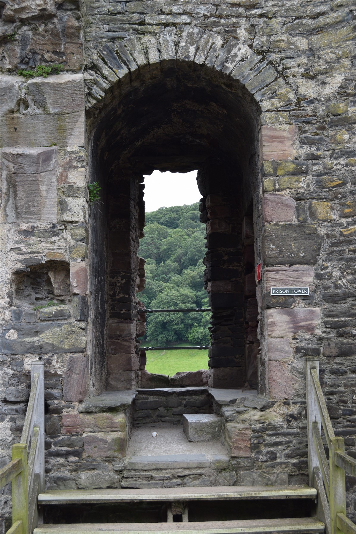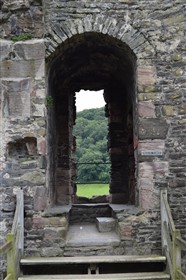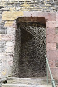 A castle whose compact design is dictated by the rocky outcrop on which its stands. Roughly rectangular in plan, it has a curtain wall with 8 higher round towers enclosing an outer ward on the W side, and smaller near-square inner ward to the E overlooking the river. Additional defence was provided by barbicans at E and W entrances. Walls are coursed rubble, with freestone dressings of pink sandstone. They are embattled with saddleback copings to the merlons, which also have arrow loops on the towers. The round towers have loops and openings of 2-light mullioned windows, although few of the mullions have survived, and higher round stair turrets. Many features are consistent throughout the building, including freestone fireplaces with raked stone hoods, and window seats. The main entrance from the town is on the W side. It retains part of a ramp on the N side from the modern Castle Square. The gap over which the drawbridge was lowered has been covered by a timber platform. The entrance arch to the W barbican has a pointed arch with portcullis slots, flanked by round turrets with corbel tables. Inside the gateway are later stone steps to a gate passage, where there is a modern breach in the wall for visitor access, and the springers and draw-bar sockets of another gateway. The W barbican has an almost straight wall with 3 turrets. The town wall is attached to the southernmost turret. Entrance to the E barbican was from the Water Gate. The outer steps have disappeared, probably lost when Thomas Telford built the suspension bridge in 1822-6, but they are shown on the Buck brothers' 1742 engraving of the castle. Steps inside the barbican have survived, but of the doorway in the barbican wall only the draw-bar sockets have survived. The faceted E barbican wall has 3 turrets similar to the W side. The castle has 8 towers, of which 6 enclose the outer ward, one at the corners and one half way along each of the N and S walls, and 4 enclose the inner ward, of which 2 (stockhouse and bakehouse towers) are common to both inner and outer wards. In the outer ward the S wall is faceted and the W wall is narrower than the E. Otherwise the whole castle is rectangular in plan. The W wall of the outer ward has a pointed arch, below deep corbels of former machicolations. On the N side of the outer ward, both sections of wall have 2 loops and 2 latrine shafts, including one on the W side contained within a shallow projection and low round turret. Attached to the stockhouse tower, between inner and outer wards, is the town wall. The inner ward N wall has 2 loops and 2 low-level outlets of latrine shafts. On the S side each section of the outer ward has 3 windows, 2 loops to the cellar and latrine shaft at wall-walk level. The bakehouse tower between inner and outer wards is partly rebuilt in snecked stone, with a battered plinth of rock-faced stone, repairs carried out by LNWR in the 1870s of the deliberate breach made in 1655. The inner ward S wall has a doorway at ground-floor level above a battered rubble plinth (the only section not built directly on bedrock). At 1st-floor level are 2 loops, a larger opening centre-R, and a former doorway at the R end. Above 1st-floor level are 3 latrine shafts. The E wall, from the E barbican, has a shoulder-headed doorway, 4 1st-floor windows with stepped lintels, and deep corbelled machicolations, although the embattled parapet has not survived. In the outer ward, the gate passage has portcullis slots and draw-bar sockets, and a high-level door on the S side, to stone steps up to the wall walk. The inner side of the wall is corbelled out at parapet level. The NW and SW towers form a pair. They each have 2 superimposed newel stairs restored in concrete. Both have fireplaces to 1st and 2nd floors. In addition the SW tower has a domed bread oven at ground floor, and latrine to the 1st floor. The kitchen tower in the centre of the N side of the outer ward has a ruined newel stair. The wall walk is corbelled out around its faceted inner side. The prison tower on the corresponding S side has a dungeon, but otherwise similar details to the other towers, including restored newel stairs and ruined fireplaces, except for a 2nd-floor fireplace with flat stone arch instead of a corbelled lintel. Remains of buildings can be seen against each of the outer ward walls. Of the guard rooms to the W, flanking the gate passage, and kitchen and stables on the N, only footings have survived. Against the S wall is a long faceted range housing lesser hall and a small chamber in the W facet, great hall in the central facet, passage and chapel in the E facet. At the W end are stone steps leading down to a pointed cellar doorway with continuous chamfer. To its L is a pointed window, its tracery missing but originally 2-light. Further L is a similar former 2-light window to the great hall that retains fragments of bar tracery. In the E facet are the passage doorway, the dressings of which are mostly missing and with modern stone steps, and 2-light chapel window, also with fragments of bar tracery. The chapel has a similar former 3-light E window. Inside, this range has one transverse arch and the springers and haunches of 7 others, all inserted in the mid C14 to support the roof. The lesser hall has a fireplace in its W end wall; the small chamber between halls has a N fireplace; the great hall has a fireplace against the prison tower. Access to the prison tower is from the embrasure of one the S windows of the great hall. The cellar has a dividing wall below the chapel with doorway. On the E side of the outer ward is a stone-lined well, approximately 91 feet deep. Behind the well was a drawbridge to a small gatehouse at the middle gate between inner and outer wards. The gatehouse is square in plan with narrow loop in the W wall. The middle gate has a doorway with shouldered lintel to each end of its passage, and draw-bar socket. The other entrance to the inner ward, the E gate, has draw-bar sock