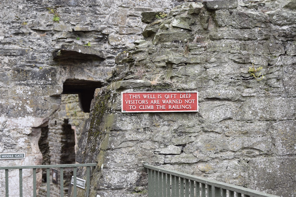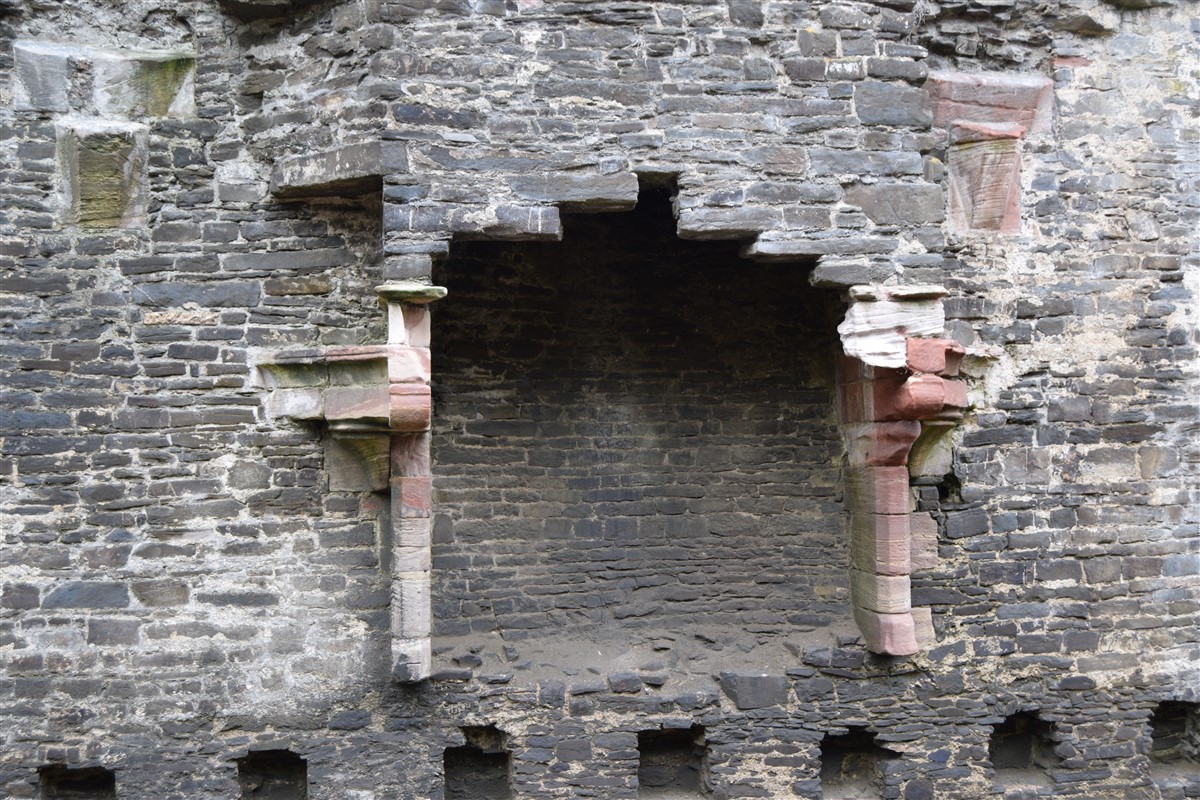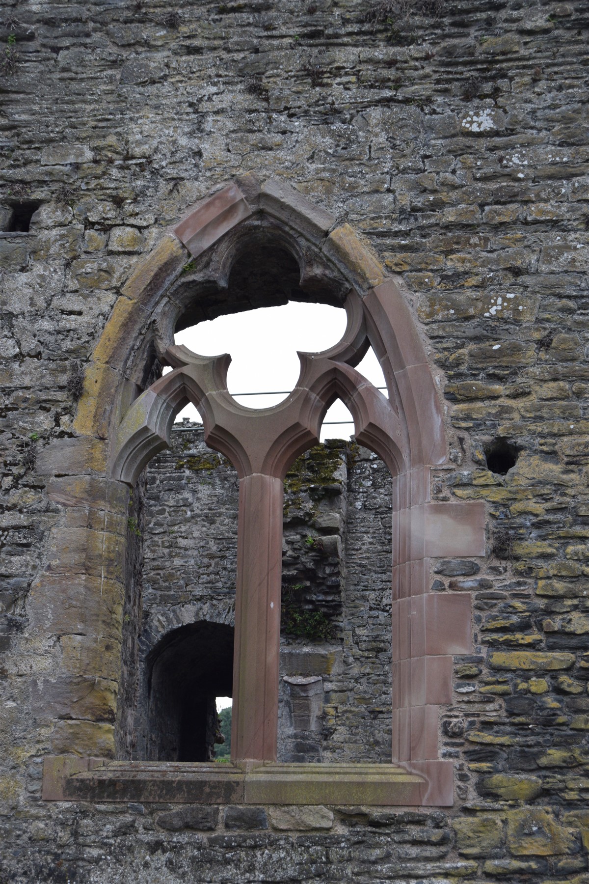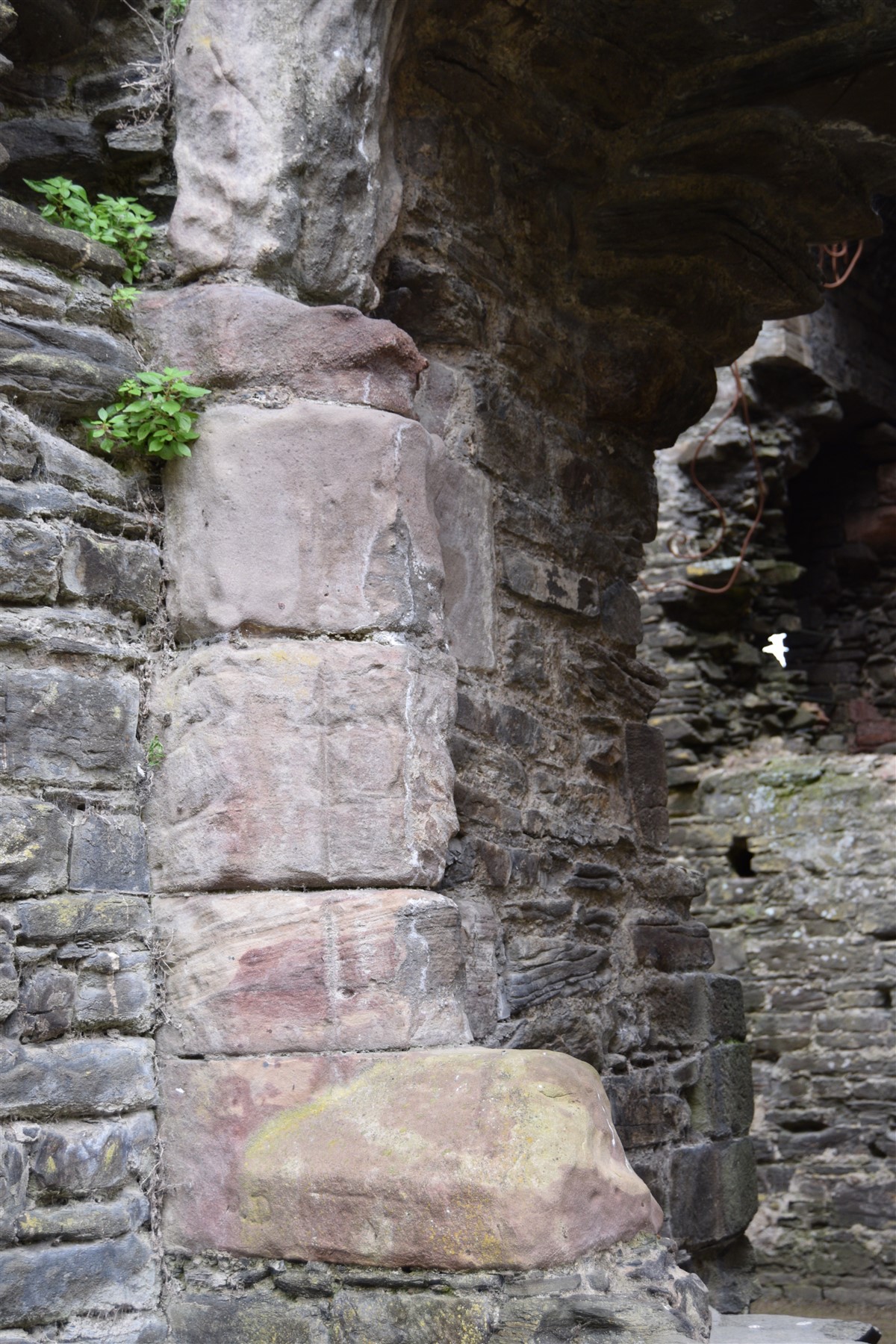 A castle whose compact design is dictated by the rocky outcrop on which its stands. Roughly rectangular in plan, it has a curtain wall with 8 higher round towers enclosing an outer ward on the W side, and smaller near-square inner ward to the E overlooking the river. Additional defence was provided by barbicans at E and W entrances. Walls are coursed rubble, with freestone dressings of pink sandstone. They are embattled with saddleback copings to the merlons, which also have arrow loops on the towers. The round towers have loops and openings of 2-light mullioned windows, although few of the mullions have survived, and higher round stair turrets. Many features are consistent throughout the building, including freestone fireplaces with raked stone hoods, and window seats. The main entrance from the town is on the W side. It retains part of a ramp on the N side from the modern Castle Square. The gap over which the drawbridge was lowered has been covered by a timber platform. The entrance arch to the W barbican has a pointed arch with portcullis slots, flanked by round turrets with corbel tables. Inside the gateway are later stone steps to a gate passage, where there is a modern breach in the wall for visitor access, and the springers and draw-bar sockets of another gateway. The W barbican has an almost straight wall with 3 turrets. The town wall is attached to the southernmost turret. Entrance to the E barbican was from the Water Gate. The outer steps have disappeared, probably lost when Thomas Telford built the suspension bridge in 1822-6, but they are shown on the Buck brothers' 1742 engraving of the castle. Steps inside the barbican have survived, but of the doorway in the barbican wall only the draw-bar sockets have survived. The faceted E barbican wall has 3 turrets similar to the W side. The castle has 8 towers, of which 6 enclose the outer ward, one at the corners and one half way along each of the N and S walls, and 4 enclose the inner ward, of which 2 (stockhouse and bakehouse towers) are common to both inner and outer wards. In the outer ward the S wall is faceted and the W wall is narrower than the E. Otherwise the whole castle is rectangular in plan. The W wall of the outer ward has a pointed arch, below deep corbels of former machicolations. On the N side of the outer ward, both sections of wall have 2 loops and 2 latrine shafts, including one on the W side contained within a shallow projection and low round turret. Attached to the stockhouse tower, between inner and outer wards, is the town wall. The inner ward N wall has 2 loops and 2 low-level outlets of latrine shafts. On the S side each section of the outer ward has 3 windows, 2 loops to the cellar and latrine shaft at wall-walk level. The bakehouse tower between inner and outer wards is partly rebuilt in snecked stone, with a battered plinth of rock-faced stone, repairs carried out by LNWR in the 1870s of the deliberate breach made in 1655. The inner ward S wall has a doorway at ground-floor level above a battered rubble plinth (the only section not built directly on bedrock). At 1st-floor level are 2 loops, a larger opening centre-R, and a former doorway at the R end. Above 1st-floor level are 3 latrine shafts. The E wall, from the E barbican, has a shoulder-headed doorway, 4 1st-floor windows with stepped lintels, and deep corbelled machicolations, although the embattled parapet has not survived. In the outer ward, the gate passage has portcullis slots and draw-bar sockets, and a high-level door on the S side, to stone steps up to the wall walk. The inner side of the wall is corbelled out at parapet level. The NW and SW towers form a pair. They each have 2 superimposed newel stairs restored in concrete. Both have fireplaces to 1st and 2nd floors. In addition the SW tower has a domed bread oven at ground floor, and latrine to the 1st floor. The kitchen tower in the centre of the N side of the outer ward has a ruined newel stair. The wall walk is corbelled out around its faceted inner side. The prison tower on the corresponding S side has a dungeon, but otherwise similar details to the other towers, including restored newel stairs and ruined fireplaces, except for a 2nd-floor fireplace with flat stone arch instead of a corbelled lintel. Remains of buildings can be seen against each of the outer ward walls. Of the guard rooms to the W, flanking the gate passage, and kitchen and stables on the N, only footings have survived. Against the S wall is a long faceted range housing lesser hall and a small chamber in the W facet, great hall in the central facet, passage and chapel in the E facet. At the W end are stone steps leading down to a pointed cellar doorway with continuous chamfer. To its L is a pointed window, its tracery missing but originally 2-light. Further L is a similar former 2-light window to the great hall that retains fragments of bar tracery. In the E facet are the passage doorway, the dressings of which are mostly missing and with modern stone steps, and 2-light chapel window, also with fragments of bar tracery. The chapel has a similar former 3-light E window. Inside, this range has one transverse arch and the springers and haunches of 7 others, all inserted in the mid C14 to support the roof. The lesser hall has a fireplace in its W end wall; the small chamber between halls has a N fireplace; the great hall has a fireplace against the prison tower. Access to the prison tower is from the embrasure of one the S windows of the great hall. The cellar has a dividing wall below the chapel with doorway. On the E side of the outer ward is a stone-lined well, approximately 91 feet deep. Behind the well was a drawbridge to a small gatehouse at the middle gate between inner and outer wards. The gatehouse is square in plan with narrow loop in the W wall. The middle gate has a doorway with shouldered lintel to each end of its passage, and draw-bar socket. The other entrance to the inner ward, the E gate, has draw-bar sock