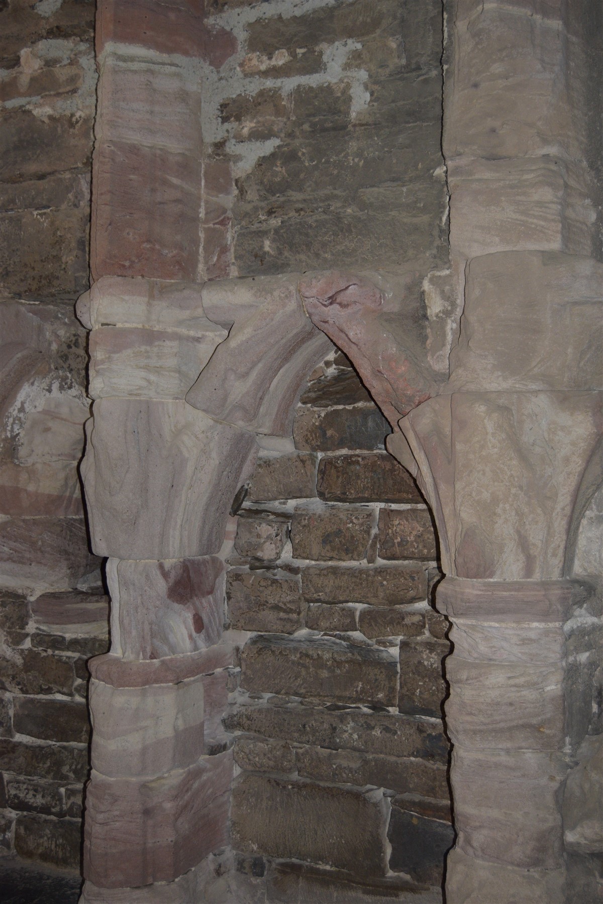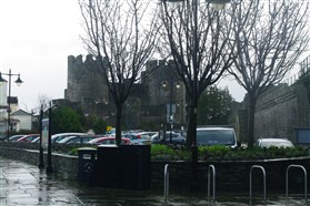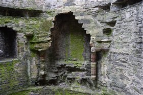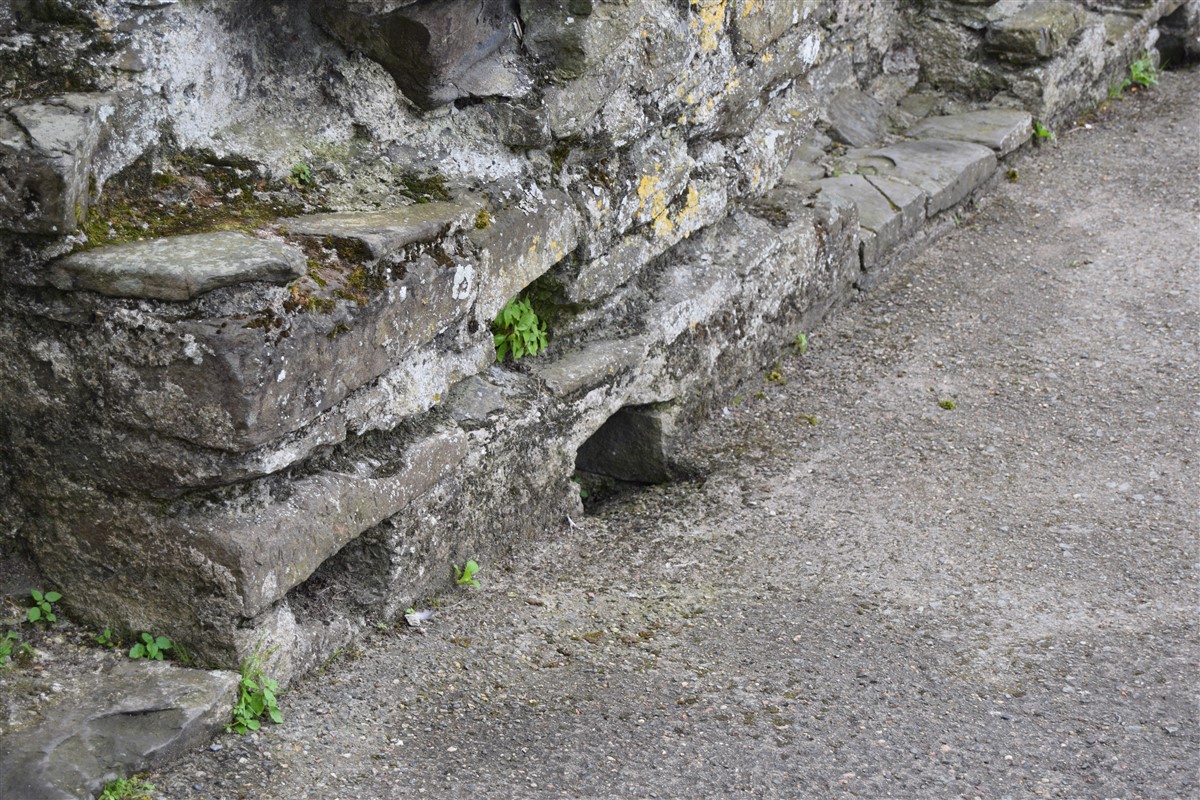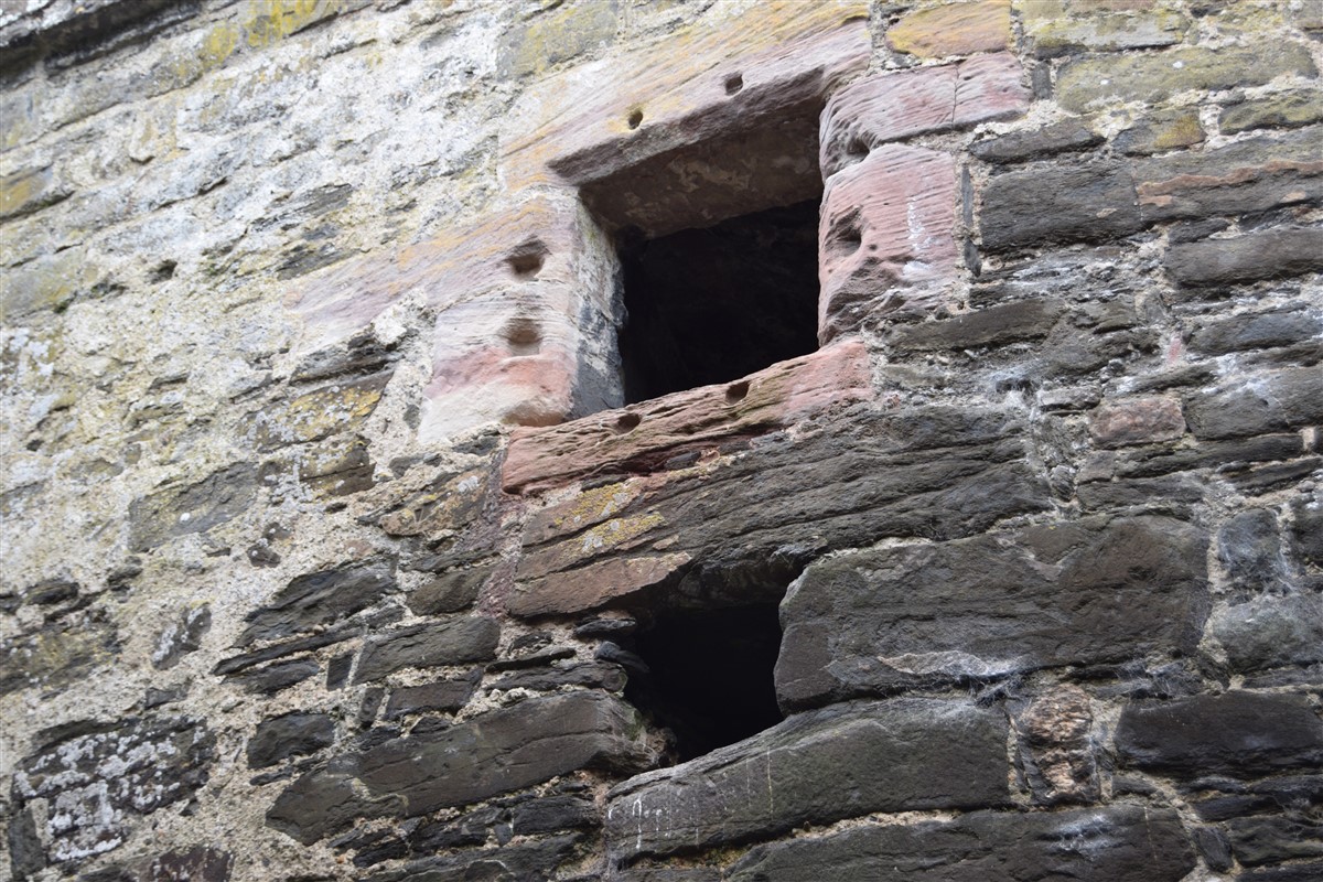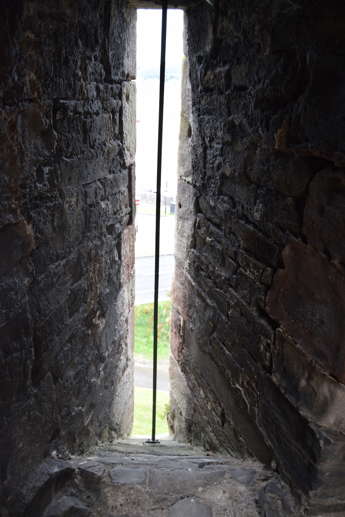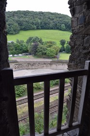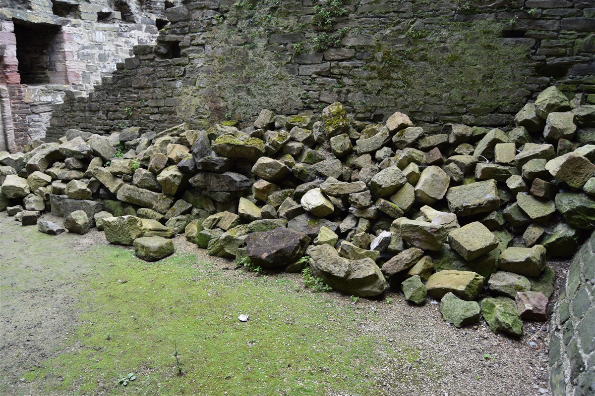 A castle whose compact design is dictated by the rocky outcrop on which its stands. Roughly rectangular in plan, it has a curtain wall with 8 higher round towers enclosing an outer ward on the W side, and smaller near-square inner ward to the E overlooking the river. Additional defence was provided by barbicans at E and W entrances. Walls are coursed rubble, with freestone dressings of pink sandstone. They are embattled with saddleback copings to the merlons, which also have arrow loops on the towers. The round towers have loops and openings of 2-light mullioned windows, although few of the mullions have survived, and higher round stair turrets. Many features are consistent throughout the building, including freestone fireplaces with raked stone hoods, and window seats. The main entrance from the town is on the W side. It retains part of a ramp on the N side from the modern Castle Square. The gap over which the drawbridge was lowered has been covered by a timber platform. The entrance arch to the W barbican has a pointed arch with portcullis slots, flanked by round turrets with corbel tables. Inside the gateway are later stone steps to a gate passage, where there is a modern breach in the wall for visitor access, and the springers and draw-bar sockets of another gateway. The W barbican has an almost straight wall with 3 turrets. The town wall is attached to the southernmost turret. Entrance to the E barbican was from the Water Gate. The outer steps have disappeared, probably lost when Thomas Telford built the suspension bridge in 1822-6, but they are shown on the Buck brothers' 1742 engraving of the castle. Steps inside the barbican have survived, but of the doorway in the barbican wall only the draw-bar sockets have survived. The faceted E barbican wall has 3 turrets similar to the W side. The castle has 8 towers, of which 6 enclose the outer ward, one at the corners and one half way along each of the N and S walls, and 4 enclose the inner ward, of which 2 (stockhouse and bakehouse towers) are common to both inner and outer wards. In the outer ward the S wall is faceted and the W wall is narrower than the E. Otherwise the whole castle is rectangular in plan. The W wall of the outer ward has a pointed arch, below deep corbels of former machicolations. On the N side of the outer ward, both sections of wall have 2 loops and 2 latrine shafts, including one on the W side contained within a shallow projection and low round turret. Attached to the stockhouse tower, between inner and outer wards, is the town wall. The inner ward N wall has 2 loops and 2 low-level outlets of latrine shafts. On the S side each section of the outer ward has 3 windows, 2 loops to the cellar and latrine shaft at wall-walk level. The bakehouse tower between inner and outer wards is partly rebuilt in snecked stone, with a battered plinth of rock-faced stone, repairs carried out by LNWR in the 1870s of the deliberate breach made in 1655. The inner ward S wall has a doorway at ground-floor level above a battered rubble plinth (the only section not built directly on bedrock). At 1st-floor level are 2 loops, a larger opening centre-R, and a former doorway at the R end. Above 1st-floor level are 3 latrine shafts. The E wall, from the E barbican, has a shoulder-headed doorway, 4 1st-floor windows with stepped lintels, and deep corbelled machicolations, although the embattled parapet has not survived. In the outer ward, the gate passage has portcullis slots and draw-bar sockets, and a high-level door on the S side, to stone steps up to the wall walk. The inner side of the wall is corbelled out at parapet level. The NW and SW towers form a pair. They each have 2 superimposed newel stairs restored in concrete. Both have fireplaces to 1st and 2nd floors. In addition the SW tower has a domed bread oven at ground floor, and latrine to the 1st floor. The kitchen tower in the centre of the N side of the outer ward has a ruined newel stair. The wall walk is corbelled out around its faceted inner side. The prison tower on the corresponding S side has a dungeon, but otherwise similar details to the other towers, including restored newel stairs and ruined fireplaces, except for a 2nd-floor fireplace with flat stone arch instead of a corbelled lintel. Remains of buildings can be seen against each of the outer ward walls. Of the guard rooms to the W, flanking the gate passage, and kitchen and stables on the N, only footings have survived. Against the S wall is a long faceted range housing lesser hall and a small chamber in the W facet, great hall in the central facet, passage and chapel in the E facet. At the W end are stone steps leading down to a pointed cellar doorway with continuous chamfer. To its L is a pointed window, its tracery missing but originally 2-light. Further L is a similar former 2-light window to the great hall that retains fragments of bar tracery. In the E facet are the passage doorway, the dressings of which are mostly missing and with modern stone steps, and 2-light chapel window, also with fragments of bar tracery. The chapel has a similar former 3-light E window. Inside, this range has one transverse arch and the springers and haunches of 7 others, all inserted in the mid C14 to support the roof. The lesser hall has a fireplace in its W end wall; the small chamber between halls has a N fireplace; the great hall has a fireplace against the prison tower. Access to the prison tower is from the embrasure of one the S windows of the great hall. The cellar has a dividing wall below the chapel with doorway. On the E side of the outer ward is a stone-lined well, approximately 91 feet deep. Behind the well was a drawbridge to a small gatehouse at the middle gate between inner and outer wards. The gatehouse is square in plan with narrow loop in the W wall. The middle gate has a doorway with shouldered lintel to each end of its passage, and draw-bar socket. The other entrance to the inner ward, the E gate, has draw-bar sock