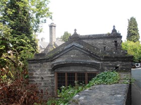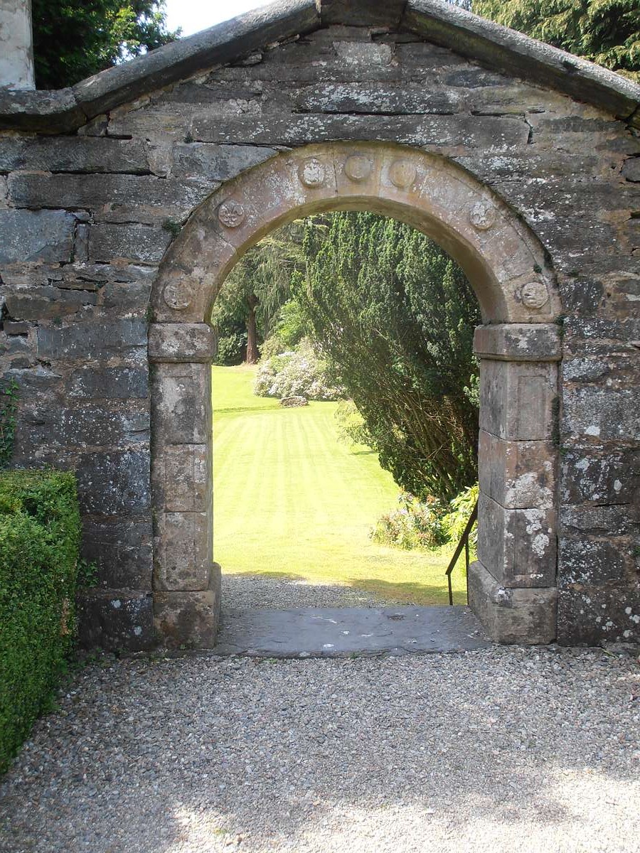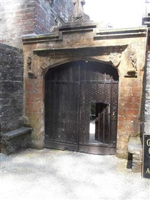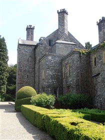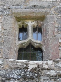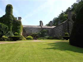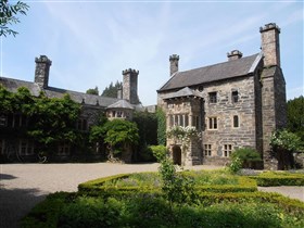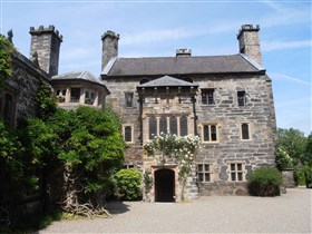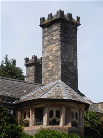 Gwydir Castle is an irregularly planned house in late Perpendicular Gothic style with some late 16th century Renaissance detailing. It is of roughly J-shaped plan, constructed of slate-stone blocks with sandstone dressings and slate roofs. Many of the building materials came from Maenan Abbey. The Upper Hall, known as the Hall of Meredith, has three main bays, then a half-bay at the south-west, which indicates a dais canopy. The ceiling was scraped of plaster, including a flat Elizabethan ceiling, in the 1950s, resulting in the reincorporation of the open roof into the hall. The fireplace at the south-west end has a simple timber lintel, probably meant for plaster. At the north-east end is the oak-framed smoke-bay. The roof looks early as it is shallow-pitched with arched-braced collar-trusses with apex struts, and short cusped wind-braces. It is possibly fifteenth century. The four storey solar tower is at right angles to the Hall of Meredith and is early to mid sixteenth century in date. The Tudor archway is dated 1555 and had a timber-framed upper storey until 1820. There are also north and west wings, the latter being a nineteenth century copy of the mid-sixteenth century former. The building was gutted by fire in 1912 and 1922. There is a painted stencilled frieze above panelling and painted genealogical table in the dining room. (Coflein–ref. CADW listed buildings descriptions)
