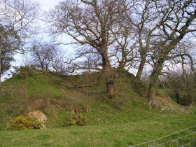 An agreeable little motte standing on the S. slope of a minor stream-valley. It is in no sense backed against any serious obstacle, but the S. is certainly the weakest side. There is a ditch all round, forming a mere step on the N. side, but elsewhere 6 ft. deep. There is no sign of a bailey, and I do not believe there ever was one. There is a deep hollow in the top, and the N.W. side has been severely mutilated, probably by treasure-hunters, fairly recently. The ungrassed sides of the cavity reveal no peculiarities of structure, only earth and a great deal of slaty stone. I doubt if all of this can have been dug out of the rather narrow ditch. (King 1956)