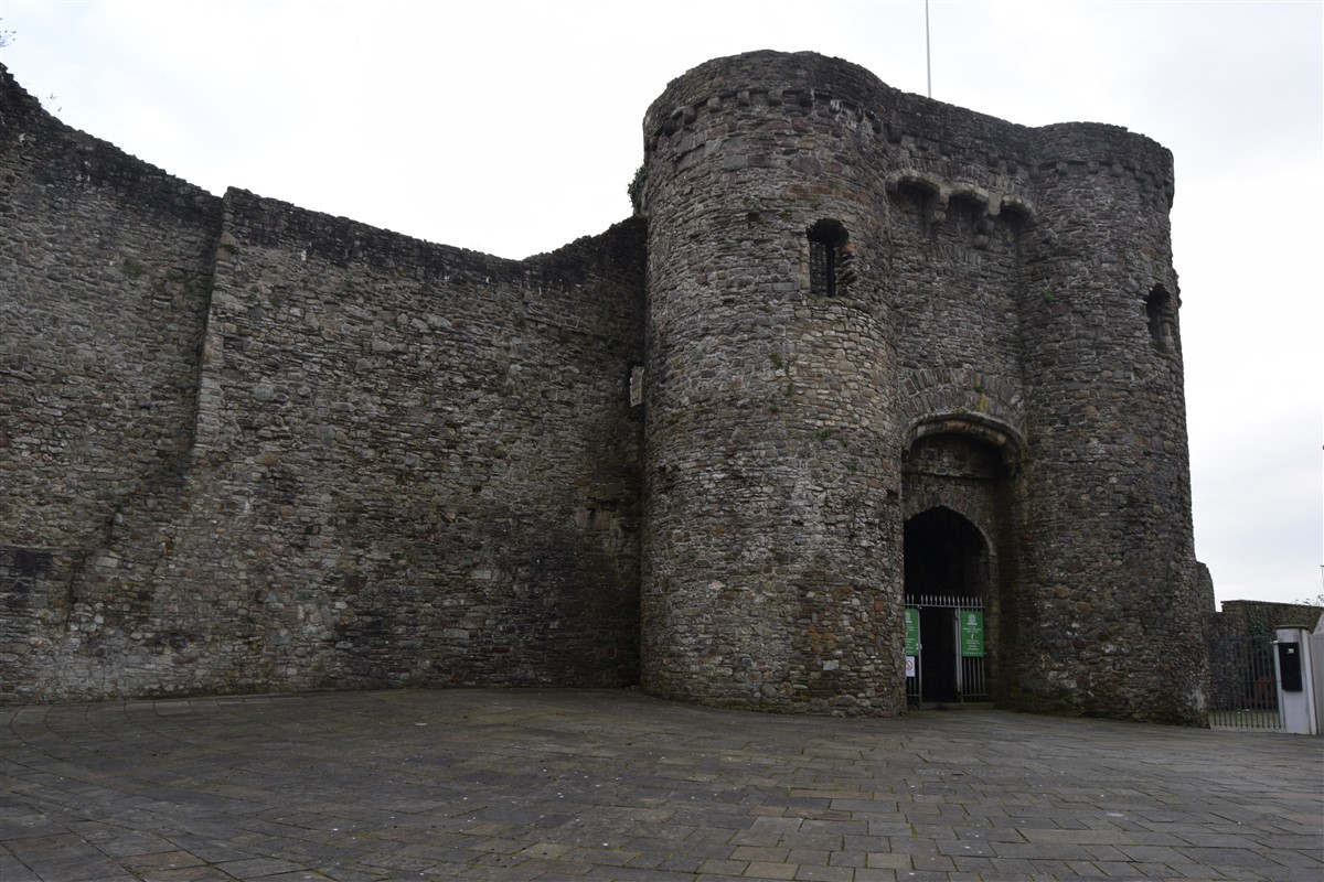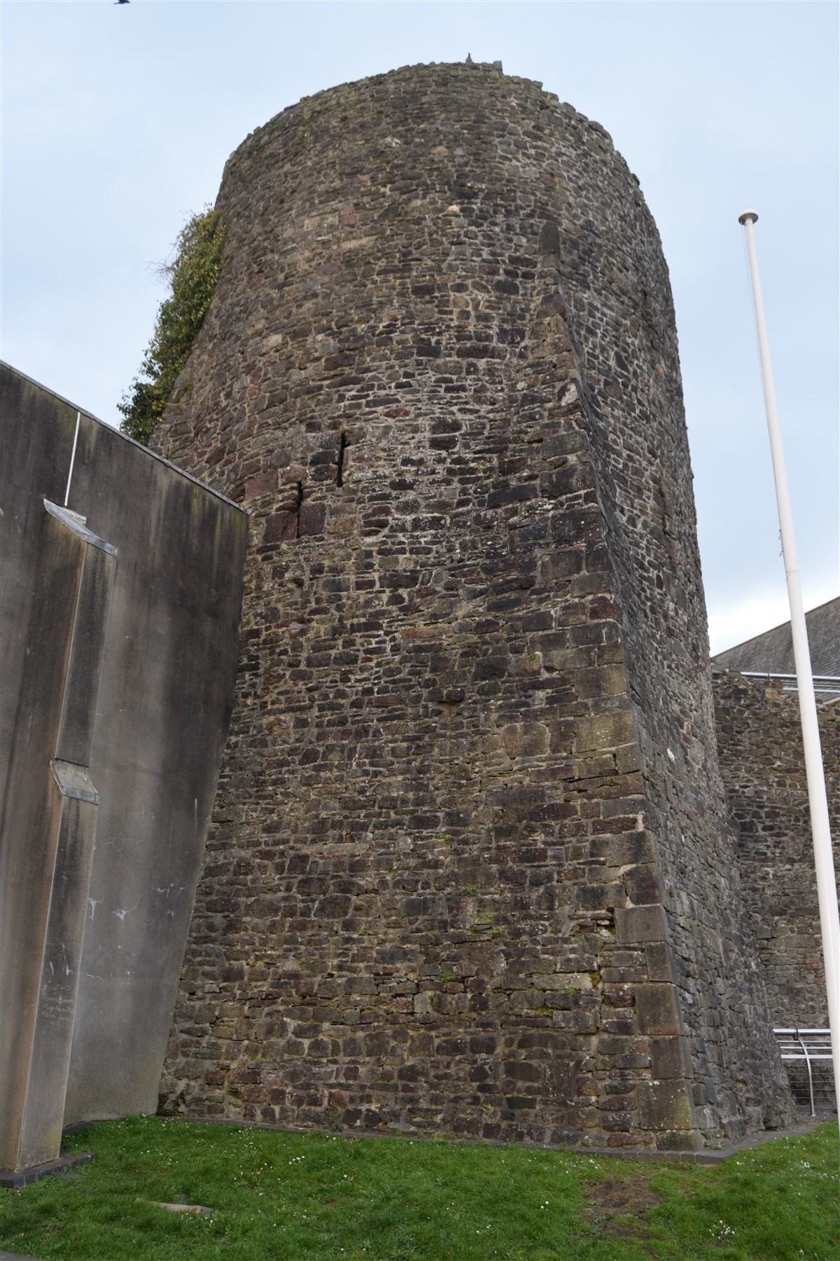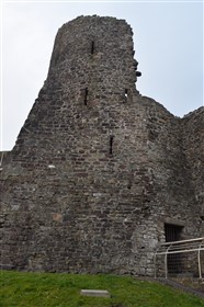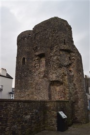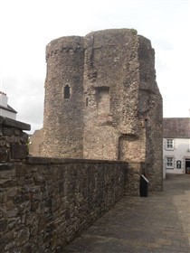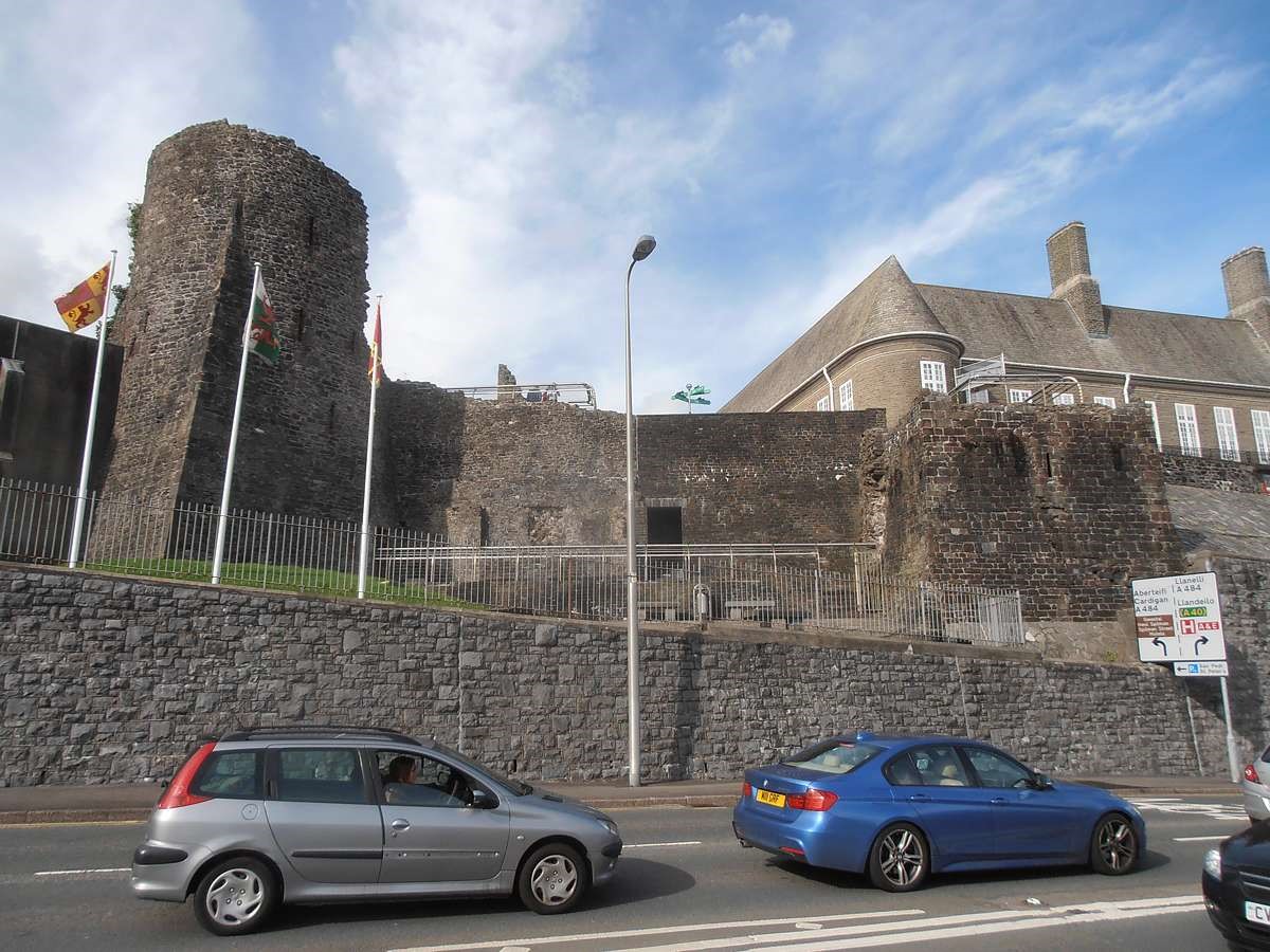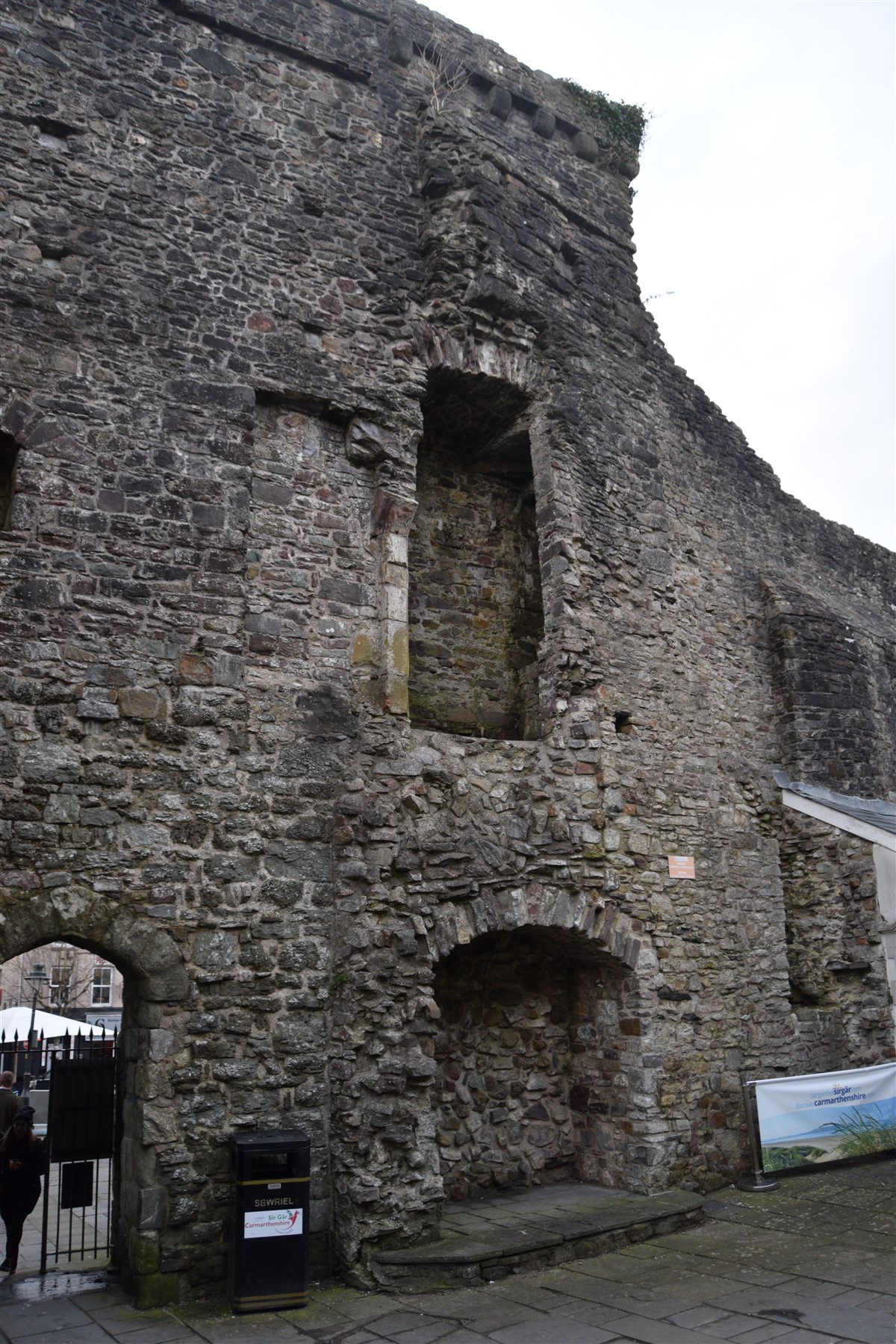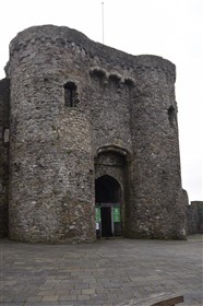 The castle is first mentioned in 1094, when the name Rhyd y Gors is used. The earliest castle, built by the Norman William fitz Baldwin, may have been sited elsewhere perhaps further down the river. After 1105 the annals refer to Carmarthen by name, so by then certainly, the Norman castle was on its present site. The castle evidently became important early on, and passed into the hands of the crown. Carmarthen quickly became the administrative center of south-west Wales, and inevitably underwent a series of attacks and rebuilding episodes during the turbulent struggles between Welsh and English in C12 and C13. Among these episodes was the capture and destruction of the castle by Llywelyn the Great in 1215, after which extensive rebuilding work was undertaken by William Marshal the younger earl of Pembroke, who had re-captured the castle in 1223. It may have been at this period that the massive stone defences were built on the site of the original motte. (James)