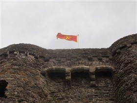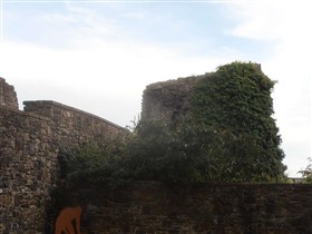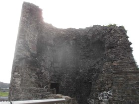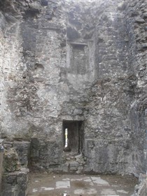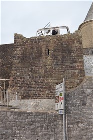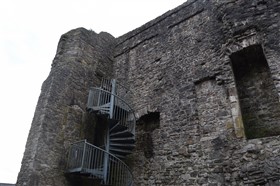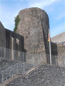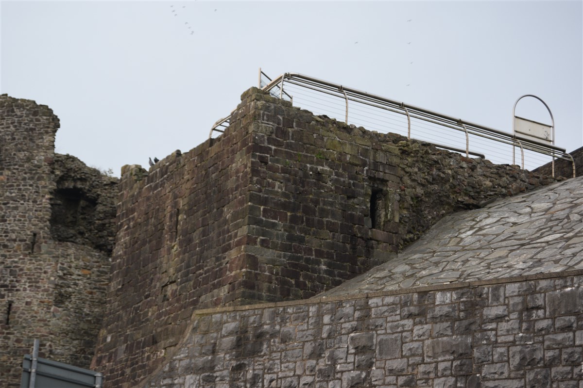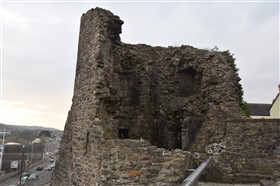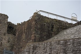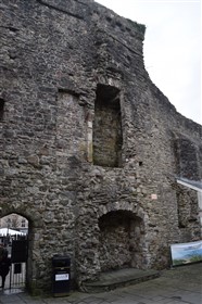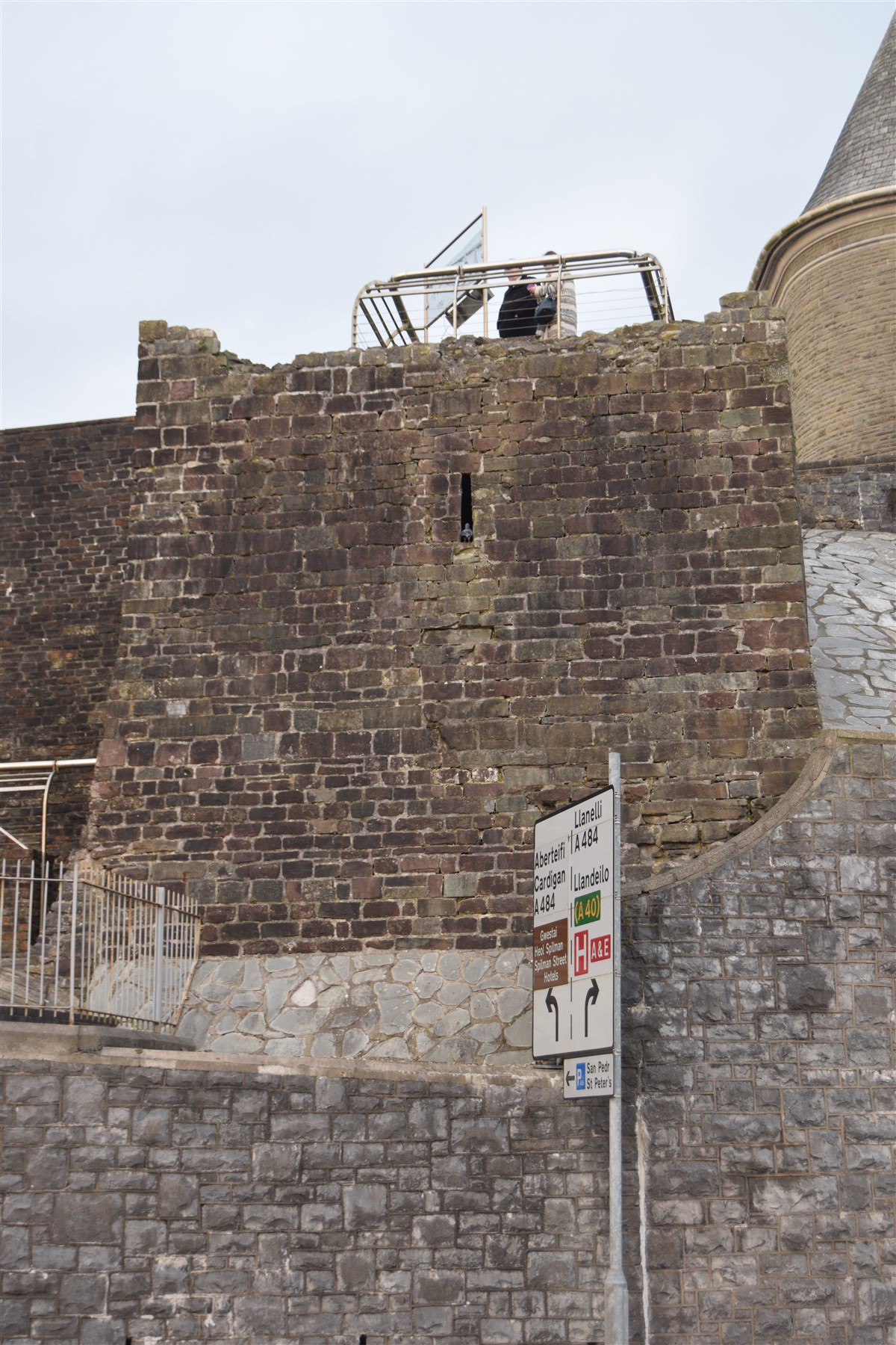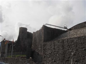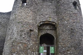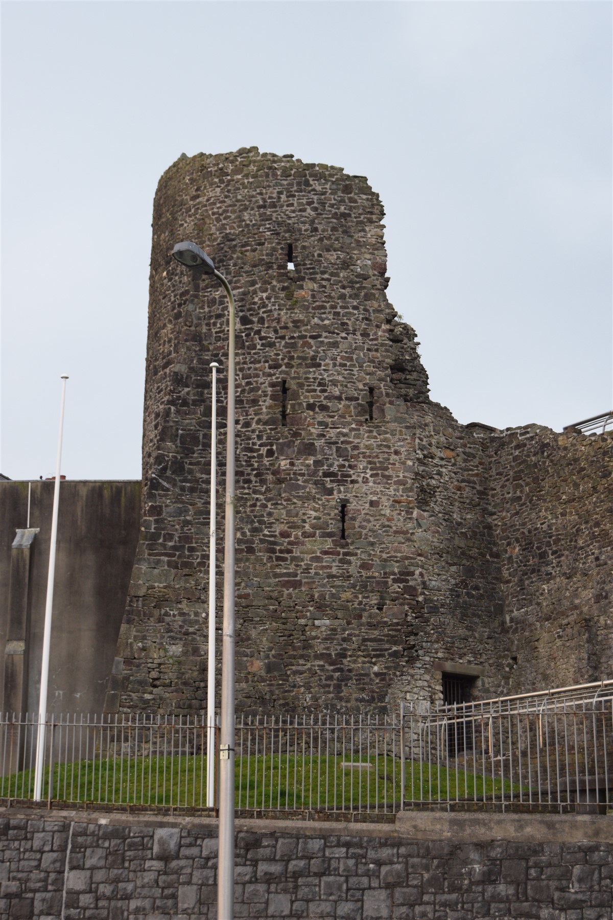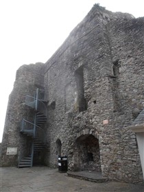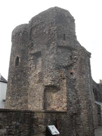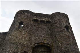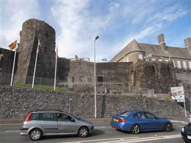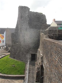 The castle is first mentioned in 1094, when the name Rhyd y Gors is used. The earliest castle, built by the Norman William fitz Baldwin, may have been sited elsewhere perhaps further down the river. After 1105 the annals refer to Carmarthen by name, so by then certainly, the Norman castle was on its present site. The castle evidently became important early on, and passed into the hands of the crown. Carmarthen quickly became the administrative center of south-west Wales, and inevitably underwent a series of attacks and rebuilding episodes during the turbulent struggles between Welsh and English in C12 and C13. Among these episodes was the capture and destruction of the castle by Llywelyn the Great in 1215, after which extensive rebuilding work was undertaken by William Marshal the younger earl of Pembroke, who had re-captured the castle in 1223. It may have been at this period that the massive stone defences were built on the site of the original motte. (James)