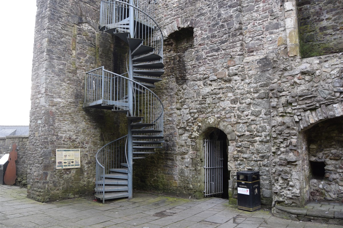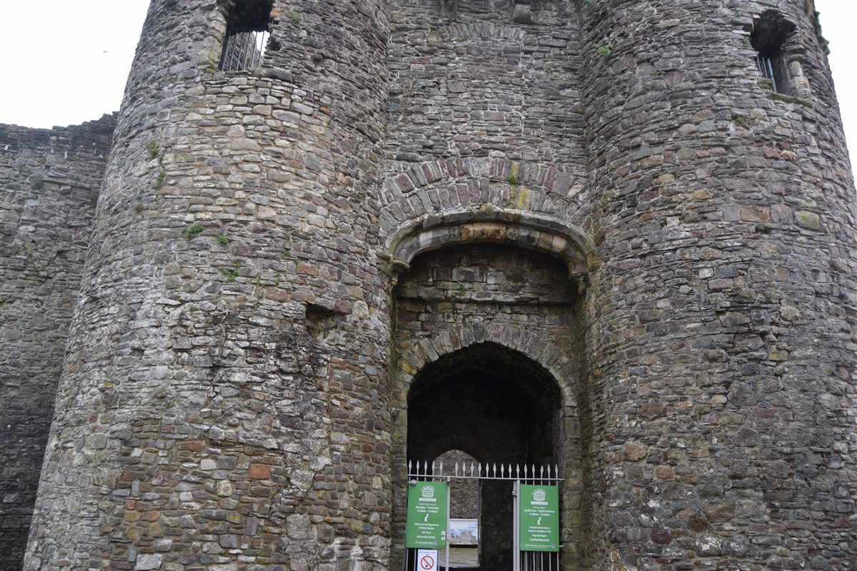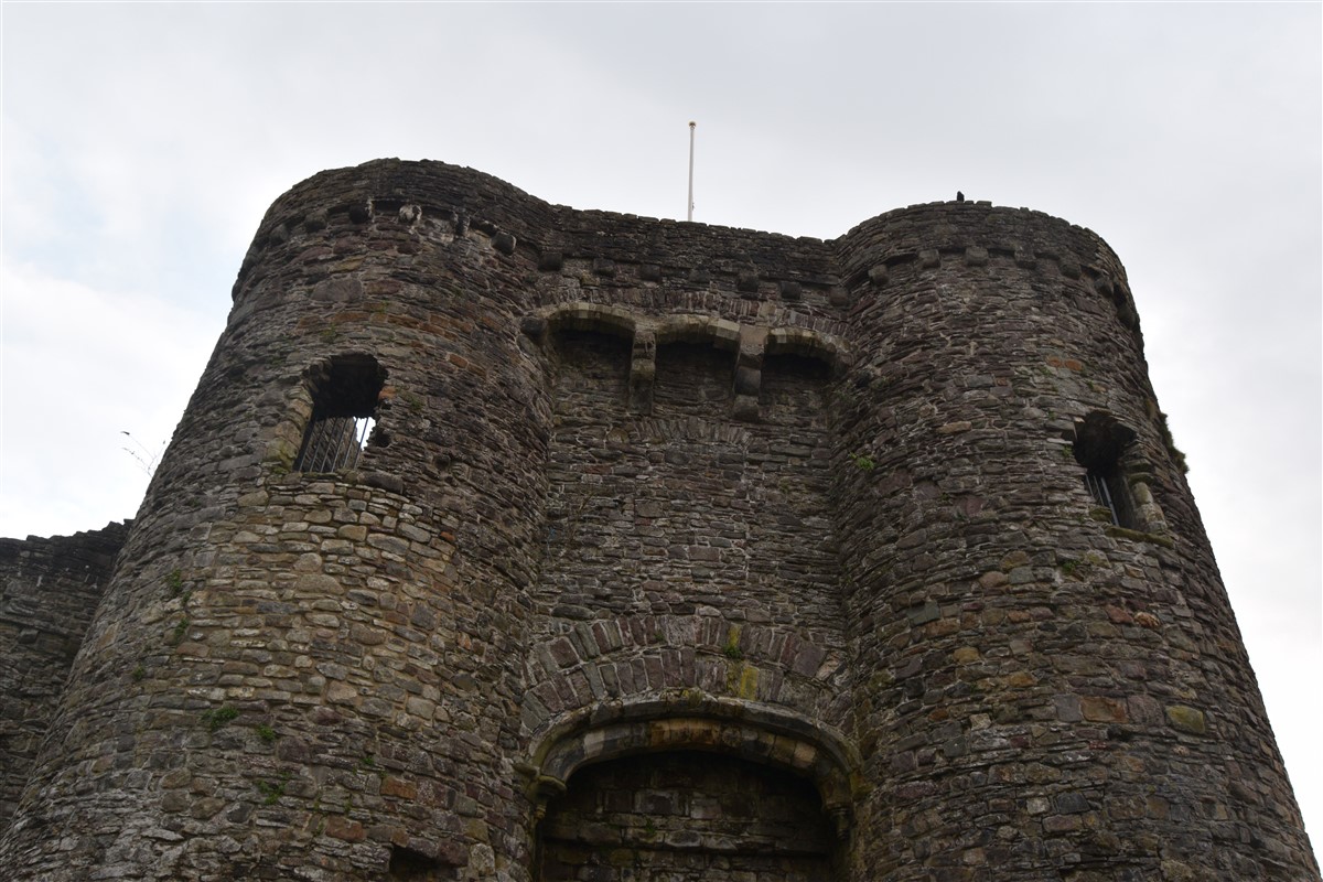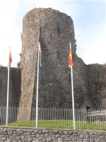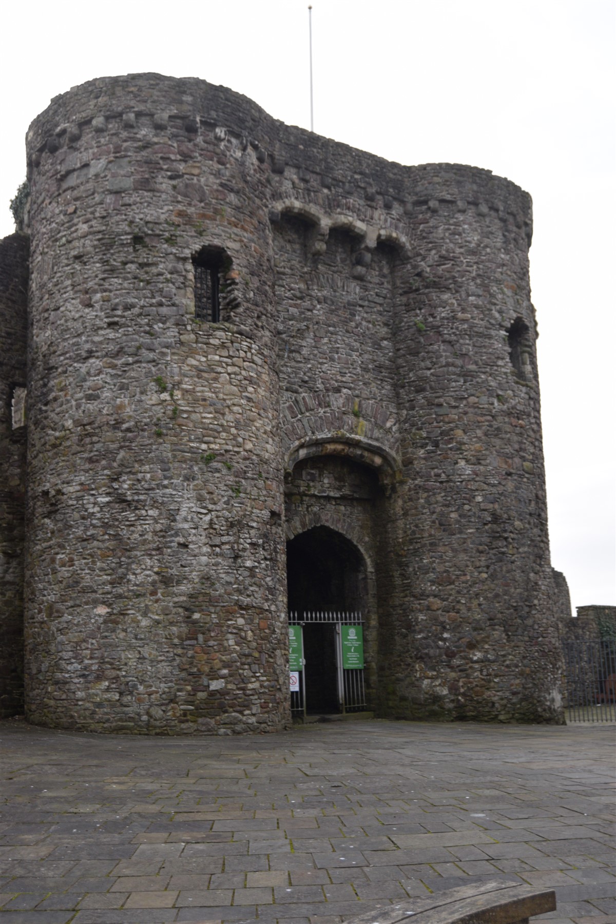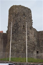 Remains of a rubble masonry castle, mainly C12-C14. Present ruins comprise a stone-revetted motte, twin-towered gatehouse (much altered from a probable 4-cornered gatehouse), a corner tower and wall turret with short sections of curtain wall, all to W of the site. To NW, motte walls have 2 small half-round turrets to N and paired buttresses representing the site of a further turret to W. Heavily repointed and repaired, there is little clear evidence of medieval fabric, the majority of the masonry appearing C19 in date. The curtain wall connecting the motte with the gatehouse is also largely rebuilt. Fine 3-storey rubble masonry gatehouse of c.1400, stylistically similar to Kidwelly Castle, possibly by same mason. Roughly square with paired turrets to façade, flanking large 4-centred gate arch. Gate passage partially blocked internally in C18 as part of gaol. Outer portcullis slot visible. Twin towers with formerly battlemented coping on raised corbel table. The upper floor originally held the constable's chambers and has ashlar traceried trefoil-headed window openings. SW tower possibly late C13, 3 storeys in height with fine angle spur buttresses, rounded exterior and square interior with openings to each storey. Basement has whitewashed interior with chute to SW beneath a 2-centred barrel-vaulted ceiling. SE angle has arched-headed door leading to newel stair access to upper storeys. Modern entrance from the terrace below the castle, inserted following excavation and consolidation in the 1990s. A short section of curtain survives to the east. E of this tower, on the S of the circuit, is the basement of the rectangular Water Tower. The interior is a tall square chamber in whitewashed rubble with a flat stone vault. Narrow openings to each face. S side partly rebuilt in 1960s. (Listed Building Report)