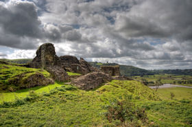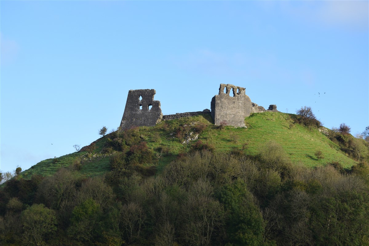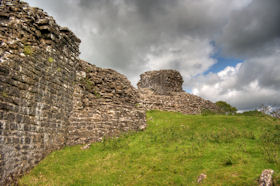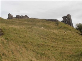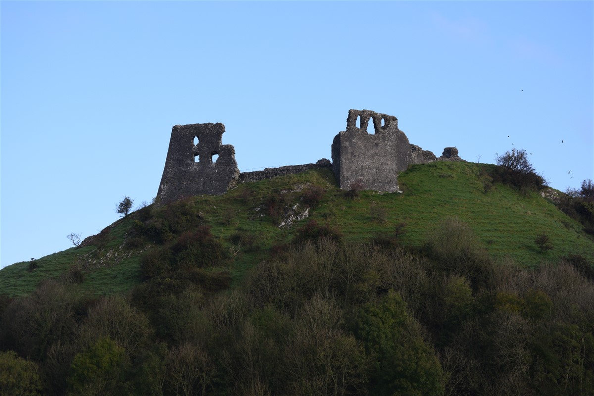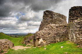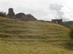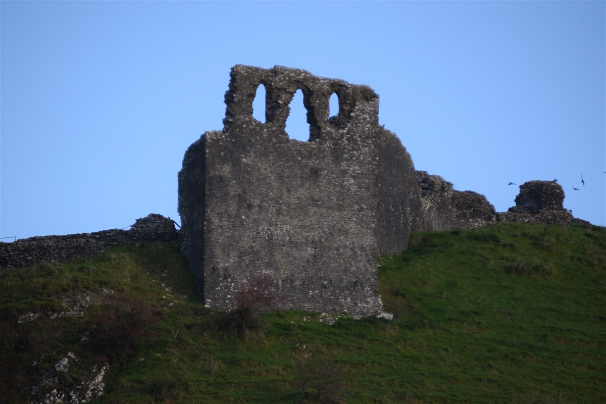 The shattered ruins of a medieval castle crown the ultimate summit of a dramatically isolated and abrupt hill rising from the Tywi floodplain. The castle was founded by a local Welsh prince in the second quarter of the thirteenth century. It was twice expanded before, in 1287, it was captured for the English crown after a desperate and famous siege. A walled borough was now added on the lower summit of the hill (see NPRN 109584) and the castle itself was modified and repaired throughout the following century. The castle was decommissioned in the early fifteenth century and decayed thereafter. It has recently been excavated and the remains are consolidated for public display.
