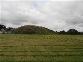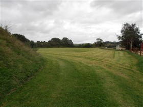 It is oval in shape on plan and measures c. 37m N-S by 46m E-W. The level platform on top of the motte measures c. 10m N-S by 20m E-W and may have supported a masonry structure. The large bailey is roughly rectangular in shape and extends to the S of the motte. It measures c. 75m N-S by 85m E-W. The ditch around the motte and the bank and the ditch around the bailey have been rendered inconspicuous by modern soil movement. (Scheduling Report)