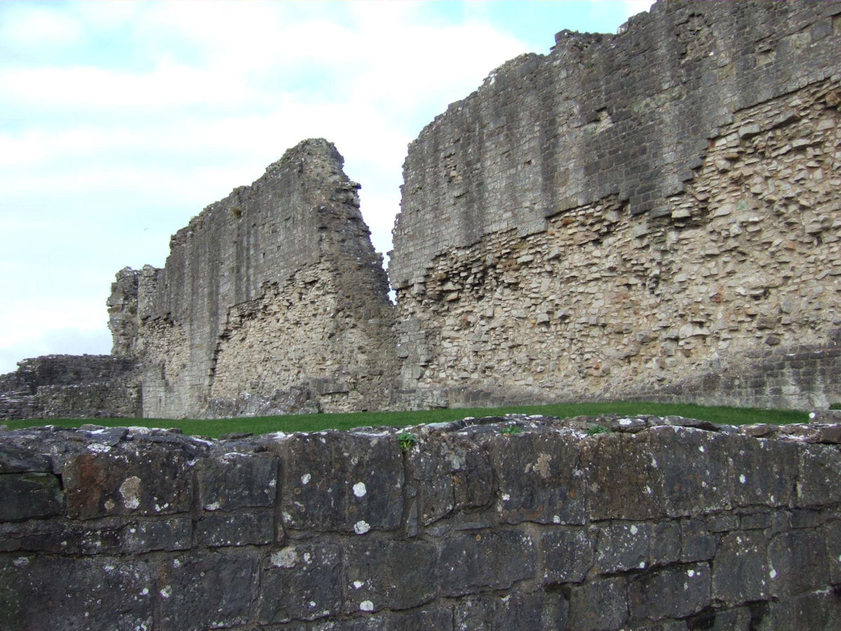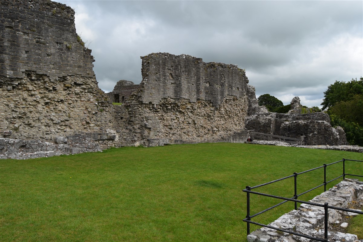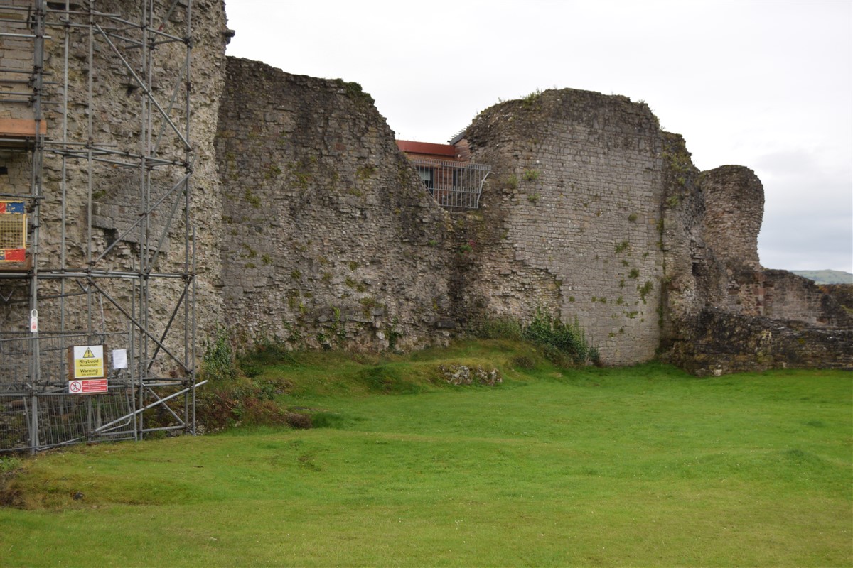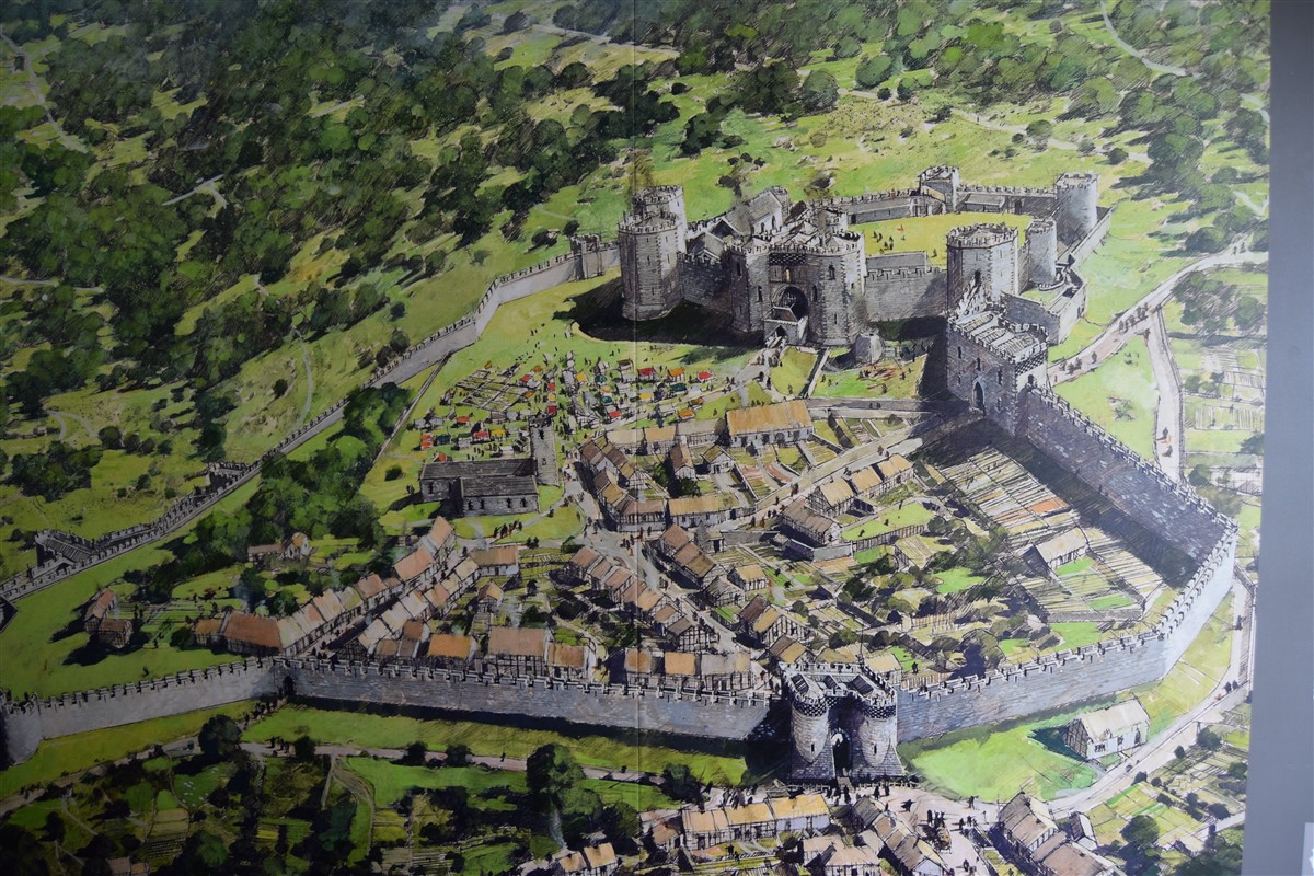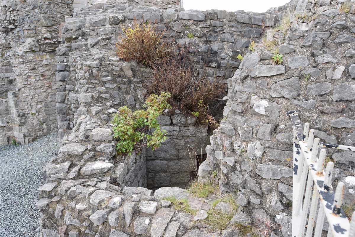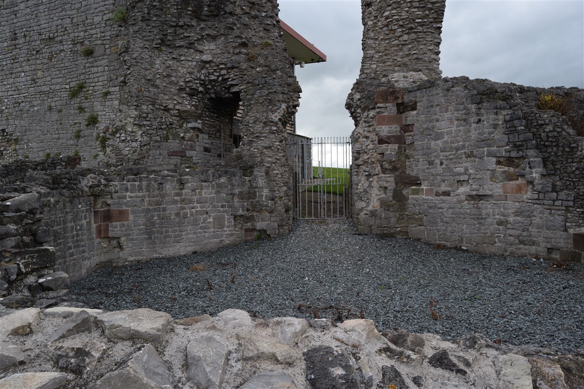 Ruins of a large castle complex; of rough-dressed, limestone construction on rock foundations, with buff, brown and greenish sandstone dressings and smooth limestone facings. The castle consists of a roughly oval enclosure with a main gatehouse at the upper (northern) end and a postern gate to the SE. The southern and western sides form the earliest work and include four drum towers: (from N to S) the Bishop's Tower; the Tower-Next-Treasure House; the Treasure House Tower, and finally the Postern Tower, guarding the Upper (postern) Gate. A large mantlet projects in front of the walls, the section to the W containing an elaborate sallyport and that to the S guarding the postern gate and associated with a large dry moat on this side. The N and E sides represent the second phase and feature a series of large polygonal towers with the gatehouse complex as the focus. The latter consists of 3 conjoined octagonal towers enclosing a central enclosed octagon in a triangular plan. The towers were originally of 3 stages with surmounting battlements and battered plinths; they are known as the Porter's Lodge Tower, the Prison Tower and (to the rear) the Badness Tower. The entrance is between the two front towers and gives onto a heavily-defended a passage formerly with drawbridge, gates and 2 portcullises, together with a series of murder holes and lateral arrow slits. The passage originally led to an octagonal vaulted entrance hall (now open) with the entrance into the castle ward to the R, between the Prison and Badness towers. The Gatehouse is now much ruined and only the Prison Tower retains its upper stage; a former barbican has gone. The front entrance has a multiple four-centred arch which supports a projecting upper stage with chequer-work decoration. In the centre, contained within a trefoil-headed, heavily-moulded niche, is a weathered sculpture of a seated figure, probably Edward Ist. To the W of the gatehouse complex is the remains of the Red Tower. To the SE is the Great Kitchen Tower (later called King Charles' Tower), with the White Chamber Tower beyond. The ruins of the former Great Hall lie against the wall between the two towers with the dais end towards the latter. S of this is a large solar block, known as the Green Chambers; this has a formerly vaulted undercroft with (heavily-weathered) Green Man carving to two springing stones. (Listed Building Report)