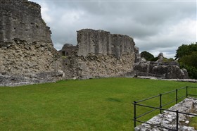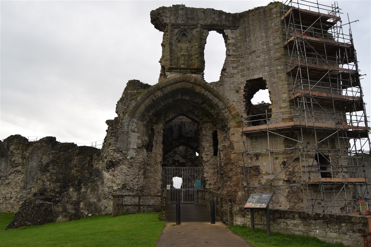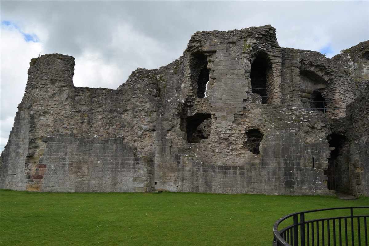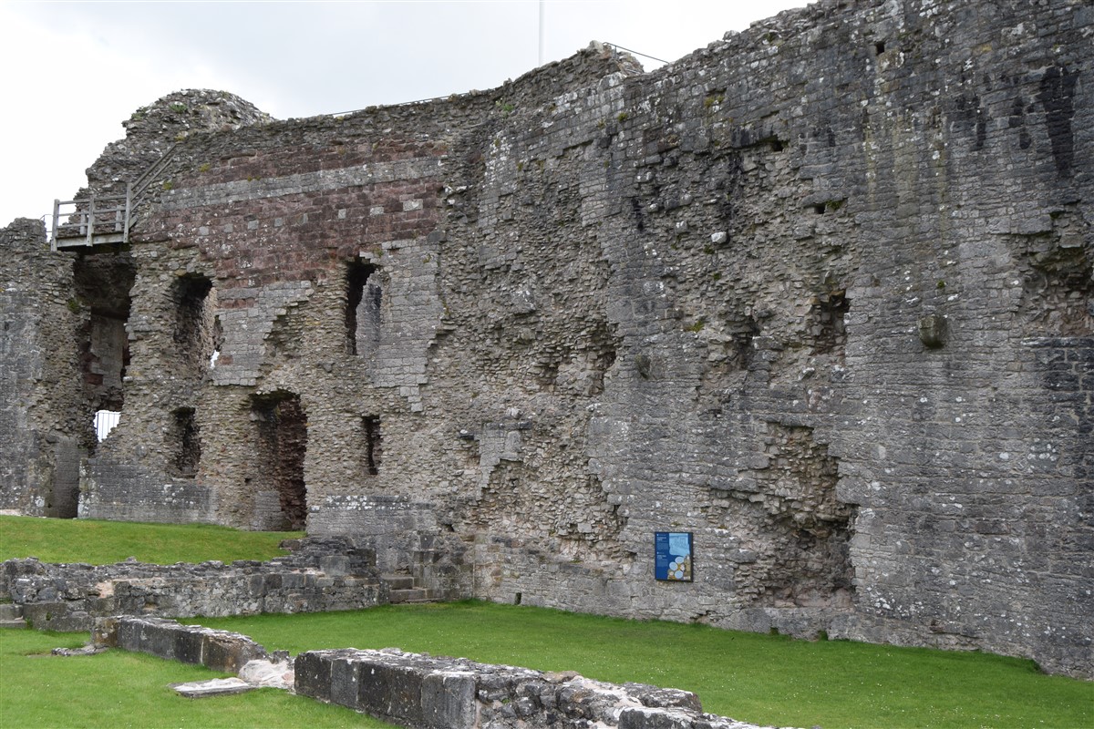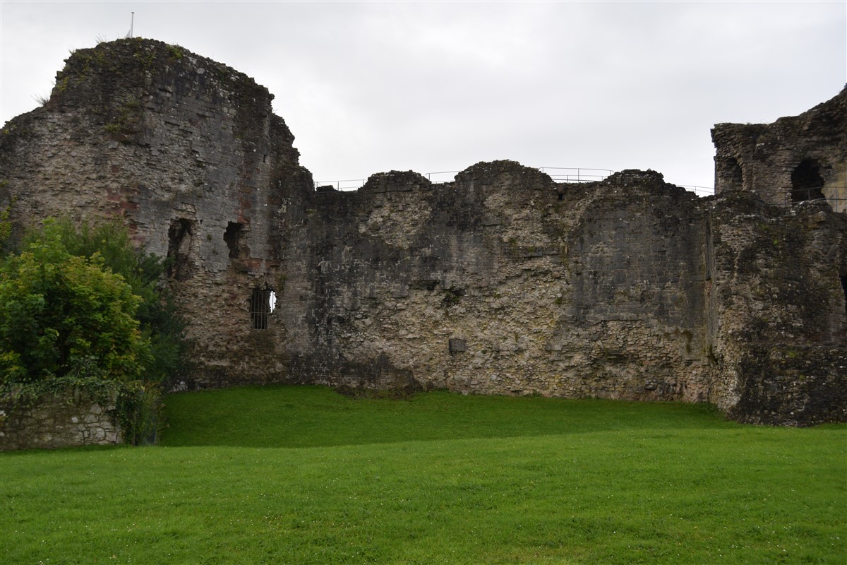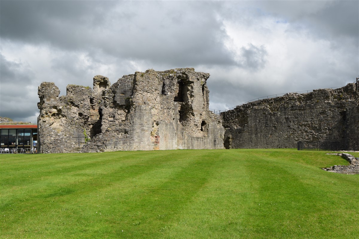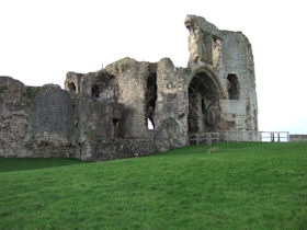 Ruins of a large castle complex; of rough-dressed, limestone construction on rock foundations, with buff, brown and greenish sandstone dressings and smooth limestone facings. The castle consists of a roughly oval enclosure with a main gatehouse at the upper (northern) end and a postern gate to the SE. The southern and western sides form the earliest work and include four drum towers: (from N to S) the Bishop's Tower; the Tower-Next-Treasure House; the Treasure House Tower, and finally the Postern Tower, guarding the Upper (postern) Gate. A large mantlet projects in front of the walls, the section to the W containing an elaborate sallyport and that to the S guarding the postern gate and associated with a large dry moat on this side. The N and E sides represent the second phase and feature a series of large polygonal towers with the gatehouse complex as the focus. The latter consists of 3 conjoined octagonal towers enclosing a central enclosed octagon in a triangular plan. The towers were originally of 3 stages with surmounting battlements and battered plinths; they are known as the Porter's Lodge Tower, the Prison Tower and (to the rear) the Badness Tower. The entrance is between the two front towers and gives onto a heavily-defended a passage formerly with drawbridge, gates and 2 portcullises, together with a series of murder holes and lateral arrow slits. The passage originally led to an octagonal vaulted entrance hall (now open) with the entrance into the castle ward to the R, between the Prison and Badness towers. The Gatehouse is now much ruined and only the Prison Tower retains its upper stage; a former barbican has gone. The front entrance has a multiple four-centred arch which supports a projecting upper stage with chequer-work decoration. In the centre, contained within a trefoil-headed, heavily-moulded niche, is a weathered sculpture of a seated figure, probably Edward Ist. To the W of the gatehouse complex is the remains of the Red Tower. To the SE is the Great Kitchen Tower (later called King Charles' Tower), with the White Chamber Tower beyond. The ruins of the former Great Hall lie against the wall between the two towers with the dais end towards the latter. S of this is a large solar block, known as the Green Chambers; this has a formerly vaulted undercroft with (heavily-weathered) Green Man carving to two springing stones. (Listed Building Report)
