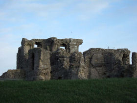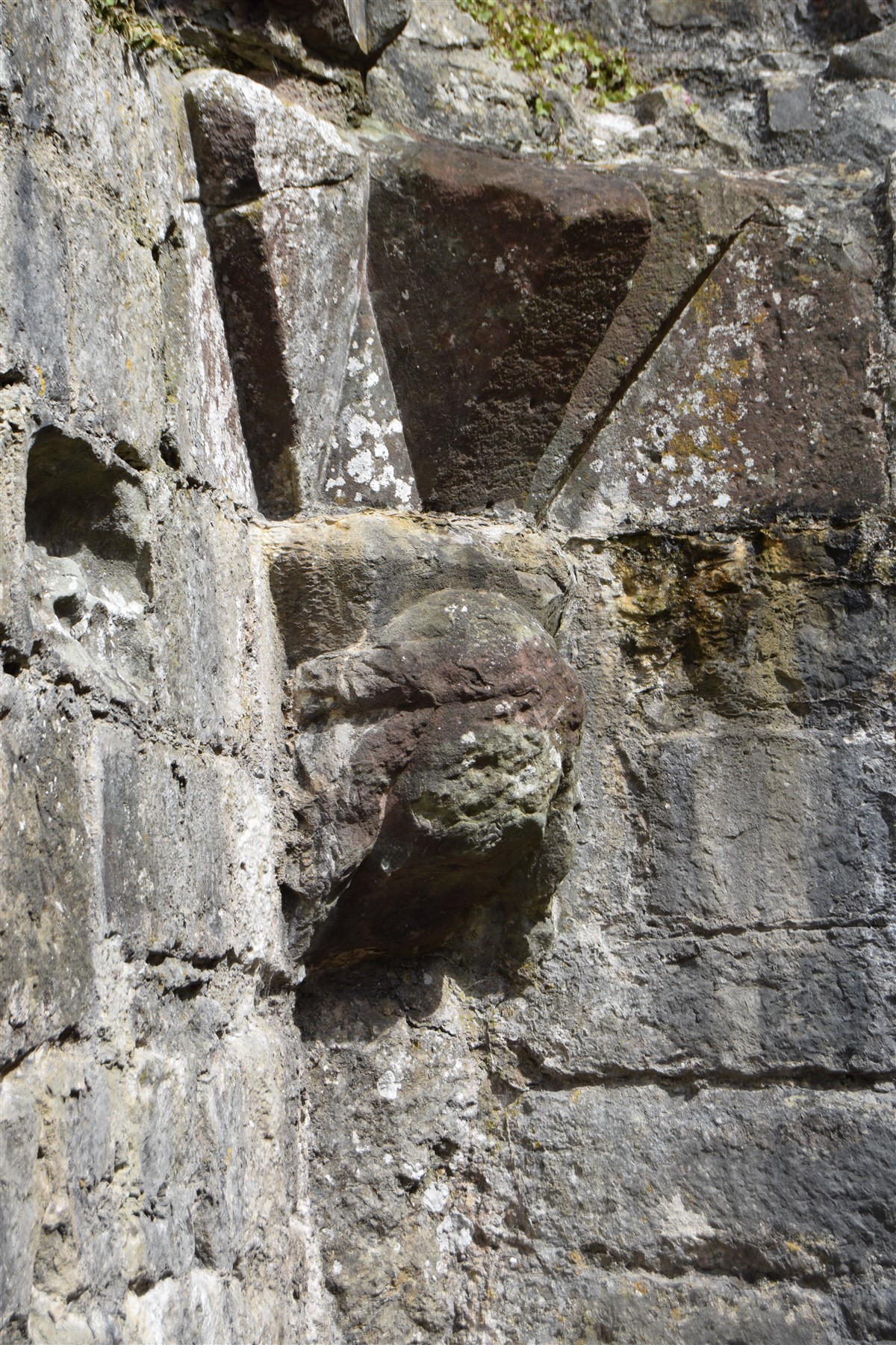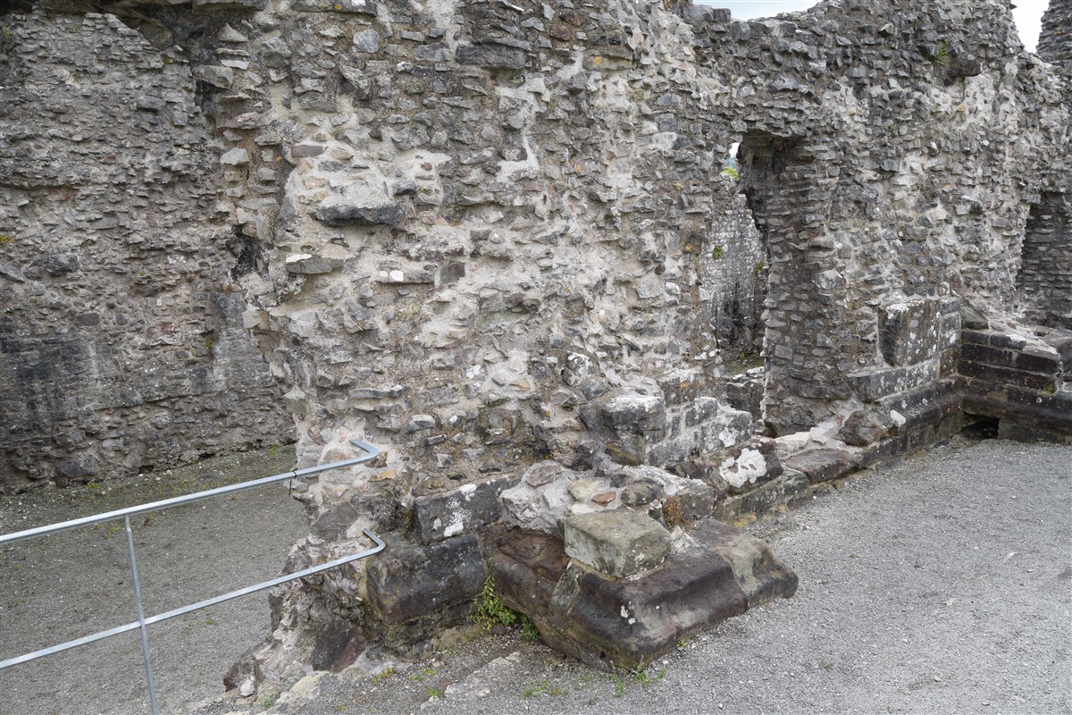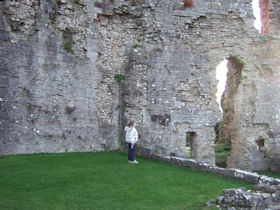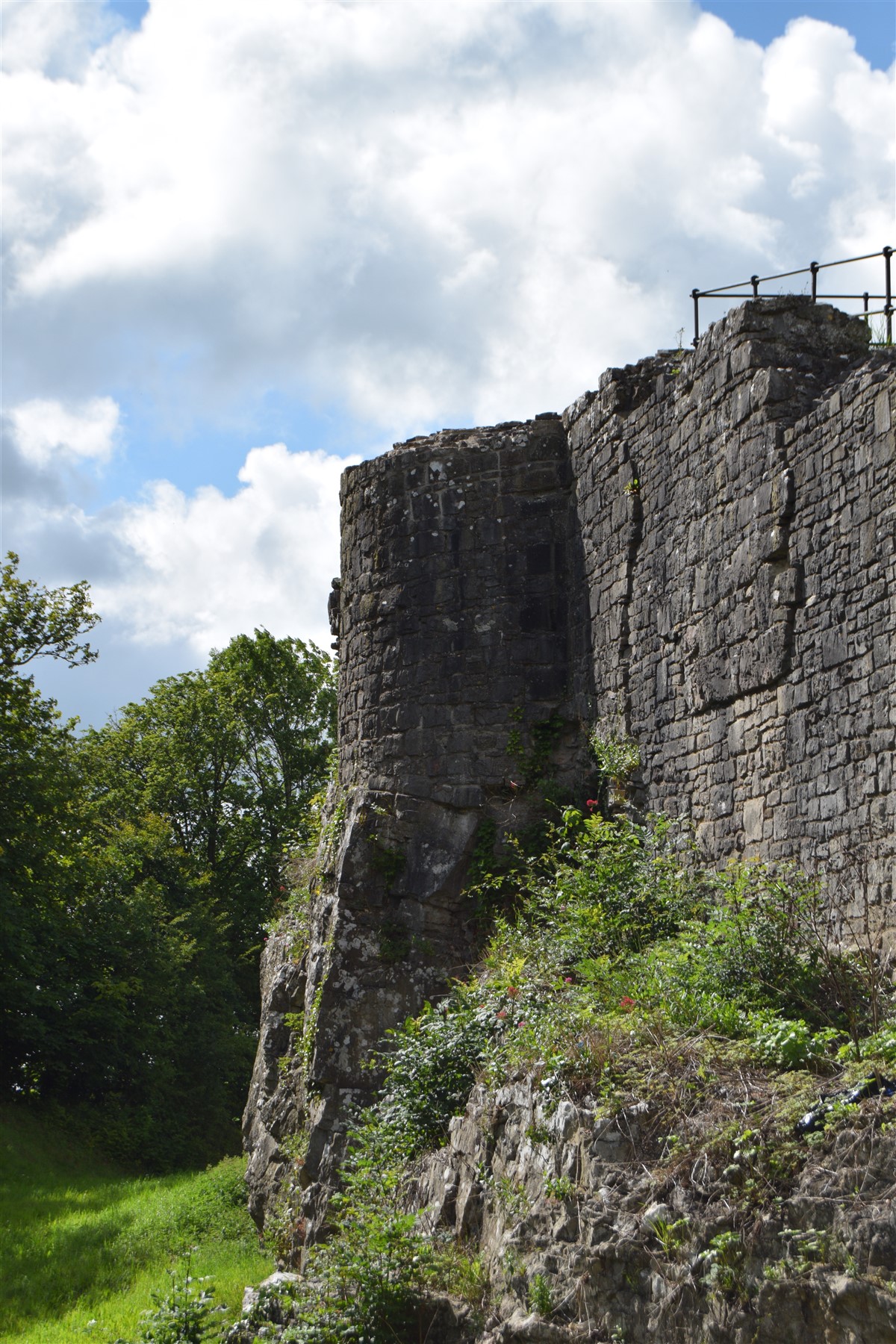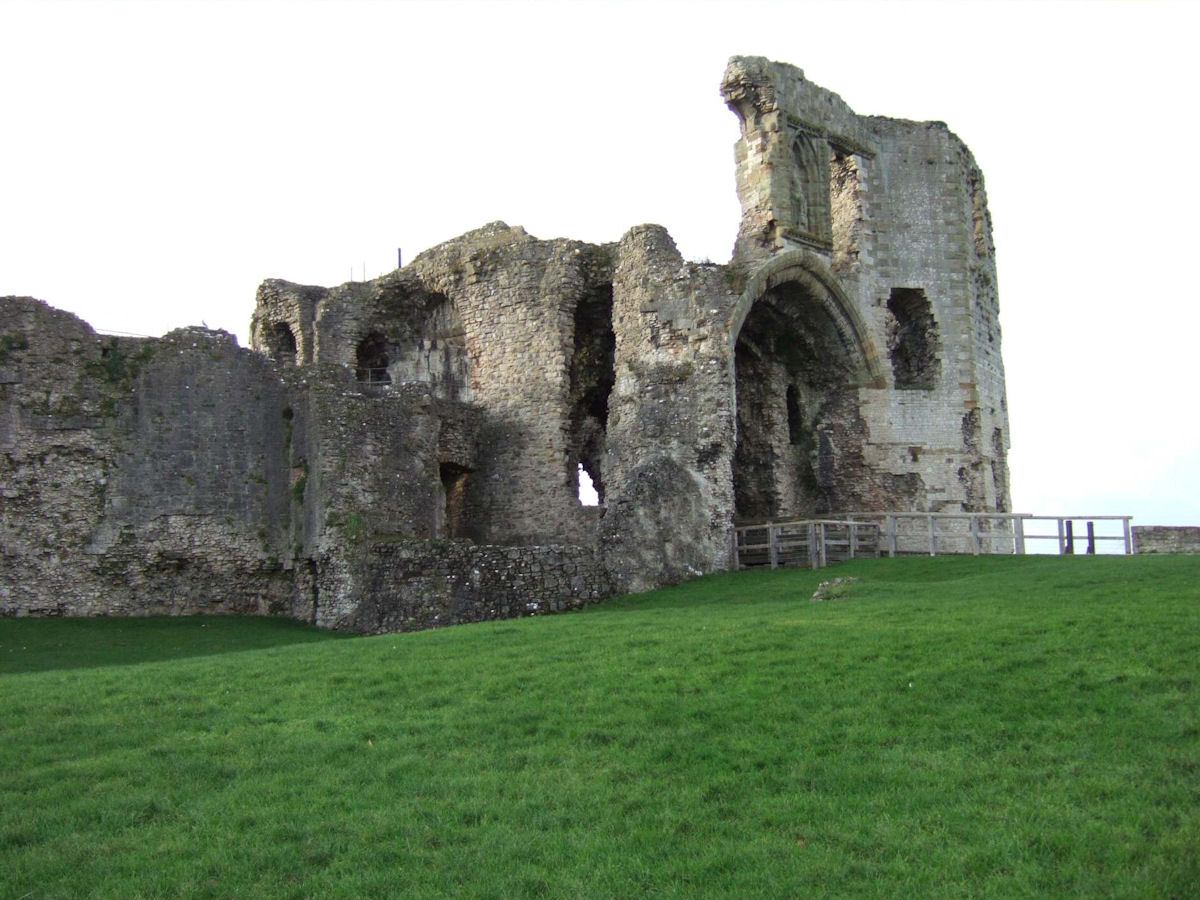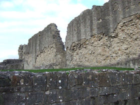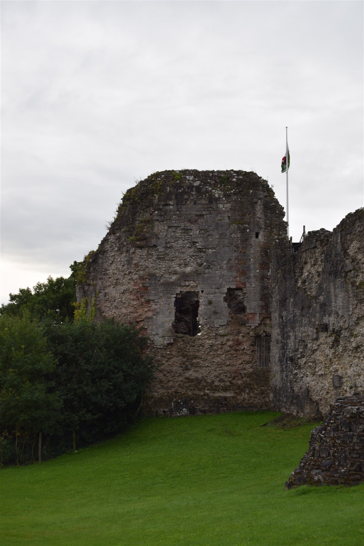 Ruins of a large castle complex; of rough-dressed, limestone construction on rock foundations, with buff, brown and greenish sandstone dressings and smooth limestone facings. The castle consists of a roughly oval enclosure with a main gatehouse at the upper (northern) end and a postern gate to the SE. The southern and western sides form the earliest work and include four drum towers: (from N to S) the Bishop's Tower; the Tower-Next-Treasure House; the Treasure House Tower, and finally the Postern Tower, guarding the Upper (postern) Gate. A large mantlet projects in front of the walls, the section to the W containing an elaborate sallyport and that to the S guarding the postern gate and associated with a large dry moat on this side. The N and E sides represent the second phase and feature a series of large polygonal towers with the gatehouse complex as the focus. The latter consists of 3 conjoined octagonal towers enclosing a central enclosed octagon in a triangular plan. The towers were originally of 3 stages with surmounting battlements and battered plinths; they are known as the Porter's Lodge Tower, the Prison Tower and (to the rear) the Badness Tower. The entrance is between the two front towers and gives onto a heavily-defended a passage formerly with drawbridge, gates and 2 portcullises, together with a series of murder holes and lateral arrow slits. The passage originally led to an octagonal vaulted entrance hall (now open) with the entrance into the castle ward to the R, between the Prison and Badness towers. The Gatehouse is now much ruined and only the Prison Tower retains its upper stage; a former barbican has gone. The front entrance has a multiple four-centred arch which supports a projecting upper stage with chequer-work decoration. In the centre, contained within a trefoil-headed, heavily-moulded niche, is a weathered sculpture of a seated figure, probably Edward Ist. To the W of the gatehouse complex is the remains of the Red Tower. To the SE is the Great Kitchen Tower (later called King Charles' Tower), with the White Chamber Tower beyond. The ruins of the former Great Hall lie against the wall between the two towers with the dais end towards the latter. S of this is a large solar block, known as the Green Chambers; this has a formerly vaulted undercroft with (heavily-weathered) Green Man carving to two springing stones. (Listed Building Report)