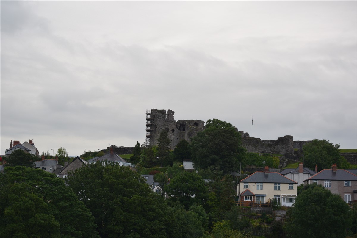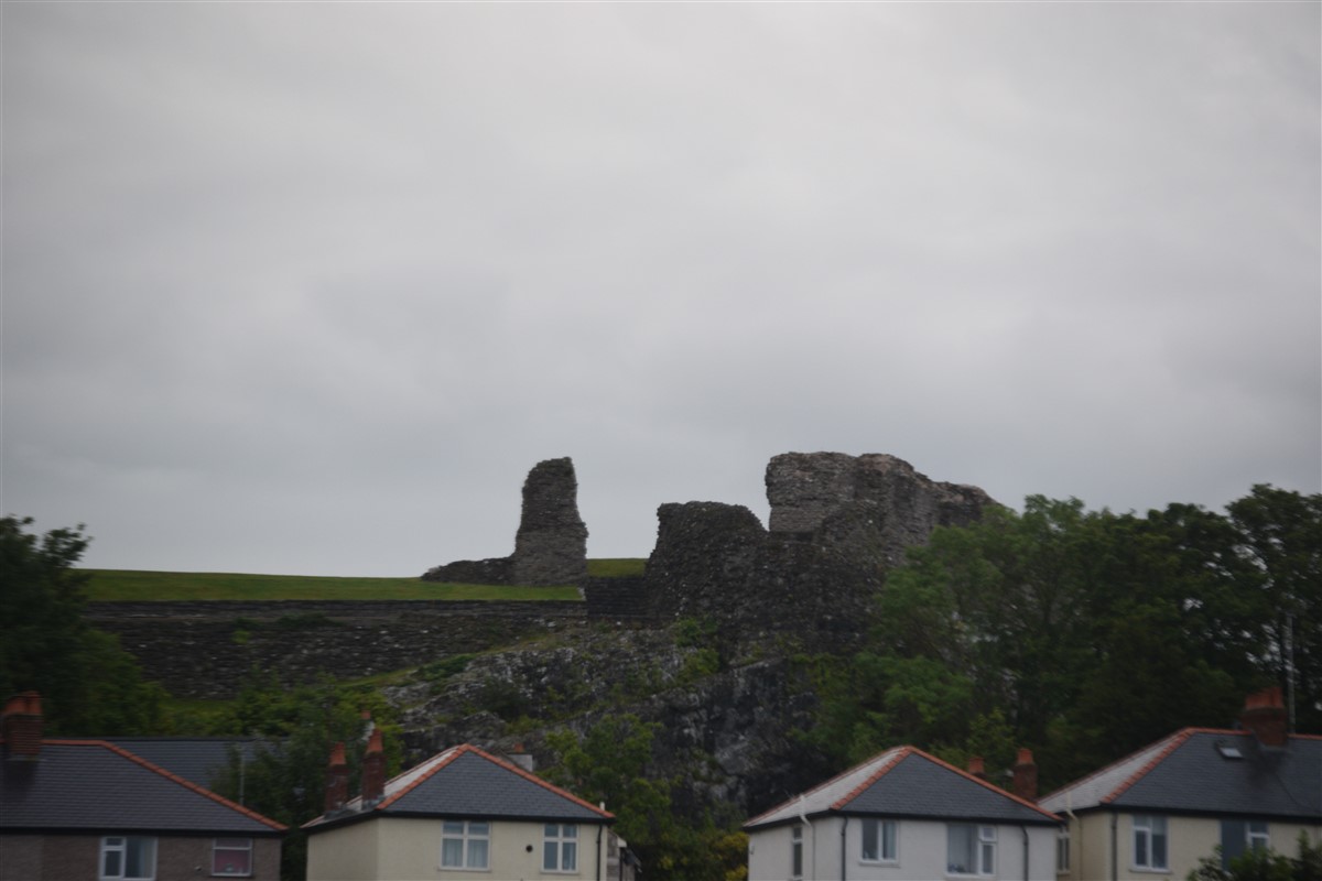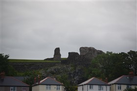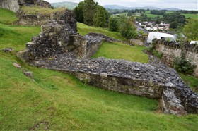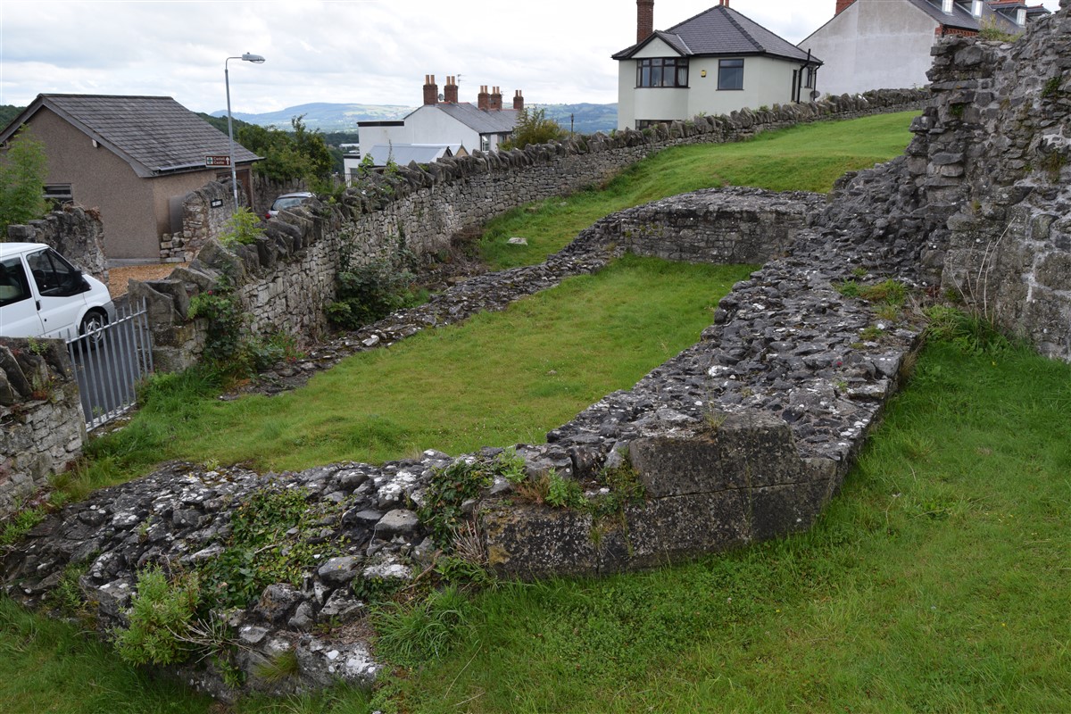 Castle built shortly after 1283 by Henry de Lacy. It stands at the south end of the hill enclosed by the walls. It is an irregular hexagon with towers placed on the angles. The entrance on the north is a three towered building. Castle probably built over the earlier castle of Dafydd, brother of Llywelyn, Prince of Gwynedd. The Norman castle was built as an integral part of the town defences which were built immediately before the castle. Extra defences were added on the south side. The castle was attacked on a number of occasions including in 1460 when it was attacked by Jaspar Tewdwr who burnt the town. By the 16th century it was in decay although it was used as the administrative centre of the region. (Burnham, H 1995, 128-9)