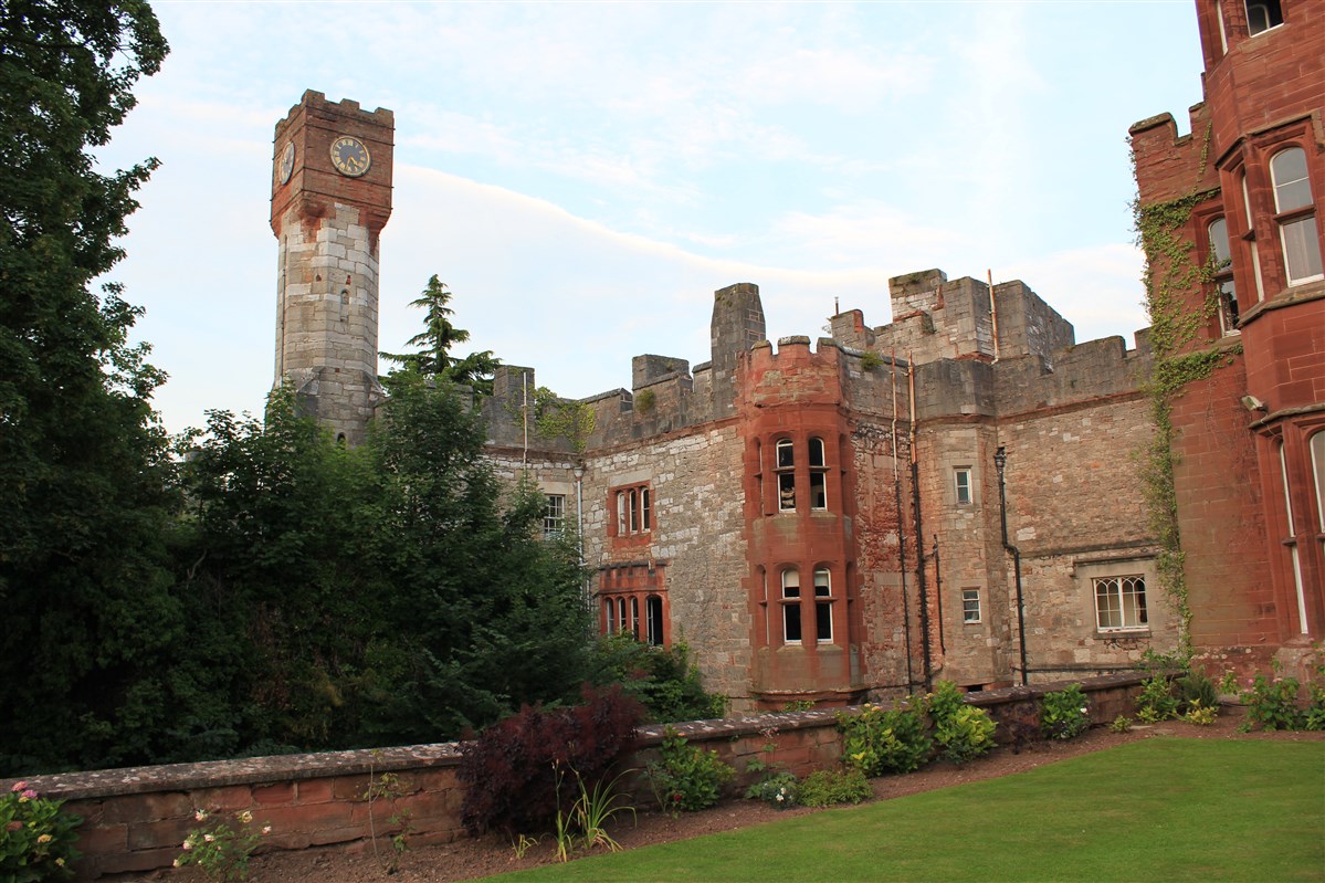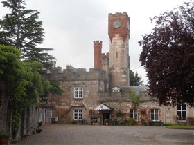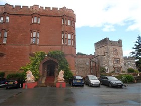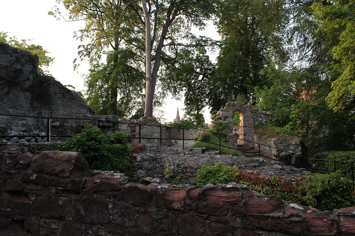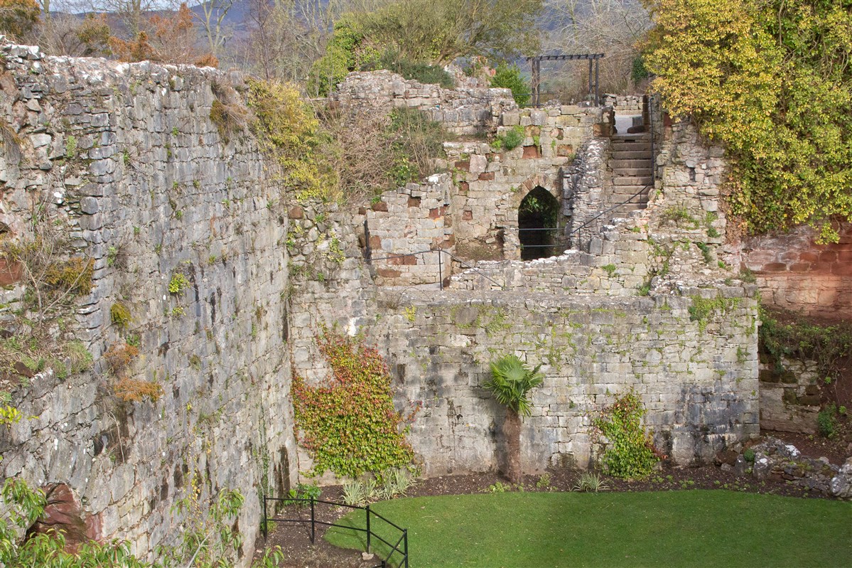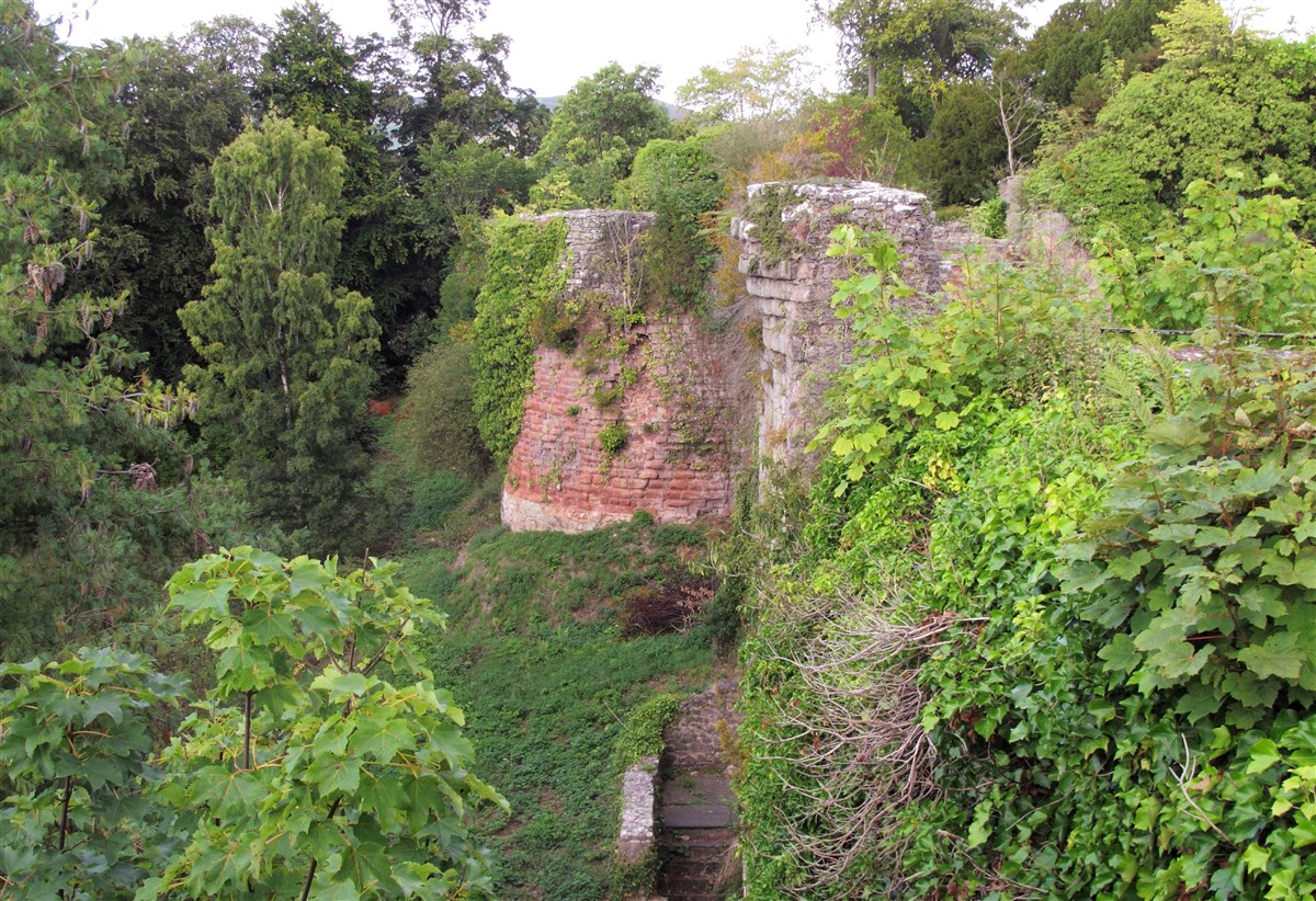 A substantial masonry castle constructed from 1277, presently overlain by a hotel, formerly a private mansion, and incorporated into C19 garden landscaping. The castle consisted of a strong, roughly pentagonal, moated court, c.94m NE-SW by 60m, defined by curtain walls and rounded mural towers, with a twin-towered gate facing SE, away from the unwalled med. town, with a second, subsidiary, similarly defined court, c.52mNE-SW by 60m, adjoining on the SW. Built on a red sandstone ridge during Edward I's campaigns against the Welsh. It has suffered much rebuilding and is now a hotel, however several fairly substantial pieces of C13 work remain, in ruined state, in the hotel grounds. (Coflein)