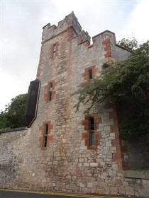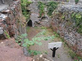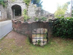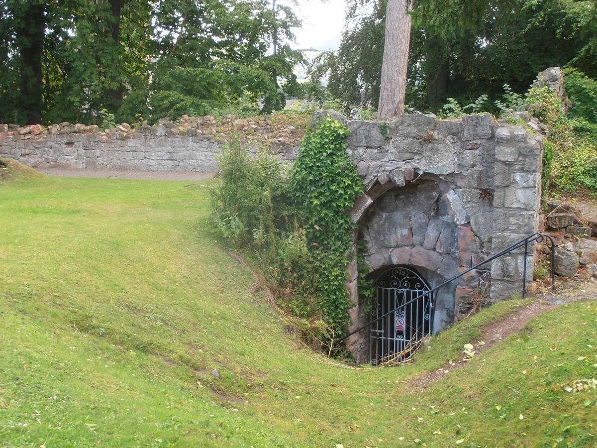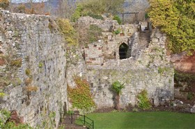 The gatehouse to the E consists of 2 projecting D-shaped towers, that to the E surviving to 1 storey, with a pointed-arched doorway to the straight rear wall. The W tower survives up to 2 storeys high, with 2 denuded Tudor-ached openings to the front. Its E side, and the central entrance have been gothicised: The gateway has a wide Tudor arch of stone voussoirs, containing double cast iron gates with scrollwork, flanked by miniature turrets with pierced quatrefoil decoration, over which are crenellated parapets. The flanking walls step down to L and R, behind which a walkway leads over the gateway, reached by stone steps. At right-angles to L, the E wall of the adjoining tower contains a doorcase with 2 octagonal shafts with capitals, supporting a stone cornice, inside which is an arched boarded door; this is flanked by pointed-arched windows, that to R with a diamond grille, boarded behind. The internal side of this wall forms part of a staggered passageway with gothic detail, including decorative cobbled flooring, which leads from the hotel to the gateway steps. Underneath the medieval towers are a series of chambers, probably including prison cells: these are reached by stone staircases, the vaulted roofs supported by chamfered Tudor-arched transverse ribs. Two chambers survive at ground level on the N side of the entrance towers. The curtain wall running W from the gatehouse joins Ruthin Castle Hotel, its face surviving to the lower parts. It has a small doorway, with Tudor-arched head of stone voussoirs, now infilled. To the NE of the gatehouse, a narrow pointed doorway set at an angle leads to a further section of curtain wall. The NE tower is located at the pointed end of the upper bailey, and survives to a low level; a narrow pointed-arched doorway leads into it. Running towards the W, the curtain wall is better preserved and contains angled slits, including red sandstone blocks with angled oval openings. Turning towards the SW, the high curtain wall has 3 round towers along its length. The NE tower survives about 1m above ground level and contains the base of a winding staircase. The hall is located between the NE and central towers, a large rectangular building with high wall to NW, and low wall to SE. The end walls are not well-preserved, but there is a narrow Tudor-arched doorway to N corner. Between the NW wall and curtain wall was a narrow corridor, possibly containing service areas. It has tall round-arched doorways with red sandstone dressings to each end, and pointed-arched window openings to the curtain wall. However, the NW wall of the hall was gothicised, with crenellated parapets and stepped buttresses to the inner (hall) side. The corridor appears to have been re-used as a garden structure, possibly a hot-house. It had 2 fireplaces with stone lintels to the inner wall, now infilled with brick, recessed arches to both sides, and evidence for a lean-to roof. To the SW, the wall of the central tower stands c1.2m high and has recesses for 4 window openings. Adjacent to this is a probable wheel-pit, with leat in N corner which could have provided water for an overshot wheel. This structure could have been associated with the castle entrance, a mill within the castle, or a C19 garden feature. Beyond the central tower is the lower bailey, the ground level falling sharply, and with spiral and straight stairs leading down. At the bottom, the curtain wall contains a low postern gate (visible from outside), and a gateway to its SW, a wide archway of stone voussoirs, with grooves for a portcullis; there is evidence for a tower structure above this. The curtain wall was partly damaged during the Civil War. The SW tower was rebuilt in red sandstone in the mid C19, and forms part of the formal gardens of Ruthin Castle Hotel. A wall runs SE from the tower and then terminates. (Listed Building Report)