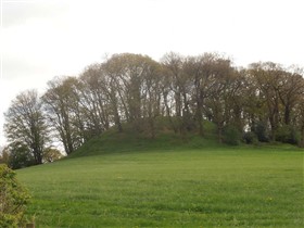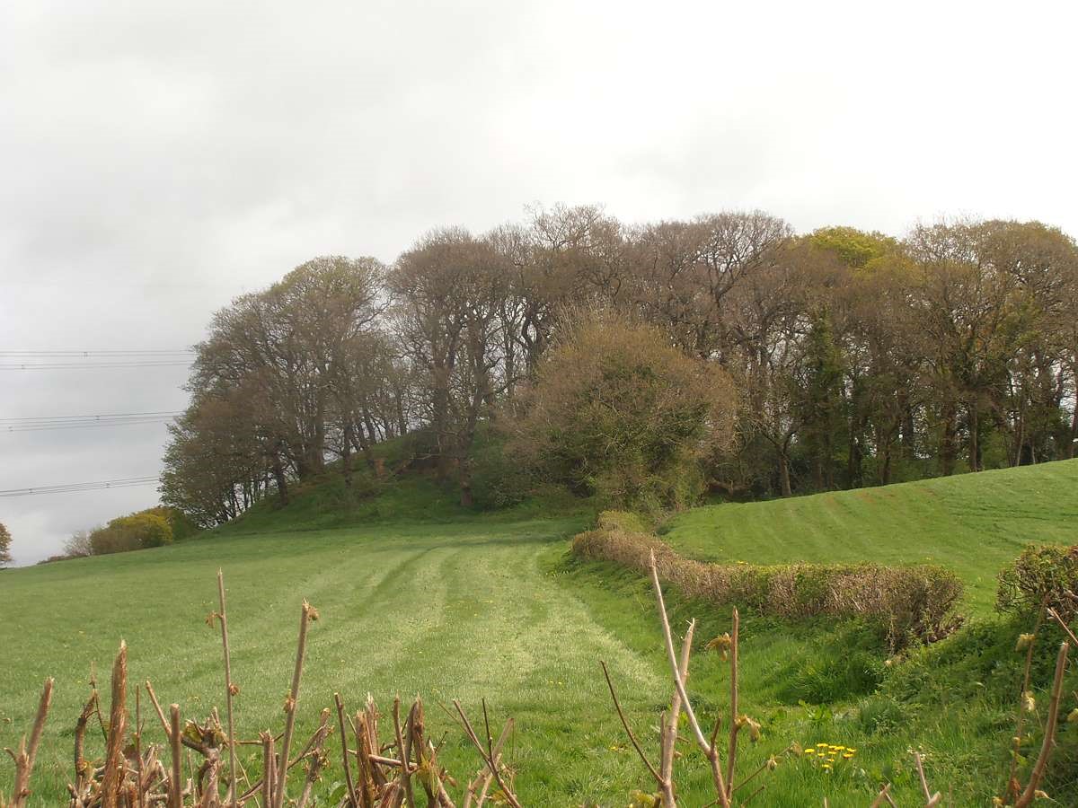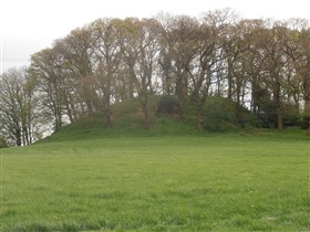 The monument comprises the remains of a motte and bailey castle, a military stronghold built during the medieval period. A motte and bailey castle comprises a large conical or pyramidal mound of soil or stone (the motte) surrounded by, or adjacent to, one or more embanked enclosures (the bailey). Both may be surrounded by wet or dry ditches and could be further strengthened with palisades, revetments, and/or a tower on top of the motte. The motte is roughly circular and stands to a height of 30ft with a flattened top, which measures 90ft in diameter. The ditch on west side rises 15ft to the counterscarp and on the south side of motte, a spur of high ground runs south. This is separated from the field to the west by the ditch which measures 15ft deep with a small stream at the bottom, and from the field to the east by a wide ditch rising 10ft to field boundary. (Scheduling Report)