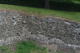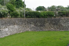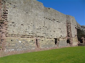 Concentric plan with inner and outer wards. The outer ward is enclosed by a wide dry moat, and is protected to the S by a river wall and tower. The moat was originally crossed at two points - at the Town Gate (the present entrance from Castle Street), and at the SE at the Priory Gate (converted into a turret in 1300). The sides of the moat were revetted in stone, most of which survives. The outer curtain wall is fragmentary, but remains of turrets containing steps leading down to former sallyports in the moat survive. The ward slopes down to the river to the SW, and at its furthest point is the square, 4-storeyed Gillot's Tower, with a postern alongside it. The inner ward is of lozenge plan, and has a single circular tower at the N and S corners, and double-towered gatehouses at the E and W angles. Curtain walls survive to the level of the wall walks between the towers, and have embrasured slits at ground level. The parapets have largely disappeared, but a fragment of battlement survives in the NE wall, and the SW and SE walls retain traces of central corbelled turrets. The towers were 4 storeyed, and the S tower, and the W gatehouse towers survive almost to their full height. E gatehouse has portcullis grooves and gate chases. The original system of loopholes survives in its N guardroom, interrupted to the S by the insertion of a fireplace at the beginning of the C14. Inside the ward, the domestic buildings were of timber, and have all been lost. (Listed Building Report)