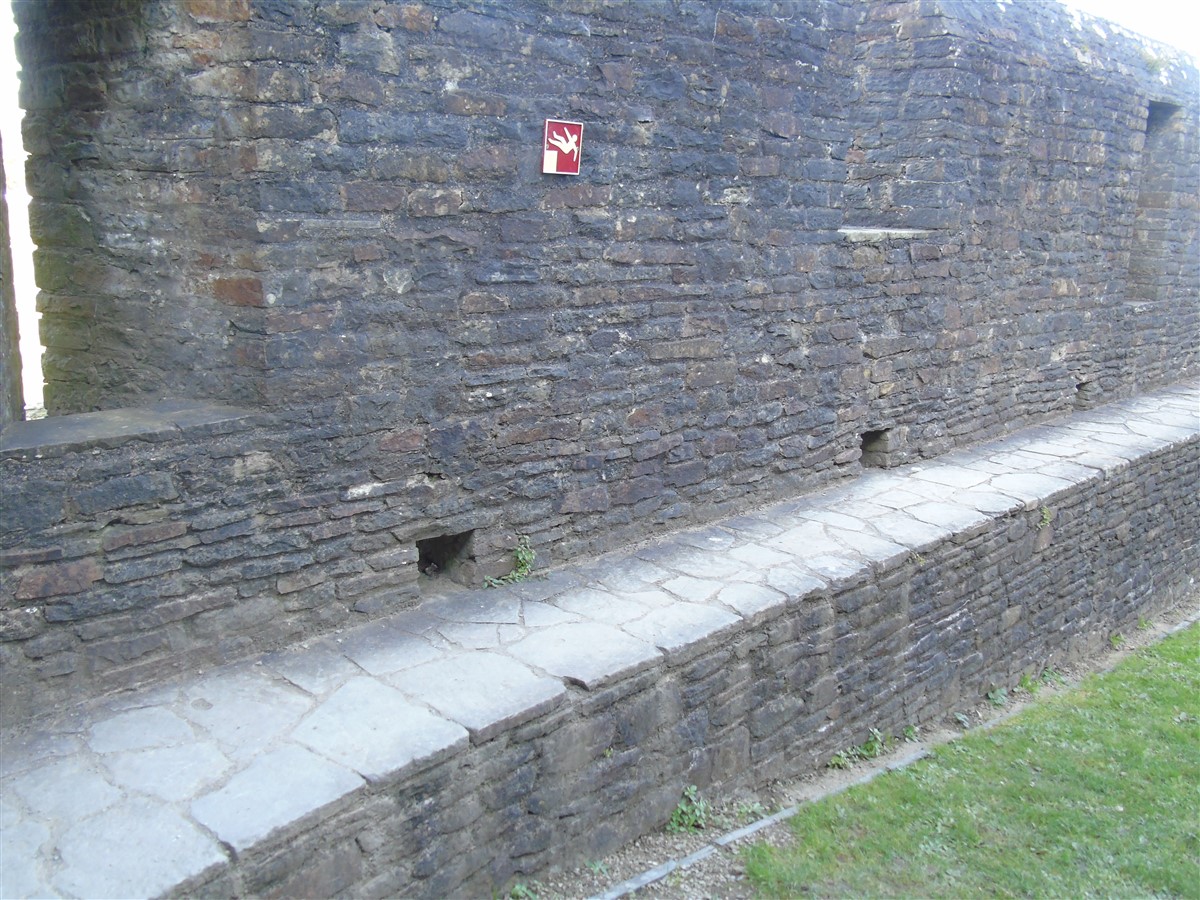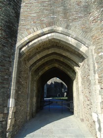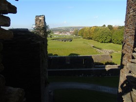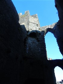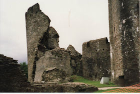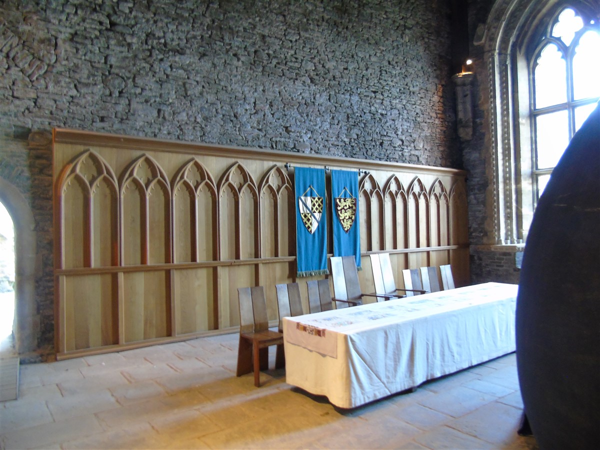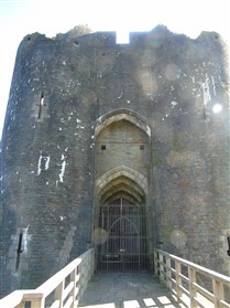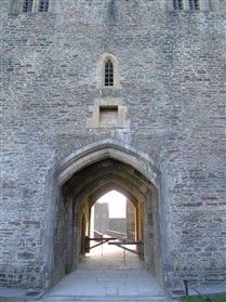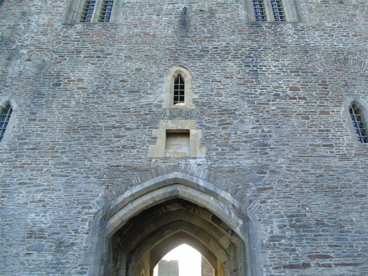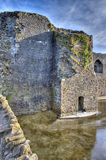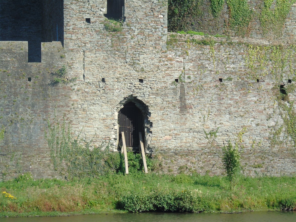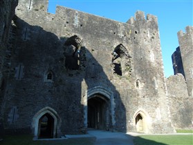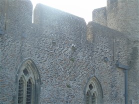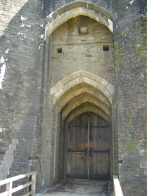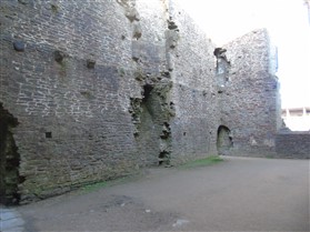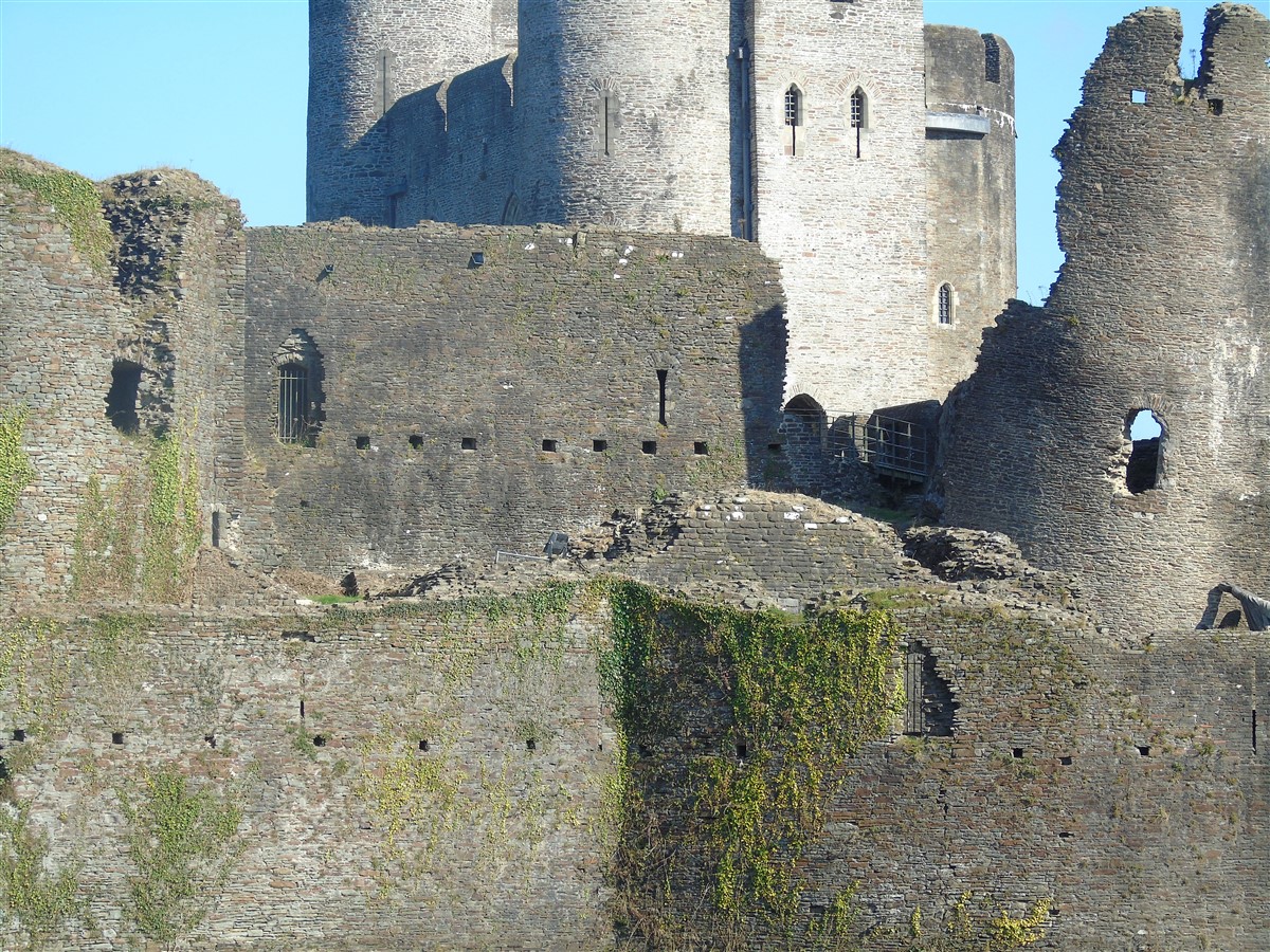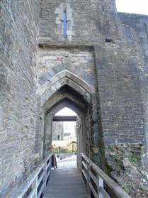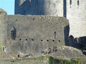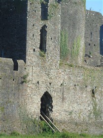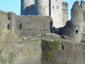The castle is built upon the principle of concentric fortifications, with an inner ward and middle ward surrounded by a moat, dams, two great lakes and outer defences. The inner and middle wards are rectangular in plan with round angle towers and large twin-towered gatehouses to the E and W. An outer gatehouse to the E forms the main entrance and is flanked by fortifications along the N and S dams. The massive battlemented walls are mainly constructed of local pennant sandstone, with some red sandstone and blue lias limestone. The doorways have shallow pointed arches, and the original structures have trefoil-headed lancet windows and arrow slits with small circles at the base. Dressings are of Sutton stone and the style of mouldings can be related to the chronological development of the castle. The only exception is Despenser's great hall where the dressings are of Jurassic limestone from Bristol. The inner ward is an open courtyard with a well in the centre. The great hall and chambers are to the S, gatehouses to the E and W, and a wall-walk to the N. The great hall is the most highly embellished of all the structures in the castle. The exterior wall, facing into the courtyard, has been refaced in ashlar. It contains 2 pairs of tall 2-light windows with pointed ogee heads and a doorway to the L. Inside the hall, the arched brace roof is late C19. The trusses are supported on the early C14 corbels which consist of 3 long filleted shafts, with bell capitals and stops depicting 3 heads (the King and his courtiers). The corbels and recesses of an earlier roof structure also survive: the corbels are short with roll mouldings. The window reveals are decorated with C14 ball flower ornament. Between the 2 pairs of windows is a large fireplace but the dressings are missing. The E, S, and N walls contain blocked openings showing that the hall was altered in the C13 - 14. To the S of the hall at a high level is a covered vaulted passage (known as the Braose passage) which was originally open. A large infilled archway in the E wall now contains a doorway into a late C20 kitchen. A doorway to its L is original and leads to a room with 2 large fireplaces. To the W, a doorway with broach stops to the jambs leads into 2 large ruined chambers, also much altered: the chambers are irregular in shape, over 2 storeys high, roofless and contain the remains of domestic fireplaces. Tall windows face into the courtyard, mainly ruined, one with the remains of a traceried head in a grey stone dressing. The E gatehouse forms the main entrance to the inner ward and is the most strongly defended structure in the castle. It is a 3-storey block flanked by projecting round towers (the outer face rebuilt in early C20). Central pointed-arched entrance with chamfered dressed jambs. The towers have arrow slits at 5 levels. Small projections to N and S housing doorways leading to wall-walks. Above and flanking the inner doorway, and also to the exterior, are small trefoil-headed lancets. Two large windows to interior 2nd floor, each with 2 trefoiled lights and a quatrefoil. The upper floors of the gatehouse are thought to have been the private apartments of Gilbert de Clare's constable. The 2nd floor is continuous across the gatehouse and has a large fireplace with raked hood on corbels against the W wall. The floor does not survive. Side chamber with quadripartite vault and heavy chamfered ribs. The inner W gatehouse is smaller than the inner E gatehouse but in similar style. It is 2-storey with projecting round towers to the exterior and a flat wall to the interior (E) side. The entrance is flanked by 2 low doorways to the interior side, most of the dressings C20, which provide access to the towers. Two large ruined windows under relieving arches to upper storey. The towers have arrow slits at 4 levels. The lower chambers are vaulted, with heavy ribs supported on bell-shaped capitals. The 1st floor of the gatehouse is open, and has concrete beams on concrete corbels in place of the ceiling. Remains of stairs in N tower. Of the angle-towers of the inner ward, the NW and SW towers stand full-height but were reconstructed in the early C20. They have lancets and arrow slits as in the gatehouses. The upper 2 floors of each tower contained accommodation, whilst the lower floor was for defence purposes and storage. The NW tower has mural stairs to the R of the entrance and a garderobe to the L. The window openings have wide internal splays, shallow pointed heads and occasional window seats. The 2nd floor has a large ornate fireplace with square head and raked hood, partly reconstructed. The 1st floor fireplace is plainer with a flat lintel. The SW tower has lost its floors but an opening leads to the Braose gallery which runs behind the great hall and on to the SE tower. The SE tower is ruined (though part stands full height), and leans outwards at an angle of about 10°. It was not restored by the Bute family so is important for retaining original detail. Very little survives of the NE tower: part of a staircase, the bottom of a window opening, and the base of a door jamb with pyramid stop. A wall-walk runs along the N side of the inner ward and is battlemented with arrow loops. Timber hoarding was reconstructed in the 1990s. Small postern gate in outside of wall at low level. The curtain wall of the middle ward is lower than that of the inner ward. It has bastions in place of angle towers, on which there is a wall-walk. There are gatehouses to the E and W, smaller but similar in style to those of the inner ward. The 2-storey E gatehouse is ruined. The front elevation with projecting round towers survives, but the rear wall (added later) is ruined. Adjoining to the N is a square projection allowing access to the wall-walk; lancets appear to have replaced arrow slits. The W gatehouse has original projecting round towers with arrow slits. The entrance, containing double doors, is within a flat-headed surround, the cornice support