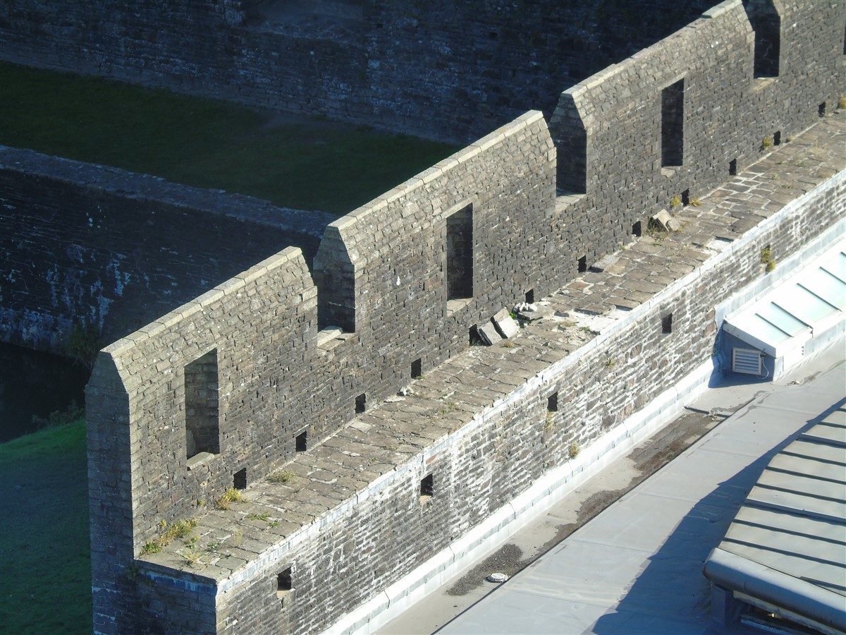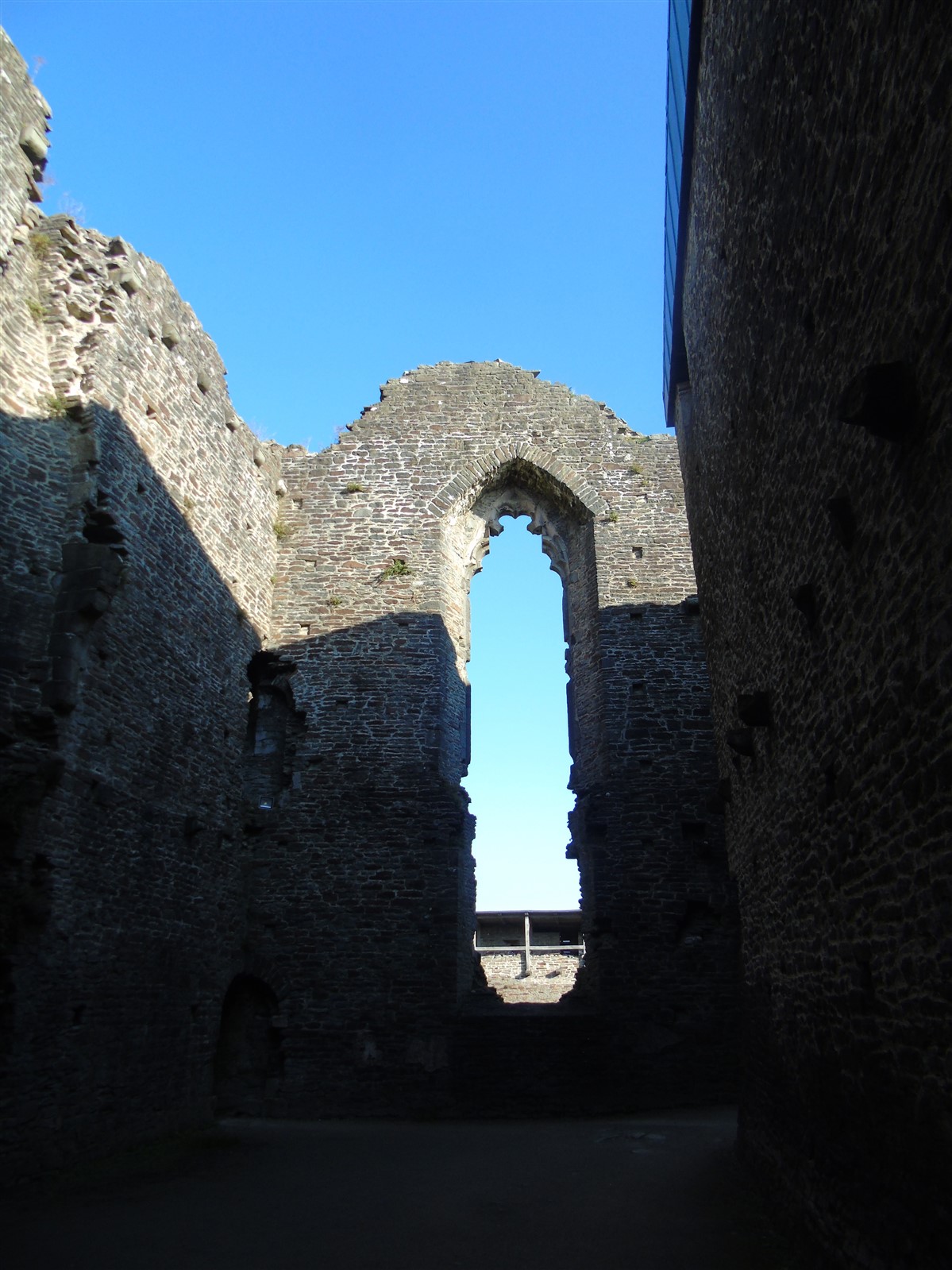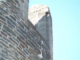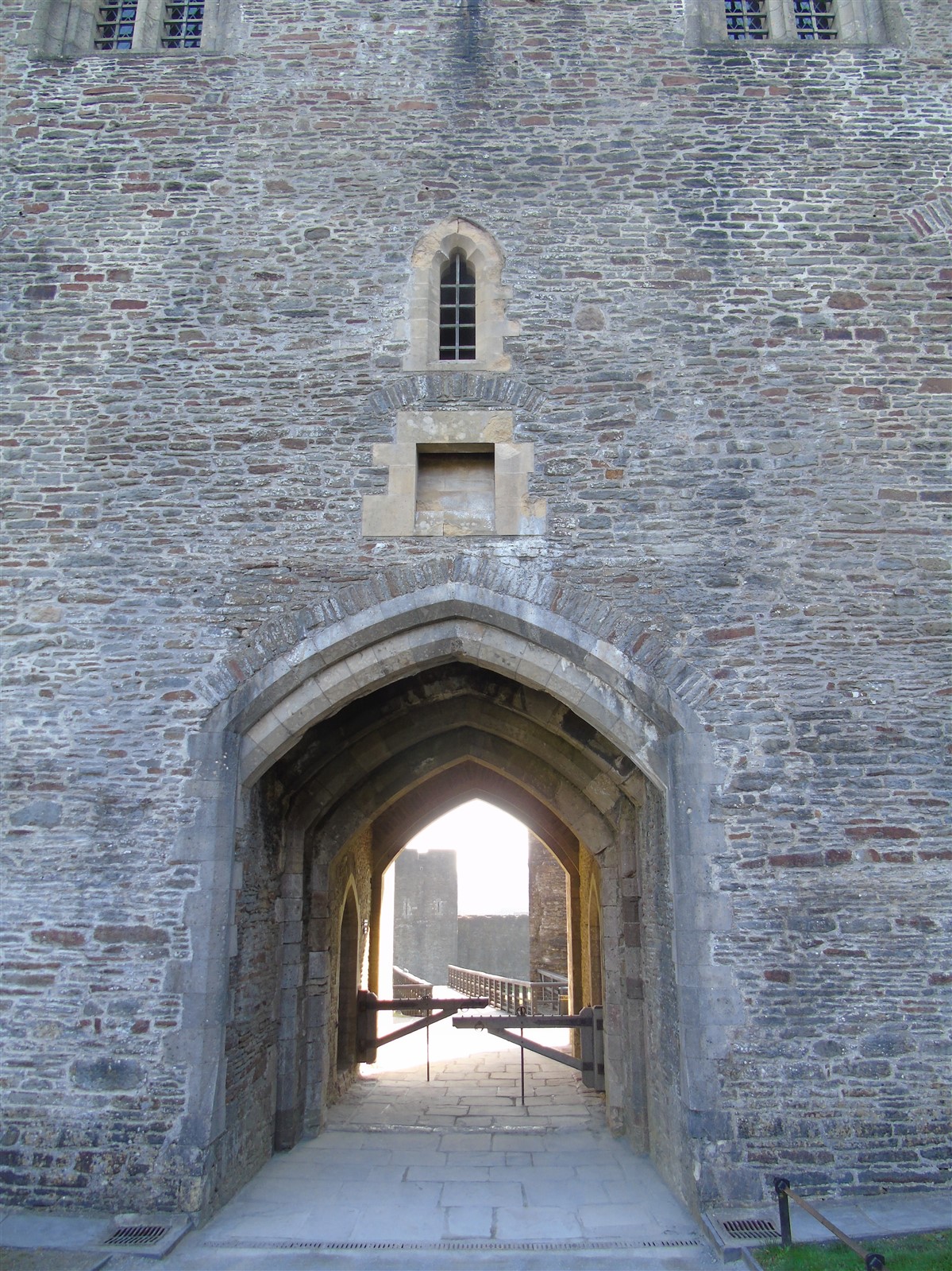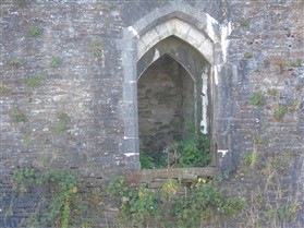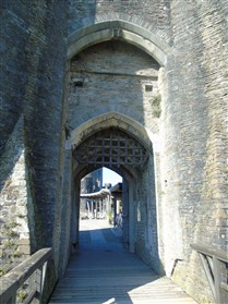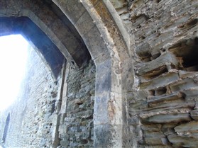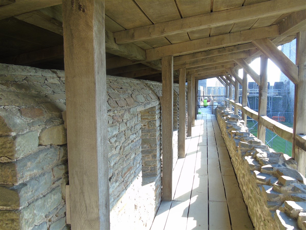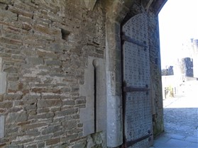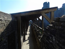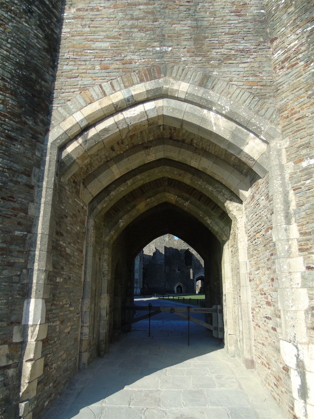 The castle is built upon the principle of concentric fortifications, with an inner ward and middle ward surrounded by a moat, dams, two great lakes and outer defences. The inner and middle wards are rectangular in plan with round angle towers and large twin-towered gatehouses to the E and W. An outer gatehouse to the E forms the main entrance and is flanked by fortifications along the N and S dams. The massive battlemented walls are mainly constructed of local pennant sandstone, with some red sandstone and blue lias limestone. The doorways have shallow pointed arches, and the original structures have trefoil-headed lancet windows and arrow slits with small circles at the base. Dressings are of Sutton stone and the style of mouldings can be related to the chronological development of the castle. The only exception is Despenser's great hall where the dressings are of Jurassic limestone from Bristol. The inner ward is an open courtyard with a well in the centre. The great hall and chambers are to the S, gatehouses to the E and W, and a wall-walk to the N. The great hall is the most highly embellished of all the structures in the castle. The exterior wall, facing into the courtyard, has been refaced in ashlar. It contains 2 pairs of tall 2-light windows with pointed ogee heads and a doorway to the L. Inside the hall, the arched brace roof is late C19. The trusses are supported on the early C14 corbels which consist of 3 long filleted shafts, with bell capitals and stops depicting 3 heads (the King and his courtiers). The corbels and recesses of an earlier roof structure also survive: the corbels are short with roll mouldings. The window reveals are decorated with C14 ball flower ornament. Between the 2 pairs of windows is a large fireplace but the dressings are missing. The E, S, and N walls contain blocked openings showing that the hall was altered in the C13 - 14. To the S of the hall at a high level is a covered vaulted passage (known as the Braose passage) which was originally open. A large infilled archway in the E wall now contains a doorway into a late C20 kitchen. A doorway to its L is original and leads to a room with 2 large fireplaces. To the W, a doorway with broach stops to the jambs leads into 2 large ruined chambers, also much altered: the chambers are irregular in shape, over 2 storeys high, roofless and contain the remains of domestic fireplaces. Tall windows face into the courtyard, mainly ruined, one with the remains of a traceried head in a grey stone dressing. The E gatehouse forms the main entrance to the inner ward and is the most strongly defended structure in the castle. It is a 3-storey block flanked by projecting round towers (the outer face rebuilt in early C20). Central pointed-arched entrance with chamfered dressed jambs. The towers have arrow slits at 5 levels. Small projections to N and S housing doorways leading to wall-walks. Above and flanking the inner doorway, and also to the exterior, are small trefoil-headed lancets. Two large windows to interior 2nd floor, each with 2 trefoiled lights and a quatrefoil. The upper floors of the gatehouse are thought to have been the private apartments of Gilbert de Clare's constable. The 2nd floor is continuous across the gatehouse and has a large fireplace with raked hood on corbels against the W wall. The floor does not survive. Side chamber with quadripartite vault and heavy chamfered ribs. The inner W gatehouse is smaller than the inner E gatehouse but in similar style. It is 2-storey with projecting round towers to the exterior and a flat wall to the interior (E) side. The entrance is flanked by 2 low doorways to the interior side, most of the dressings C20, which provide access to the towers. Two large ruined windows under relieving arches to upper storey. The towers have arrow slits at 4 levels. The lower chambers are vaulted, with heavy ribs supported on bell-shaped capitals. The 1st floor of the gatehouse is open, and has concrete beams on concrete corbels in place of the ceiling. Remains of stairs in N tower. Of the angle-towers of the inner ward, the NW and SW towers stand full-height but were reconstructed in the early C20. They have lancets and arrow slits as in the gatehouses. The upper 2 floors of each tower contained accommodation, whilst the lower floor was for defence purposes and storage. The NW tower has mural stairs to the R of the entrance and a garderobe to the L. The window openings have wide internal splays, shallow pointed heads and occasional window seats. The 2nd floor has a large ornate fireplace with square head and raked hood, partly reconstructed. The 1st floor fireplace is plainer with a flat lintel. The SW tower has lost its floors but an opening leads to the Braose gallery which runs behind the great hall and on to the SE tower. The SE tower is ruined (though part stands full height), and leans outwards at an angle of about 10°. It was not restored by the Bute family so is important for retaining original detail. Very little survives of the NE tower: part of a staircase, the bottom of a window opening, and the base of a door jamb with pyramid stop. A wall-walk runs along the N side of the inner ward and is battlemented with arrow loops. Timber hoarding was reconstructed in the 1990s. Small postern gate in outside of wall at low level. The curtain wall of the middle ward is lower than that of the inner ward. It has bastions in place of angle towers, on which there is a wall-walk. There are gatehouses to the E and W, smaller but similar in style to those of the inner ward. The 2-storey E gatehouse is ruined. The front elevation with projecting round towers survives, but the rear wall (added later) is ruined. Adjoining to the N is a square projection allowing access to the wall-walk; lancets appear to have replaced arrow slits. The W gatehouse has original projecting round towers with arrow slits. The entrance, containing double doors, is within a flat-headed surround, the cornice support