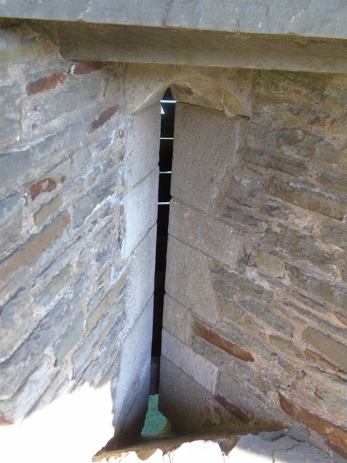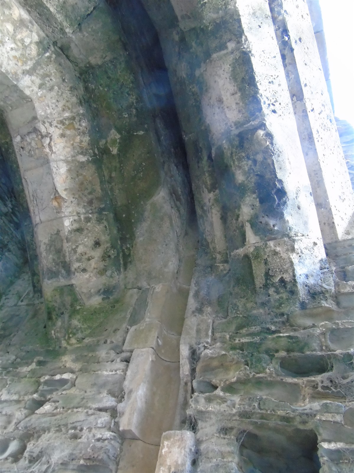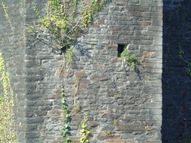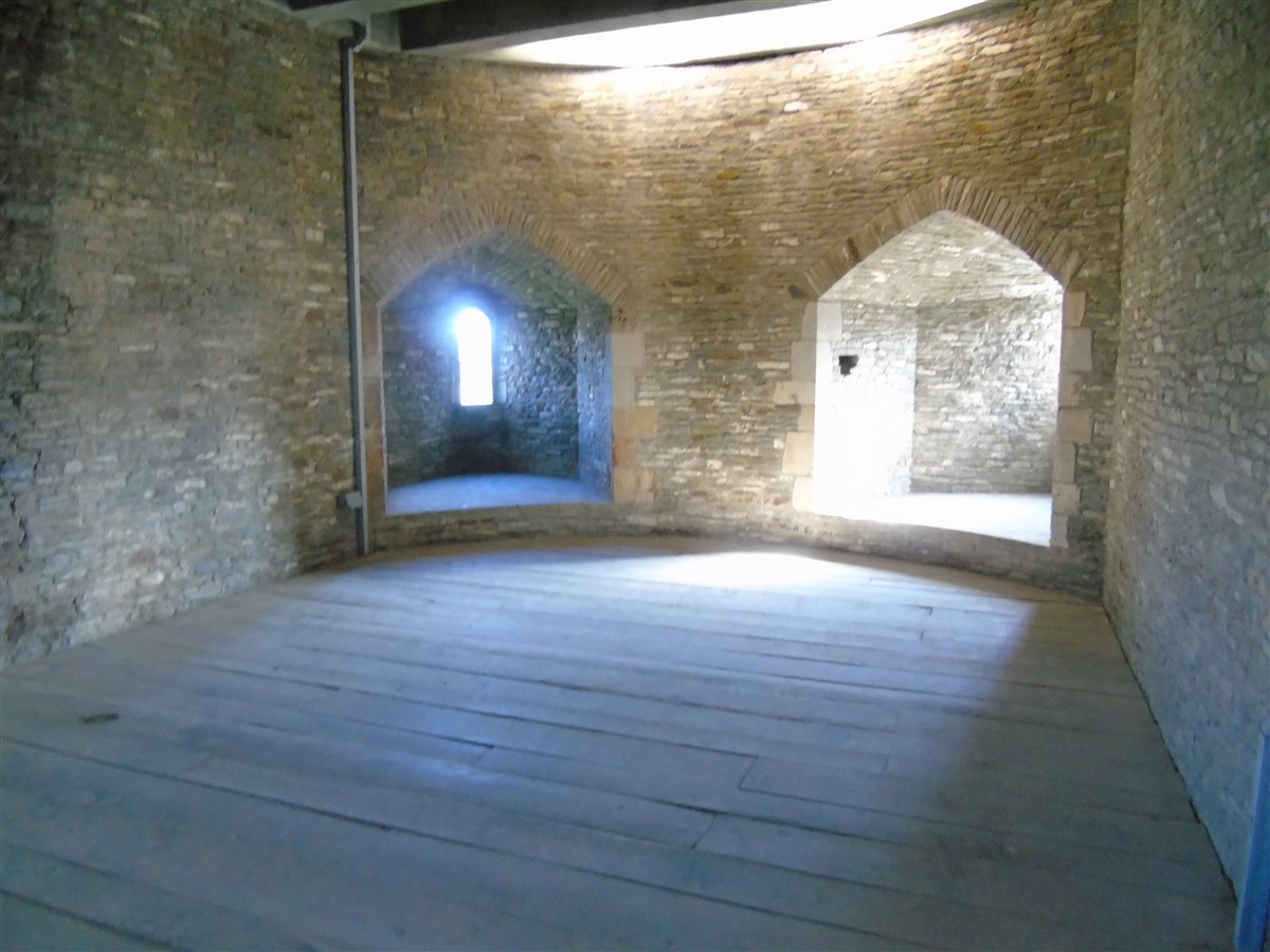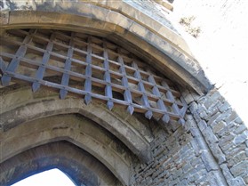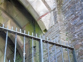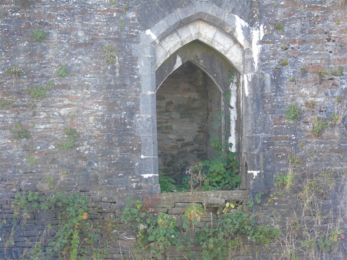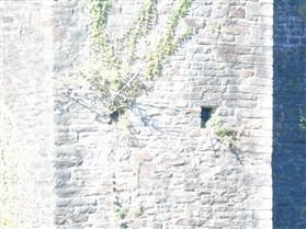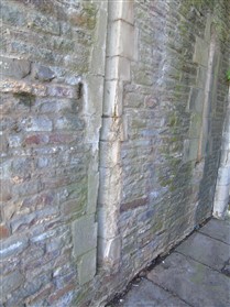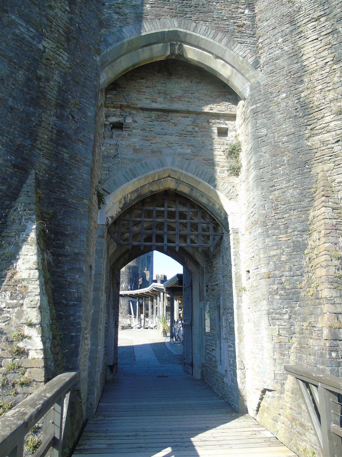 The castle is built upon the principle of concentric fortifications, with an inner ward and middle ward surrounded by a moat, dams, two great lakes and outer defences. The inner and middle wards are rectangular in plan with round angle towers and large twin-towered gatehouses to the E and W. An outer gatehouse to the E forms the main entrance and is flanked by fortifications along the N and S dams. The massive battlemented walls are mainly constructed of local pennant sandstone, with some red sandstone and blue lias limestone. The doorways have shallow pointed arches, and the original structures have trefoil-headed lancet windows and arrow slits with small circles at the base. Dressings are of Sutton stone and the style of mouldings can be related to the chronological development of the castle. The only exception is Despenser's great hall where the dressings are of Jurassic limestone from Bristol. The inner ward is an open courtyard with a well in the centre. The great hall and chambers are to the S, gatehouses to the E and W, and a wall-walk to the N. The great hall is the most highly embellished of all the structures in the castle. The exterior wall, facing into the courtyard, has been refaced in ashlar. It contains 2 pairs of tall 2-light windows with pointed ogee heads and a doorway to the L. Inside the hall, the arched brace roof is late C19. The trusses are supported on the early C14 corbels which consist of 3 long filleted shafts, with bell capitals and stops depicting 3 heads (the King and his courtiers). The corbels and recesses of an earlier roof structure also survive: the corbels are short with roll mouldings. The window reveals are decorated with C14 ball flower ornament. Between the 2 pairs of windows is a large fireplace but the dressings are missing. The E, S, and N walls contain blocked openings showing that the hall was altered in the C13 - 14. To the S of the hall at a high level is a covered vaulted passage (known as the Braose passage) which was originally open. A large infilled archway in the E wall now contains a doorway into a late C20 kitchen. A doorway to its L is original and leads to a room with 2 large fireplaces. To the W, a doorway with broach stops to the jambs leads into 2 large ruined chambers, also much altered: the chambers are irregular in shape, over 2 storeys high, roofless and contain the remains of domestic fireplaces. Tall windows face into the courtyard, mainly ruined, one with the remains of a traceried head in a grey stone dressing. The E gatehouse forms the main entrance to the inner ward and is the most strongly defended structure in the castle. It is a 3-storey block flanked by projecting round towers (the outer face rebuilt in early C20). Central pointed-arched entrance with chamfered dressed jambs. The towers have arrow slits at 5 levels. Small projections to N and S housing doorways leading to wall-walks. Above and flanking the inner doorway, and also to the exterior, are small trefoil-headed lancets. Two large windows to interior 2nd floor, each with 2 trefoiled lights and a quatrefoil. The upper floors of the gatehouse are thought to have been the private apartments of Gilbert de Clare's constable. The 2nd floor is continuous across the gatehouse and has a large fireplace with raked hood on corbels against the W wall. The floor does not survive. Side chamber with quadripartite vault and heavy chamfered ribs. The inner W gatehouse is smaller than the inner E gatehouse but in similar style. It is 2-storey with projecting round towers to the exterior and a flat wall to the interior (E) side. The entrance is flanked by 2 low doorways to the interior side, most of the dressings C20, which provide access to the towers. Two large ruined windows under relieving arches to upper storey. The towers have arrow slits at 4 levels. The lower chambers are vaulted, with heavy ribs supported on bell-shaped capitals. The 1st floor of the gatehouse is open, and has concrete beams on concrete corbels in place of the ceiling. Remains of stairs in N tower. Of the angle-towers of the inner ward, the NW and SW towers stand full-height but were reconstructed in the early C20. They have lancets and arrow slits as in the gatehouses. The upper 2 floors of each tower contained accommodation, whilst the lower floor was for defence purposes and storage. The NW tower has mural stairs to the R of the entrance and a garderobe to the L. The window openings have wide internal splays, shallow pointed heads and occasional window seats. The 2nd floor has a large ornate fireplace with square head and raked hood, partly reconstructed. The 1st floor fireplace is plainer with a flat lintel. The SW tower has lost its floors but an opening leads to the Braose gallery which runs behind the great hall and on to the SE tower. The SE tower is ruined (though part stands full height), and leans outwards at an angle of about 10°. It was not restored by the Bute family so is important for retaining original detail. Very little survives of the NE tower: part of a staircase, the bottom of a window opening, and the base of a door jamb with pyramid stop. A wall-walk runs along the N side of the inner ward and is battlemented with arrow loops. Timber hoarding was reconstructed in the 1990s. Small postern gate in outside of wall at low level. The curtain wall of the middle ward is lower than that of the inner ward. It has bastions in place of angle towers, on which there is a wall-walk. There are gatehouses to the E and W, smaller but similar in style to those of the inner ward. The 2-storey E gatehouse is ruined. The front elevation with projecting round towers survives, but the rear wall (added later) is ruined. Adjoining to the N is a square projection allowing access to the wall-walk; lancets appear to have replaced arrow slits. The W gatehouse has original projecting round towers with arrow slits. The entrance, containing double doors, is within a flat-headed surround, the cornice support
