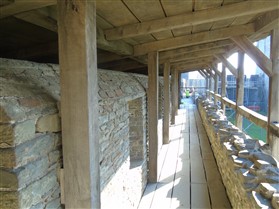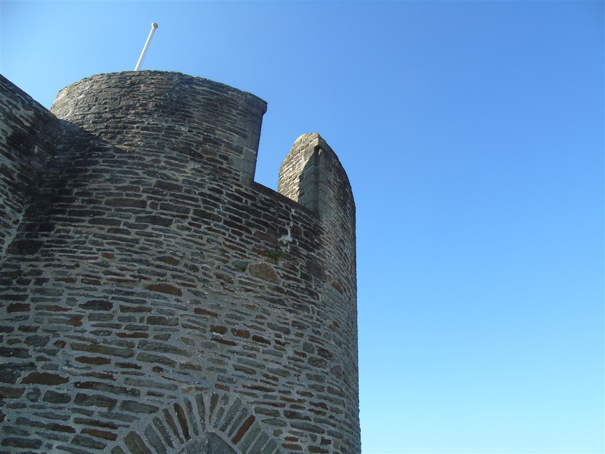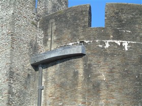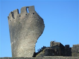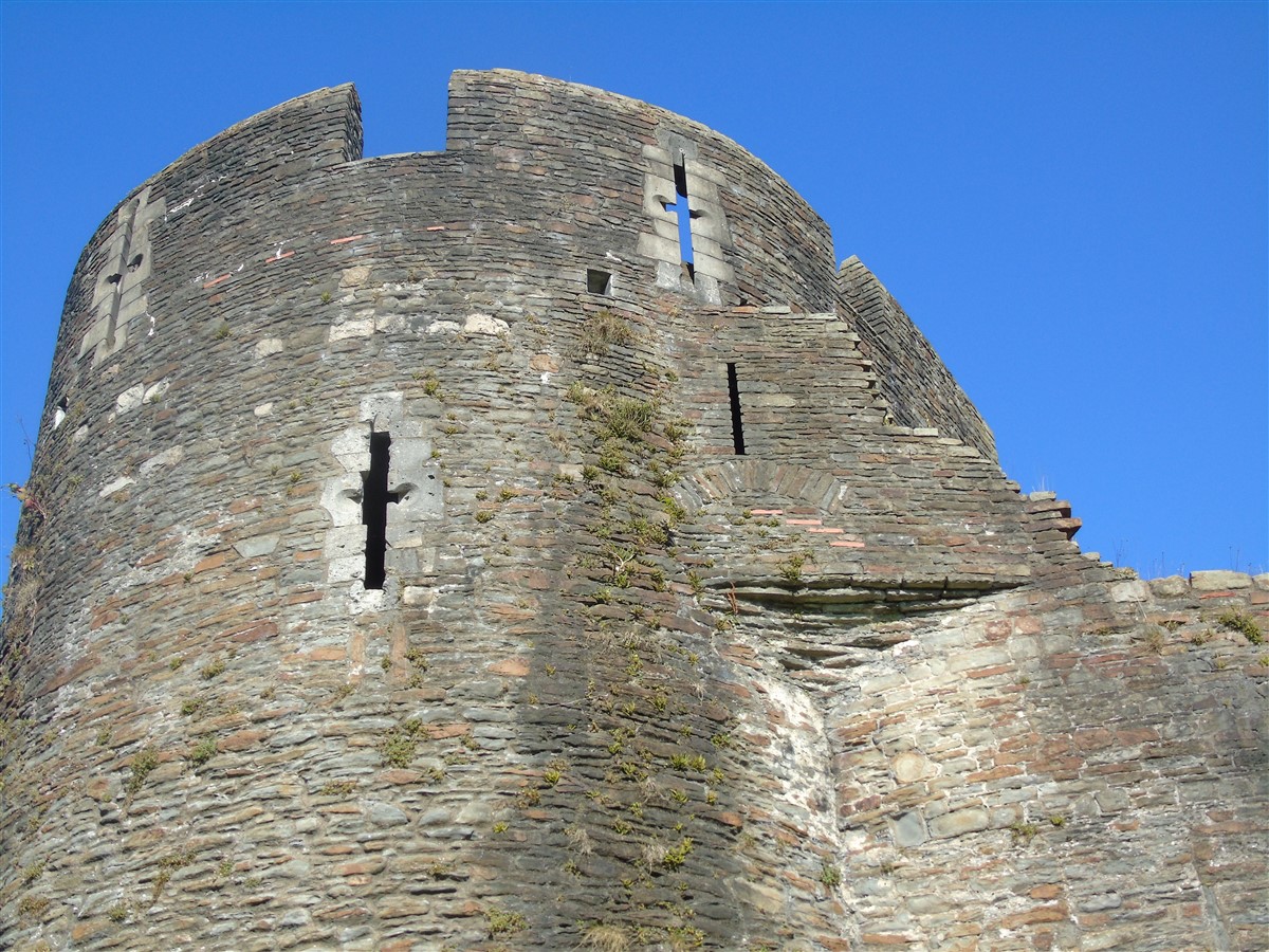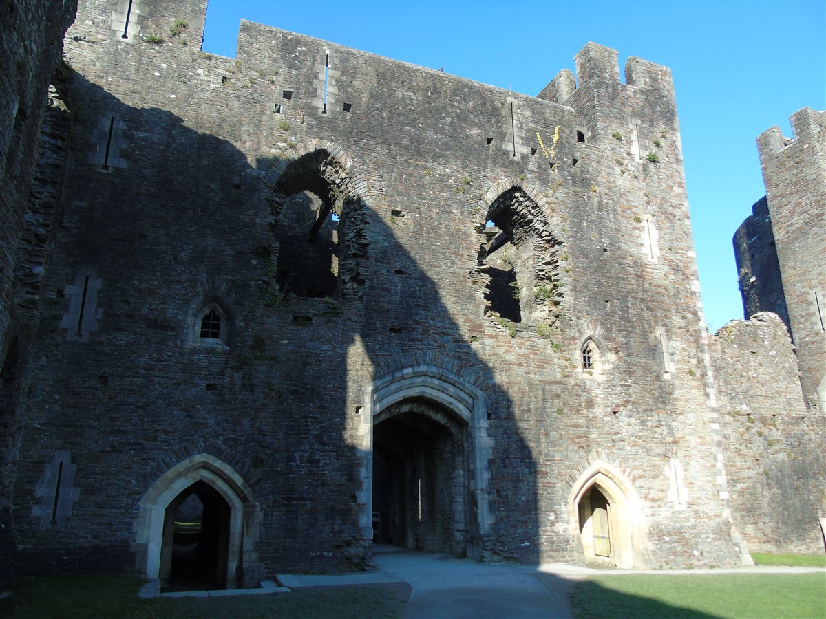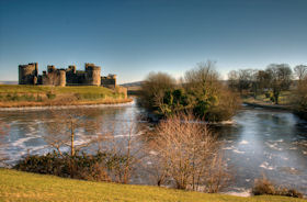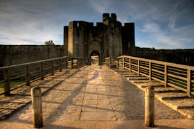 Caerphilly Castle is an imposing medieval fortress mirrored in the waters of its placid lakes. It was built amid alarms and excursions by the lords of Glamorgan following their annexation of upland Senghenydd in 1267 and was completed by 1290. It was associated with a borough and a vast deer park enclosing the Aber valley 3.0km to the north-west. The castle was in decline by the fifteenth century and it was ruinous by the earlier sixteenth. Nevertheless it was probably put into a state of defence in the mid seventeenth century when a great bastion or redoubt was raised to guard its north-western side. A major campaign of restoration and reconstruction was carried out in 1928-39. Since then the castle has been taken into state care and its lakes have been reflooded. The castle consists of a great walled central court with tall round towers at each corner and huge twin-towered gatehouses on the east and west sides. Within is a magnificent earlier fourteenth century great hall and other grand apartments. The court is set within a concentric walled platform that rises from the waters of the lakes. These are held back by a massive fortified embankment on the east side that presents an unparalelled 280m long array of walls, towers and bastions towards the town. A corn mill is set within this area. There is a further walled platform on the west side of the castle. (Coflein–ref. RCAHMW, 2000 and Renn, 1997)