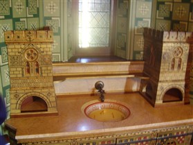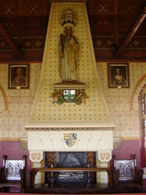 Burges' reconstruction was based on this evidence and also used medieval illuminated manuscripts and current antiquarian research. The building was designed for 'occasional occupation in the summer'. Burges died 1881 but team of craftsmen headed by J S Chapple - Burges' assistant - and William Frame continued work for another 10 years to complete the project, though the building was little used. Burges' stone tiles replaced in 1972 by slates. As well as work by Chapple and Frame, polychrome statuary was designed by Ceccardo Fucigna (the Virgin) and Thomas Nicholls (St Lucius and overmantels); stencilled painting designed by H W Lonsdale and executed by Campbell Smith.