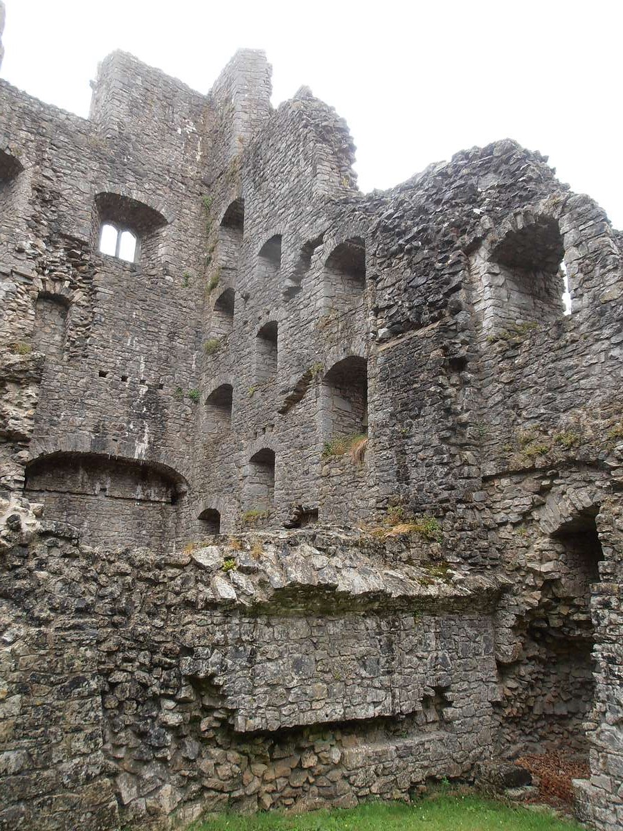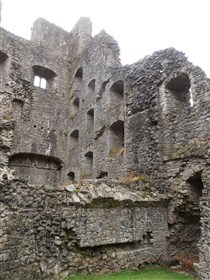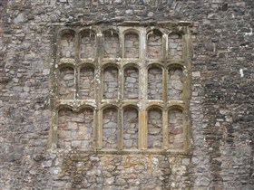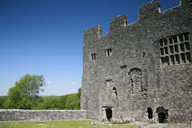 The castle courtyard is entered at the south-west side by a small gateway between blind rounded piers across which a high arch spans. The gateway contains a four-centred arch with sunk spandrels in local Sutton stone and above that a square sunken armorial panel (Mansel quartered with Penrice and Scurlage) including the initials of Rice Mansel, in oolitic limestone. The high arch is slightly chamfered at the front and there is a machicolation-slot at its rear and a parapet walk as if for defence of the gate. To the right of the entrance is a semicircular tower, with two small Tudor windows; a similar tower probably existed originally to the left of the gate to complete the symmetry. The masonry apart from the carved work is local rubble or axe-dressed work, with many surviving putlog holes. The courtyard is square, with a low modern wall to the north-west side returning to the south-west side up to the entrance. Only part of the courtyard is paved. The more impressive part is the north-east range, surviving to almost eaves height on the side facing the courtyard but reduced to the level of the undercroft vaults on the outer side and internally. Local limestone rubble with sandstone stone dressings to openings. In front is the exposed foundation of the staircase building which gave access to the Great Hall. Five windows of the Long Gallery survive partially at the top, occupying the full length of the range. One window of the hall remains, its rear walled up; it consists of three tiers of diminishing lights, with thicker and thinner mullions dividing it horizontally into three groups of two lights. Above it is a relieving arch in the common masonry. To the right of this is an area of walling with a similar relieving arch, and the surviving jamb of a similar window but of four tiers in height, the latter window fully walled up. Beneath these to left is the hall doorway, now walled up, with a segmental arch. To the left is an area of four common storeys (not counting the Long Gallery) with three surviving two-light Tudor windows on the front elevation (one walled up). Ten small windows in what remains of the return north-west elevation, vertically staggered as some were lights to staircase landings. There is a Tudor arched undercroft entrance to the left of the site of the stairs block in the yard elevation, and two segmental-headed undercroft windows to the right, one walled up; square-headed doorway adjacent to the south block, slightly angled. There were three tower-like projections on the north-east side. To the south-east side of the courtyard is the lower range, consisting now of a two-storey four-window range, slate roofed. Restored Tudor windows above, three of four lights and one of two; label moulds with saltire terminations. One similar two-light Tudor window to the ground storey, but with no label, at the right; four-centred door arch beside this; three sash windows and a modern entrance with porch. The sash windows are in old openings, over which there are label moulds with saltire terminations. This block has a gable elevation to the south-west showing a two-light Tudor window with label in the attic, and a sash window below at first storey. Lateral chimneys and small rear wing (formerly a bakehouse) with end-chimney. The south-east elevation of the east tower has six storeys of Tudor windows with label moulds, of one or two lights with mullions and in some cases transoms. The architectural dress of this sun-lit elevation shows that it was to be seen to good effect from Oxwich Bay. The north-east elevation of the latter block has similar windows but without labels. (Listed Building Report)